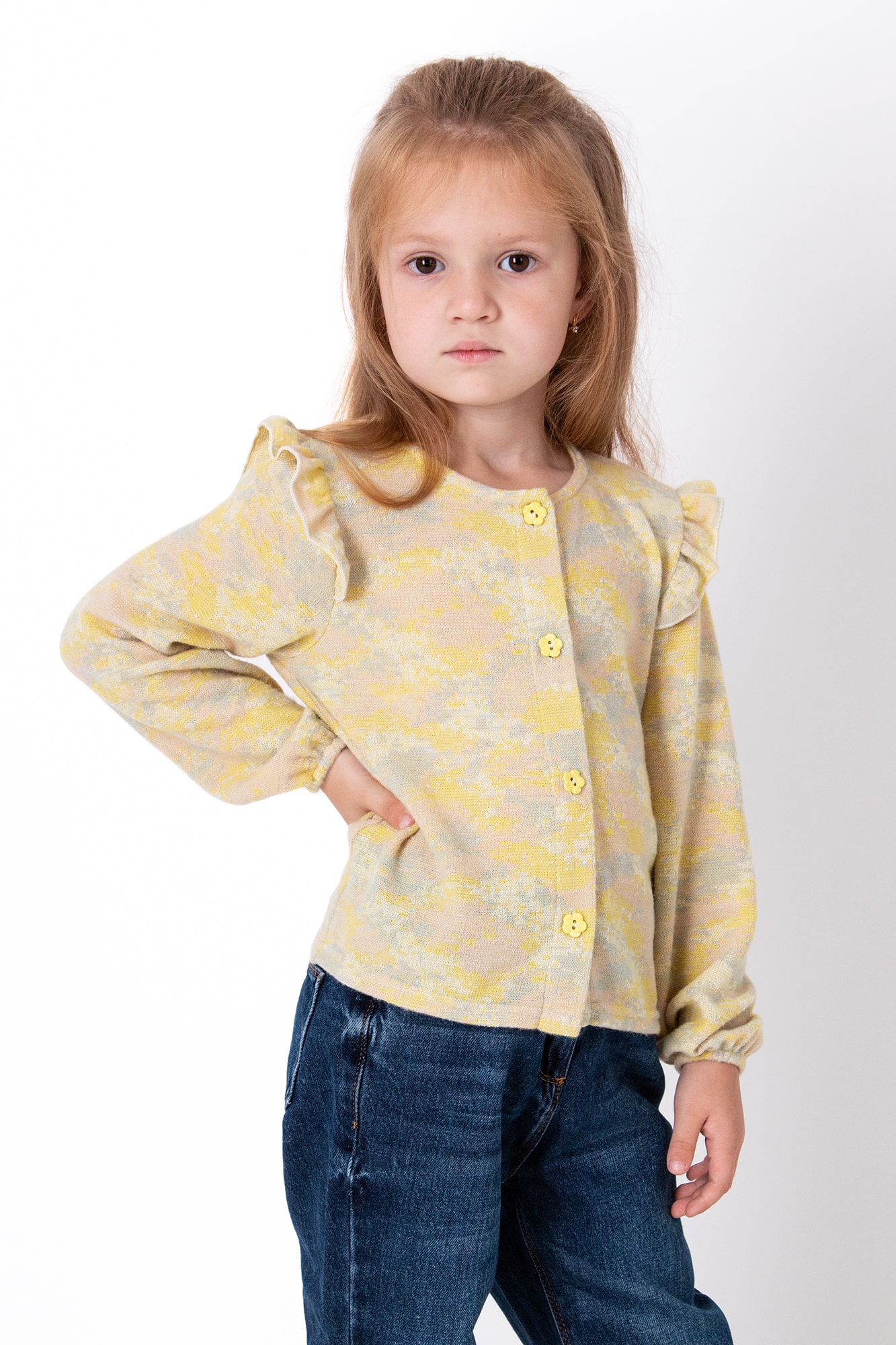 Кофта з м’якого трикотажу з абстрактним візерунком та ніжною фактурою. Декор у вигляді рюші на плечах додає образу виразності, а гудзики-квіточки — стильний акцент. Універсальна модель, яка легко поєднується з спідницями чи брюками.