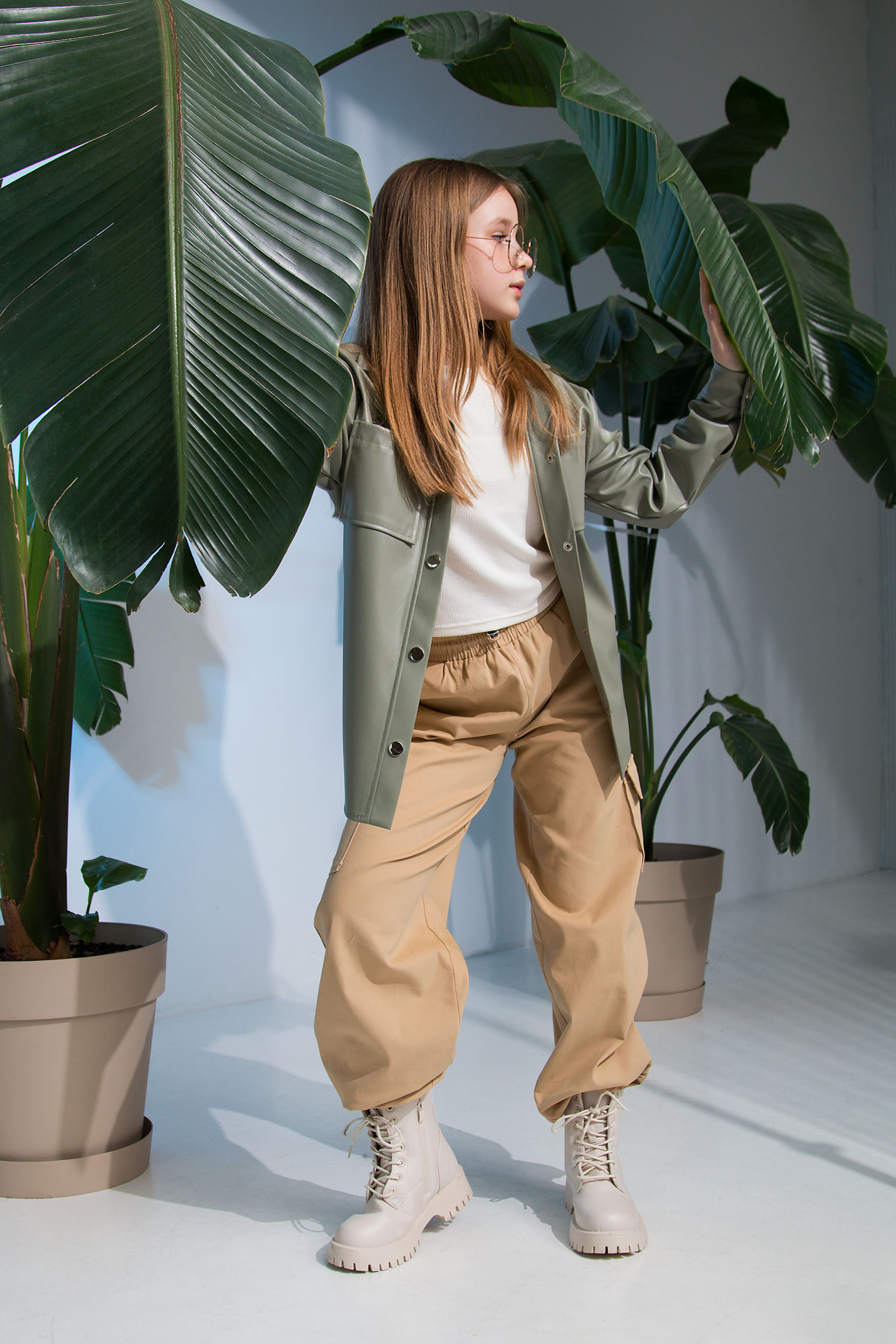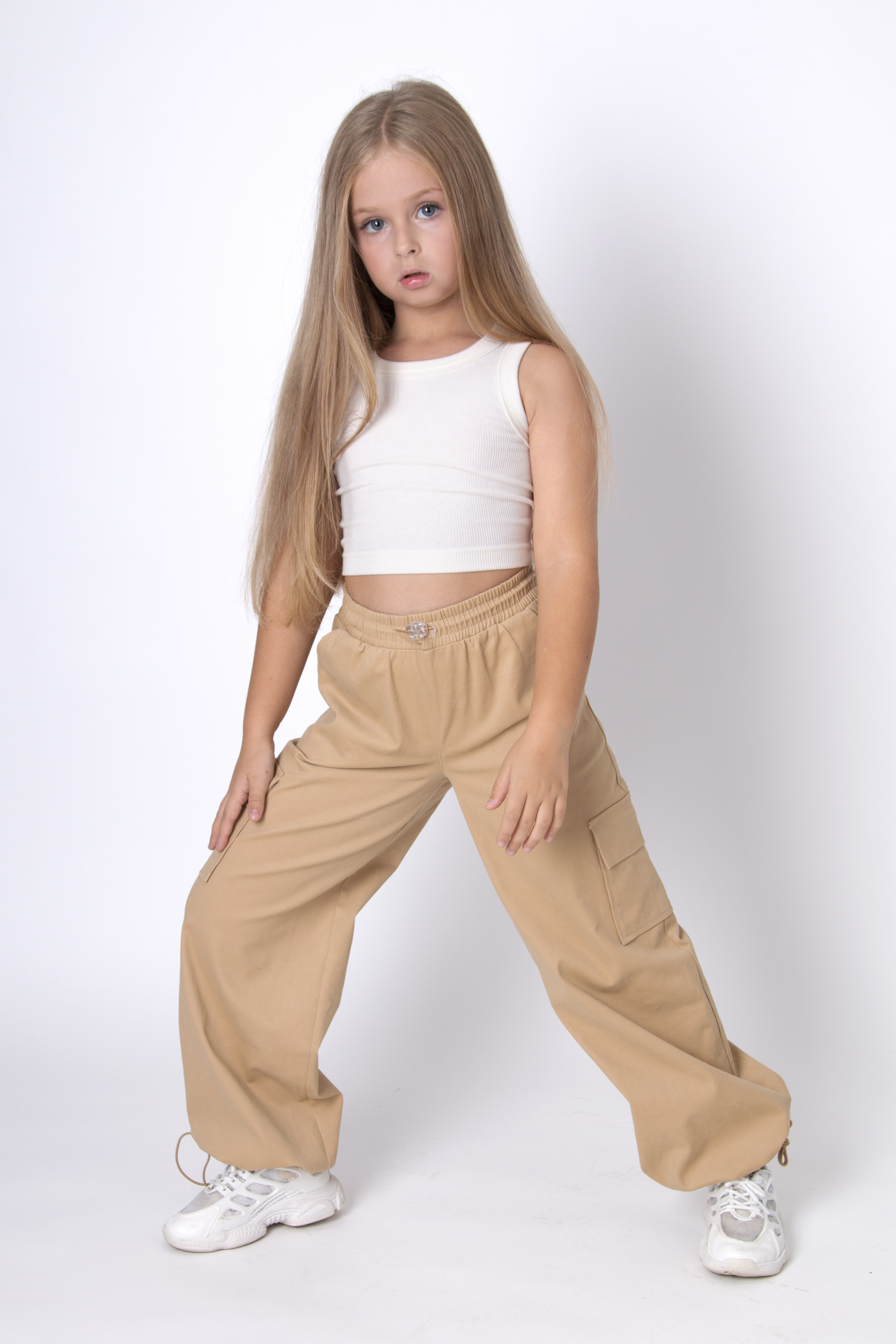 Штани-карго з широкими штанинами, зручним поясом на резинці та накладними кишенями з боків. Модель виконана з щільної тканини, яка тримає форму та виглядає стильно в повсякденних образах. Знизу є затяжки , що дозволяють носити як завʼязаними так і розвʼязаними .