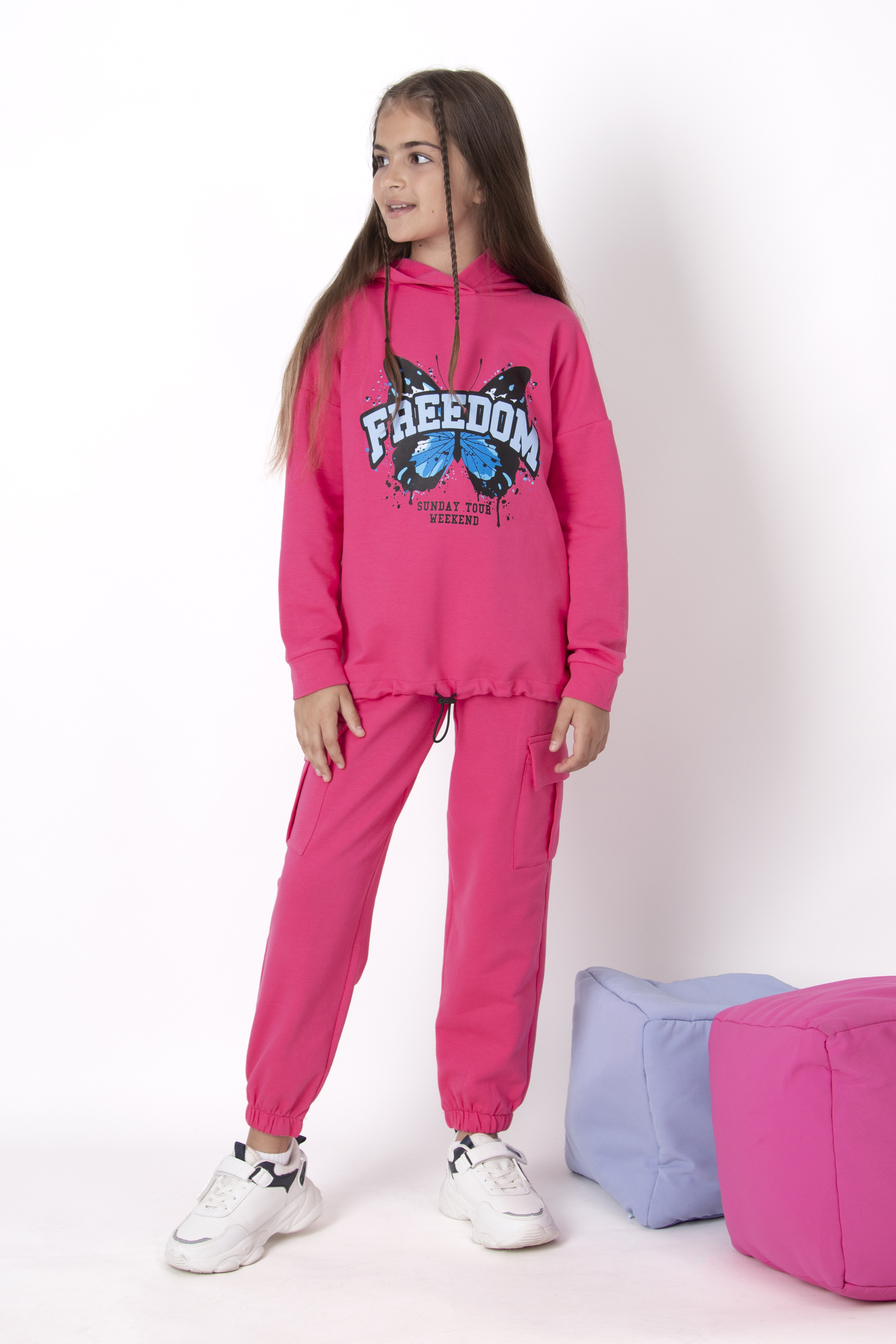 Спортивний костюм з двухнитки на тонкому флісі з яскравим принтом на худі. Худі по низу стягується на резинці. Штани з накладними кишенями по боках доповнені манжетами. Динамічний і стильний образ.
