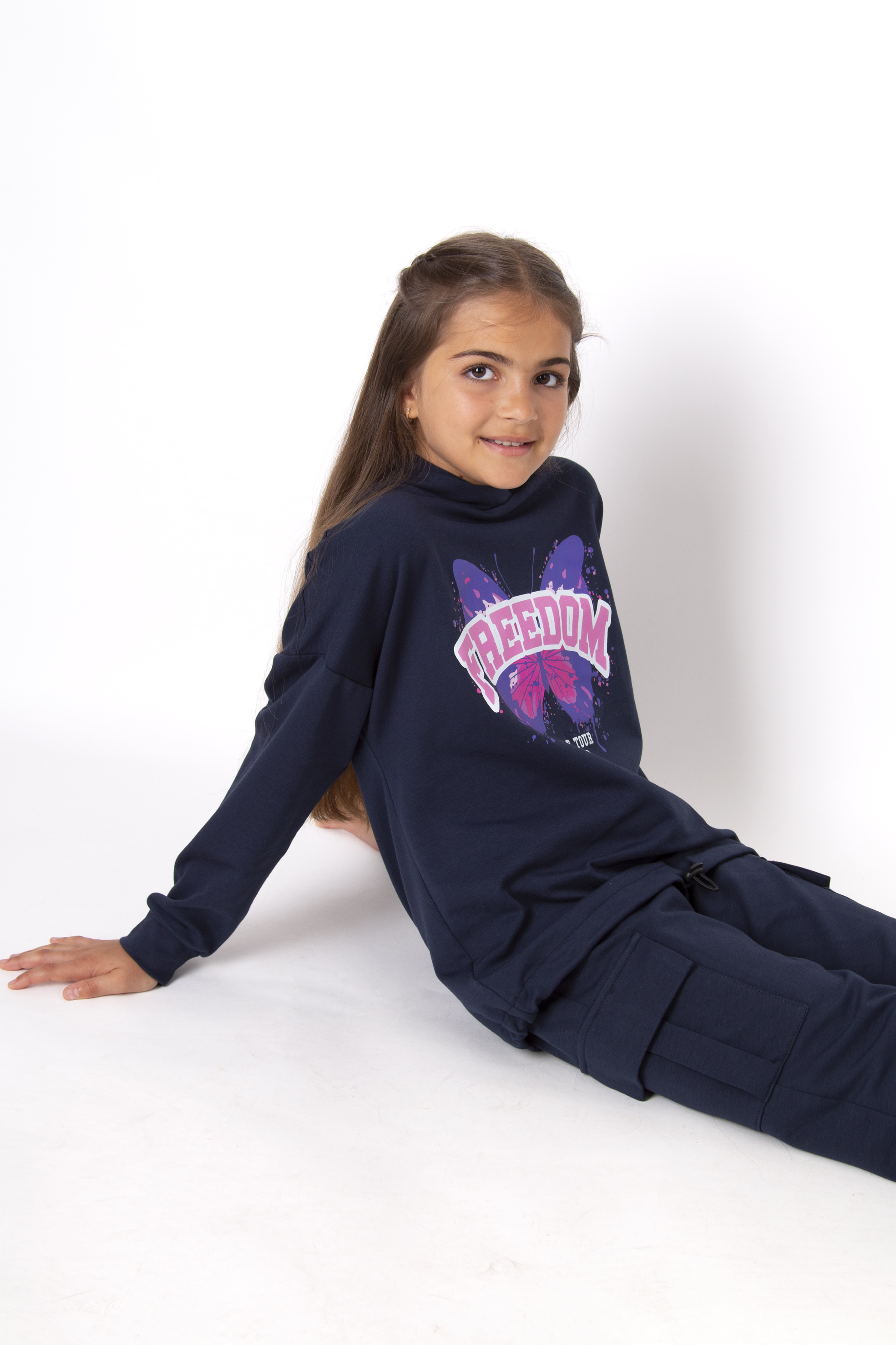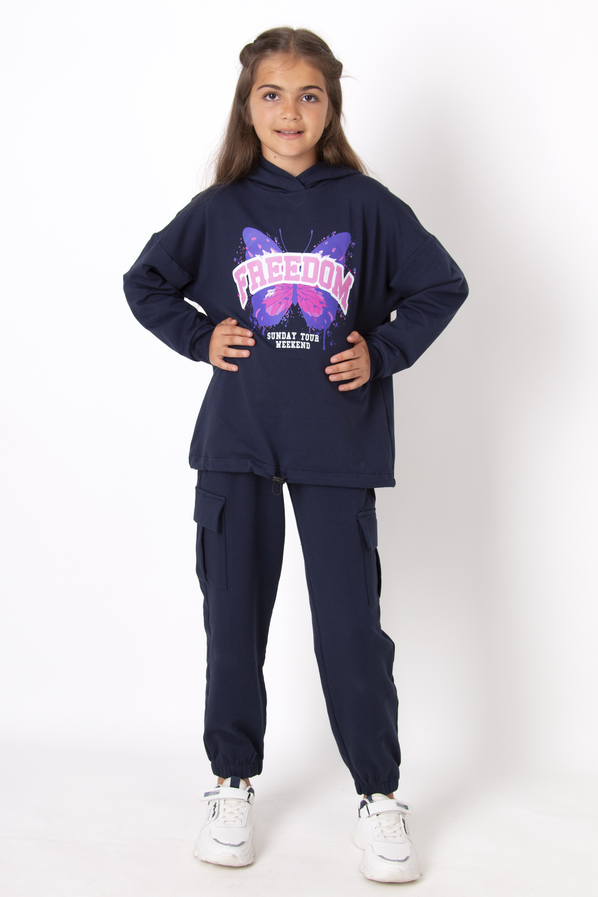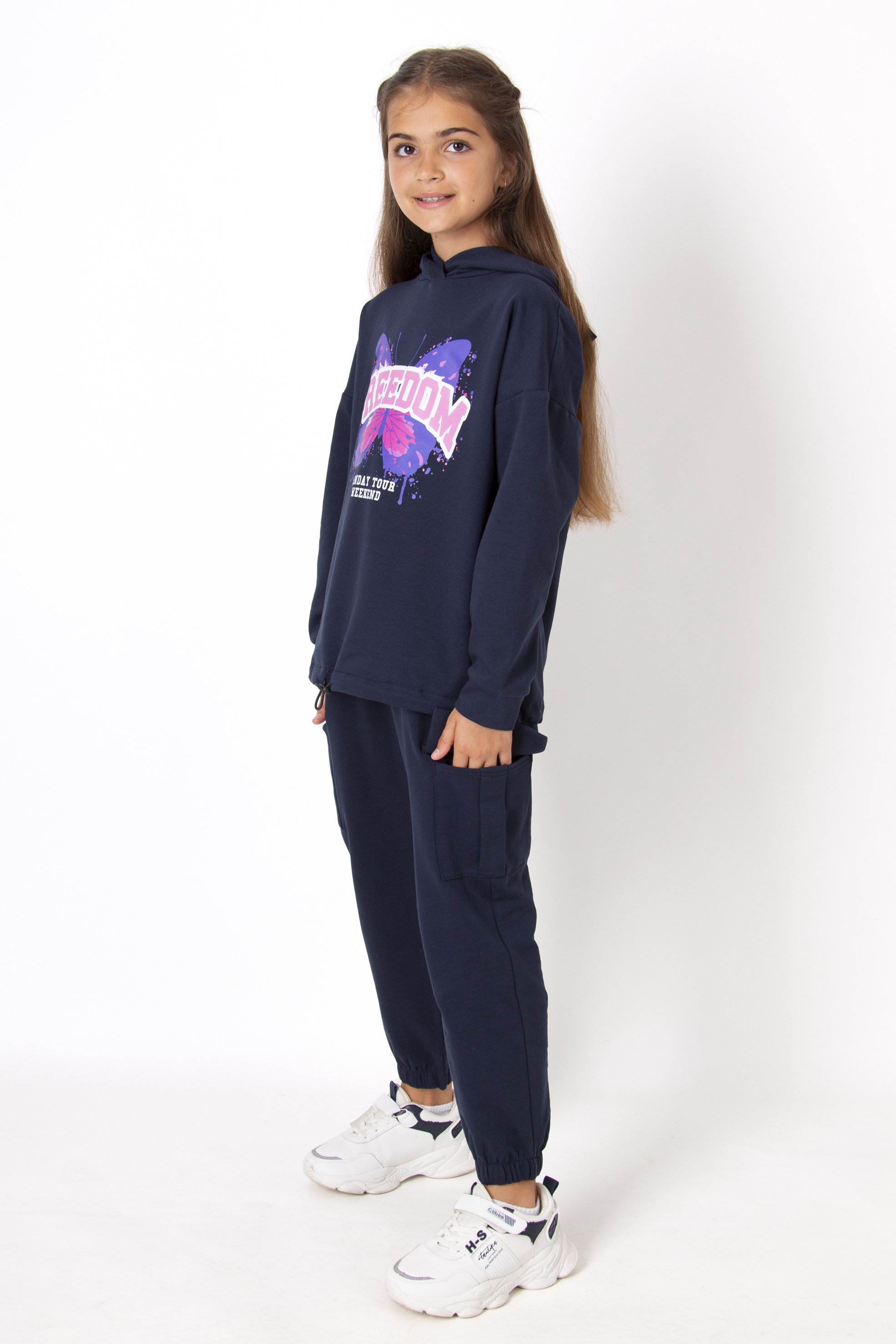 Спортивний костюм з двухнитки на тонкому флісі з яскравим принтом на худі. Худі по низу стягується на резинці. Штани з накладними кишенями по боках доповнені манжетами. Динамічний і стильний образ.