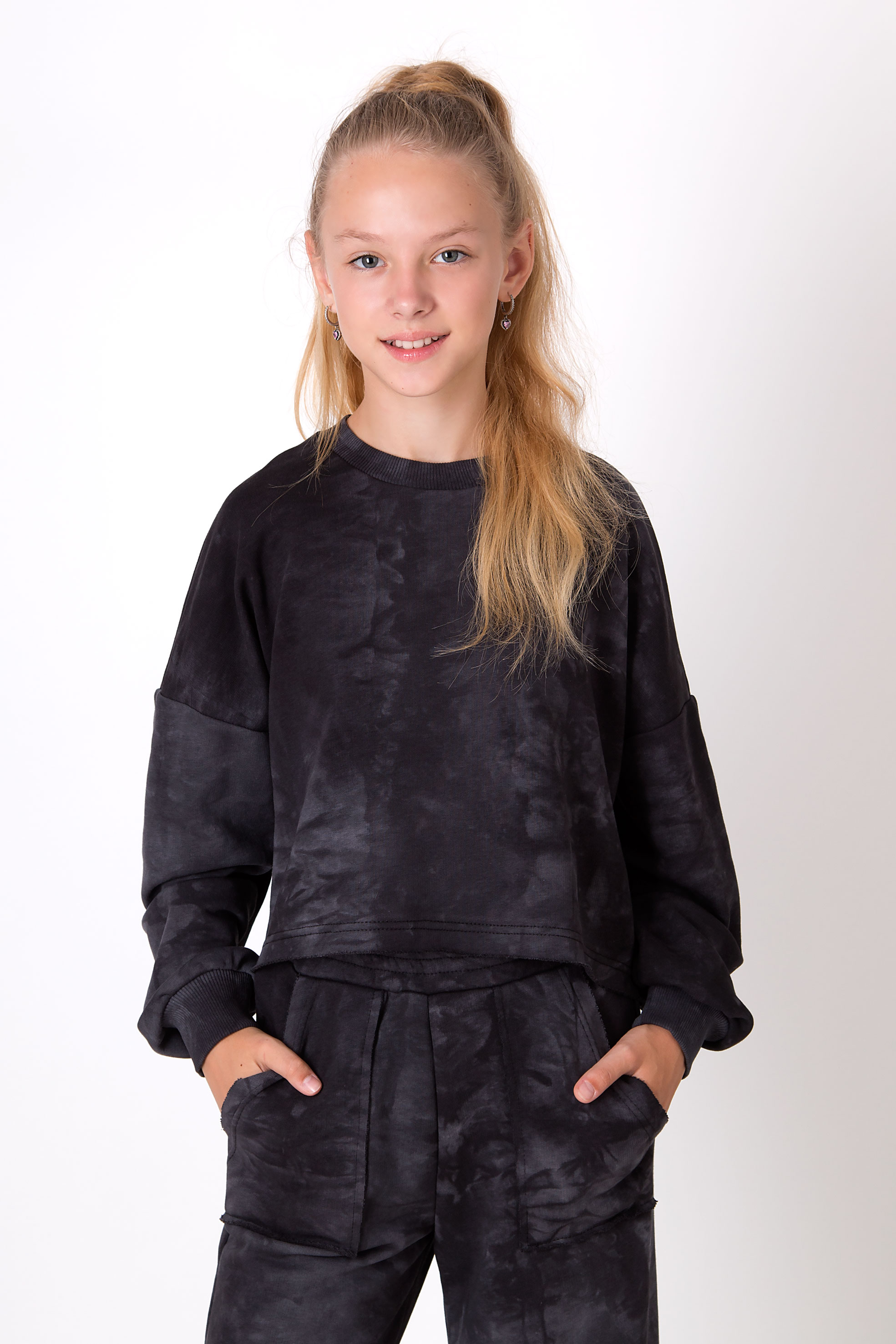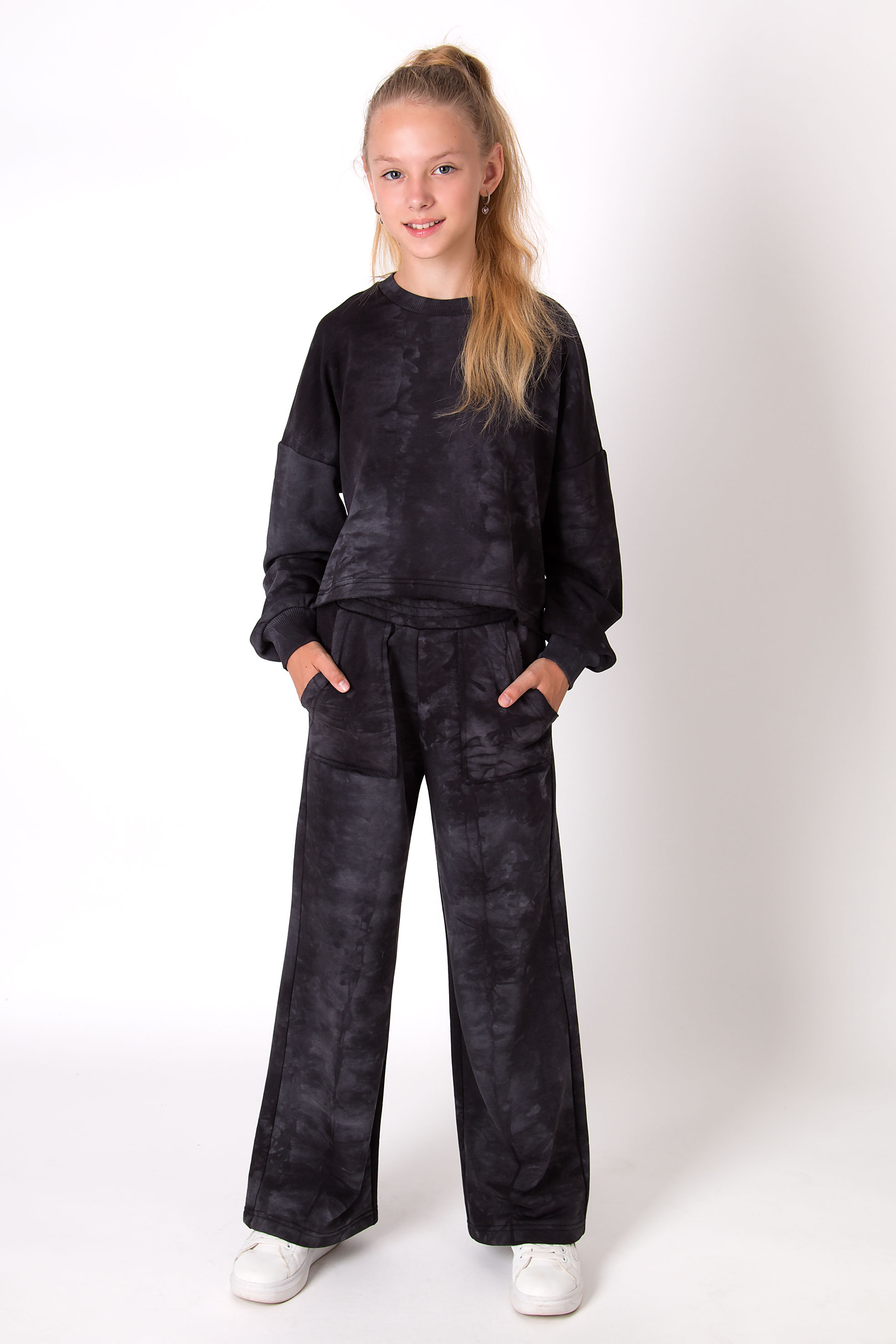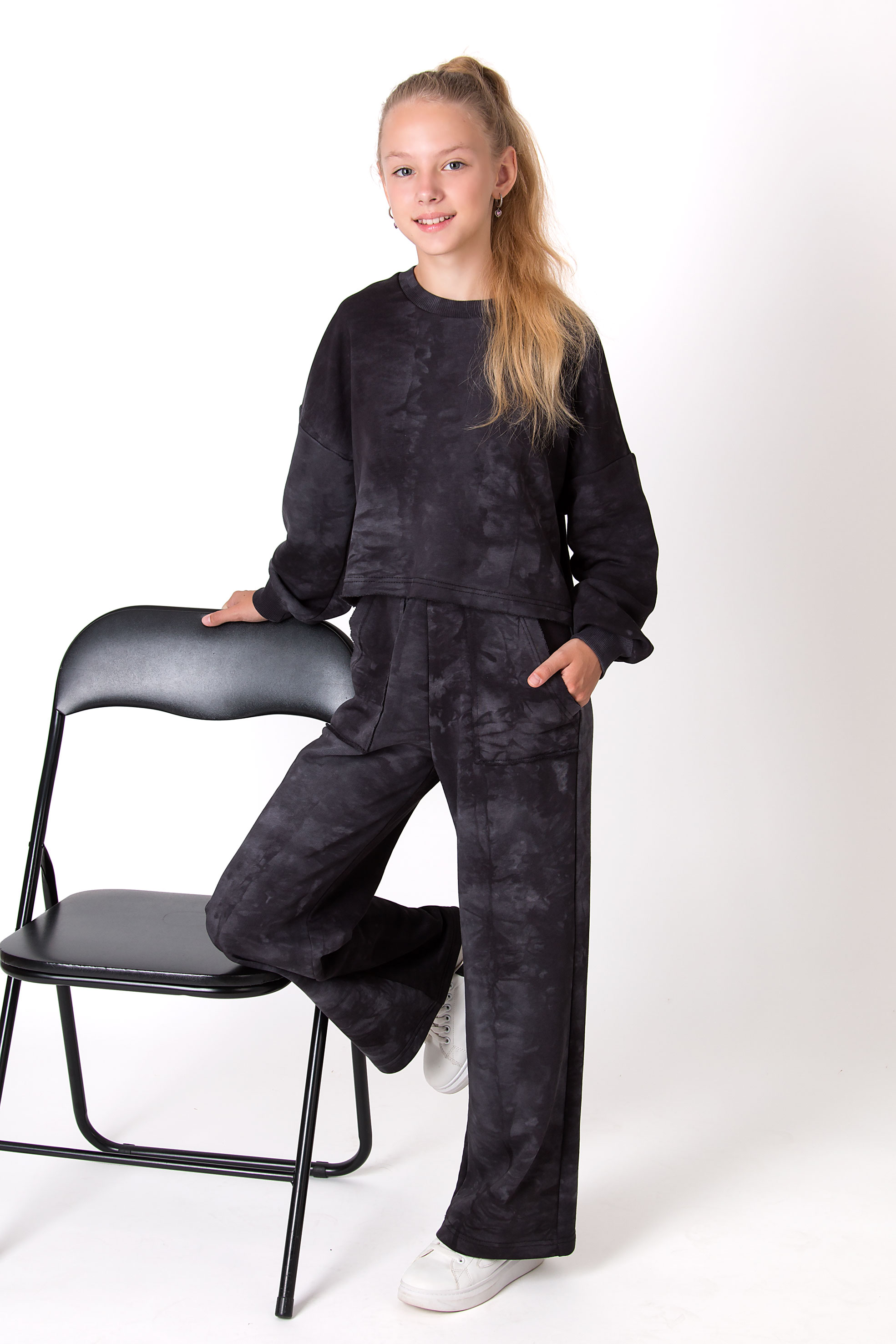 Костюм із трикотажу тринитка петлі з ефектом тай-дай. Складається зі світшота вільного крою та штанів із накладними кишенями. Пояс на еластичній резинці забезпечує зручну посадку. Стильний і сучасний варіант.
