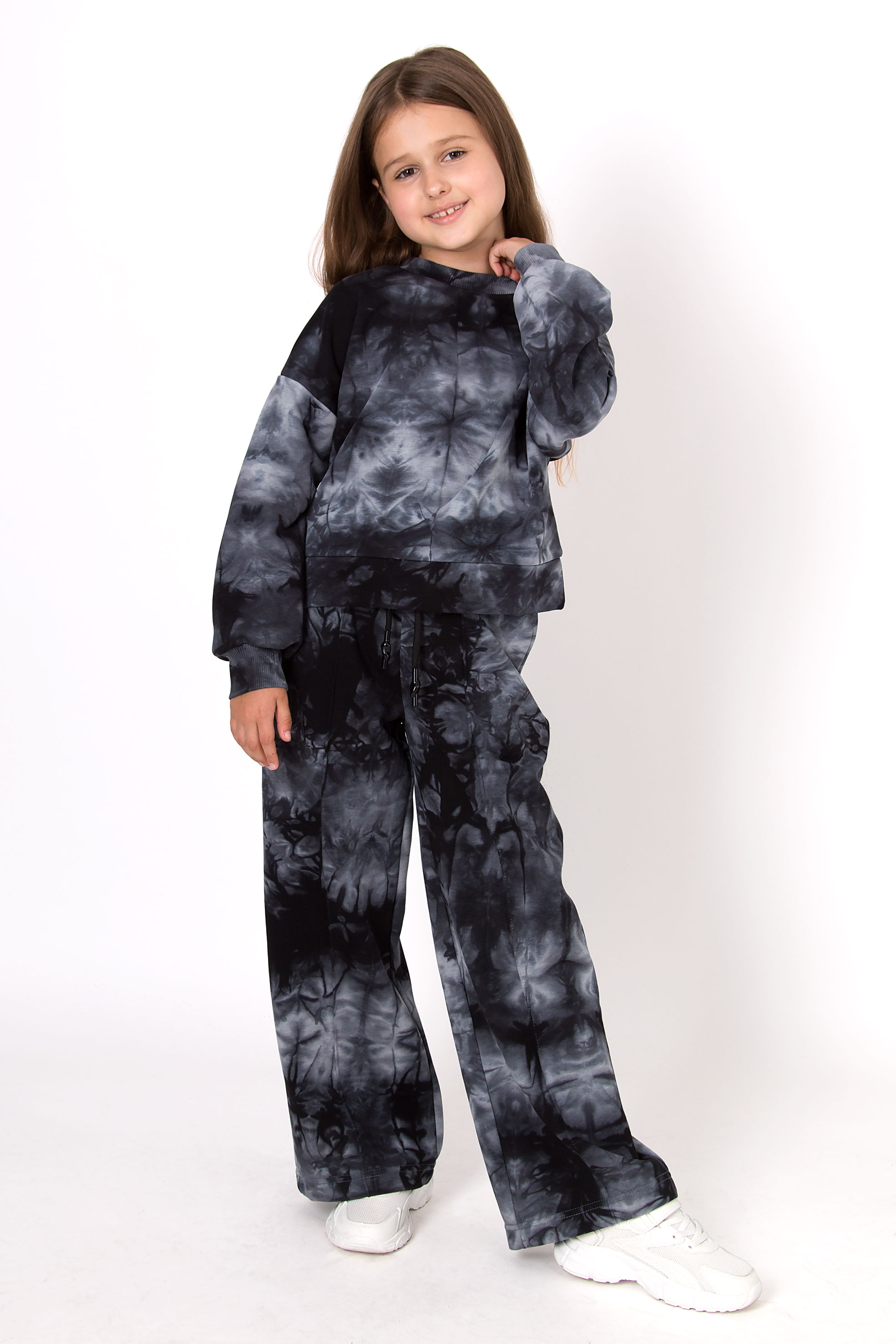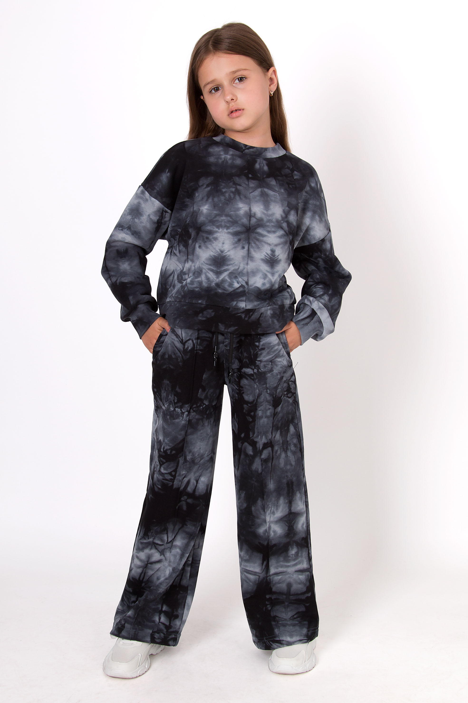 Костюм із трикотажу тринитка петлі з ефектом тай-дай. Складається зі світшота вільного крою та штанів із накладними кишенями. Пояс на еластичній резинці забезпечує зручну посадку. Стильний і сучасний варіант.