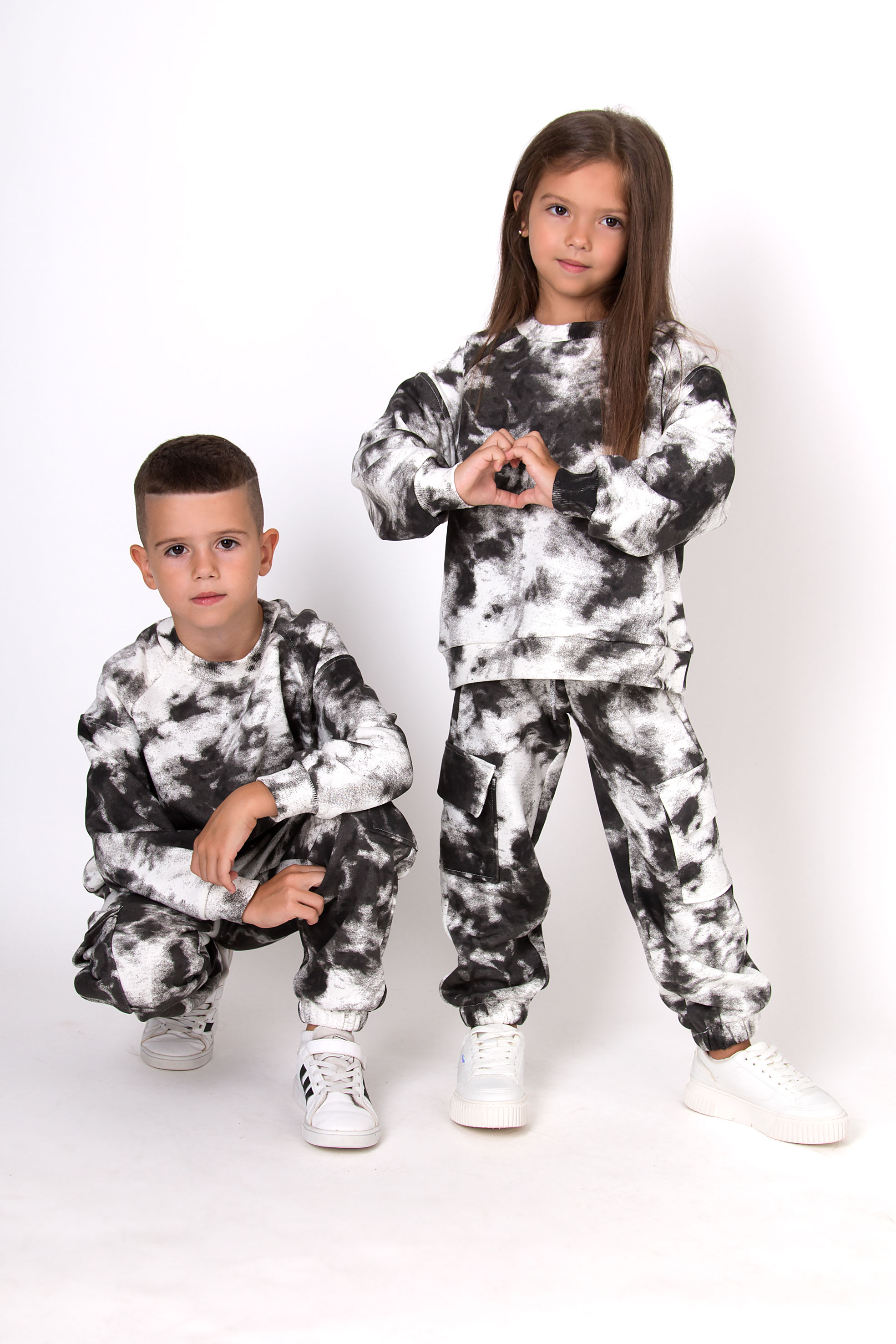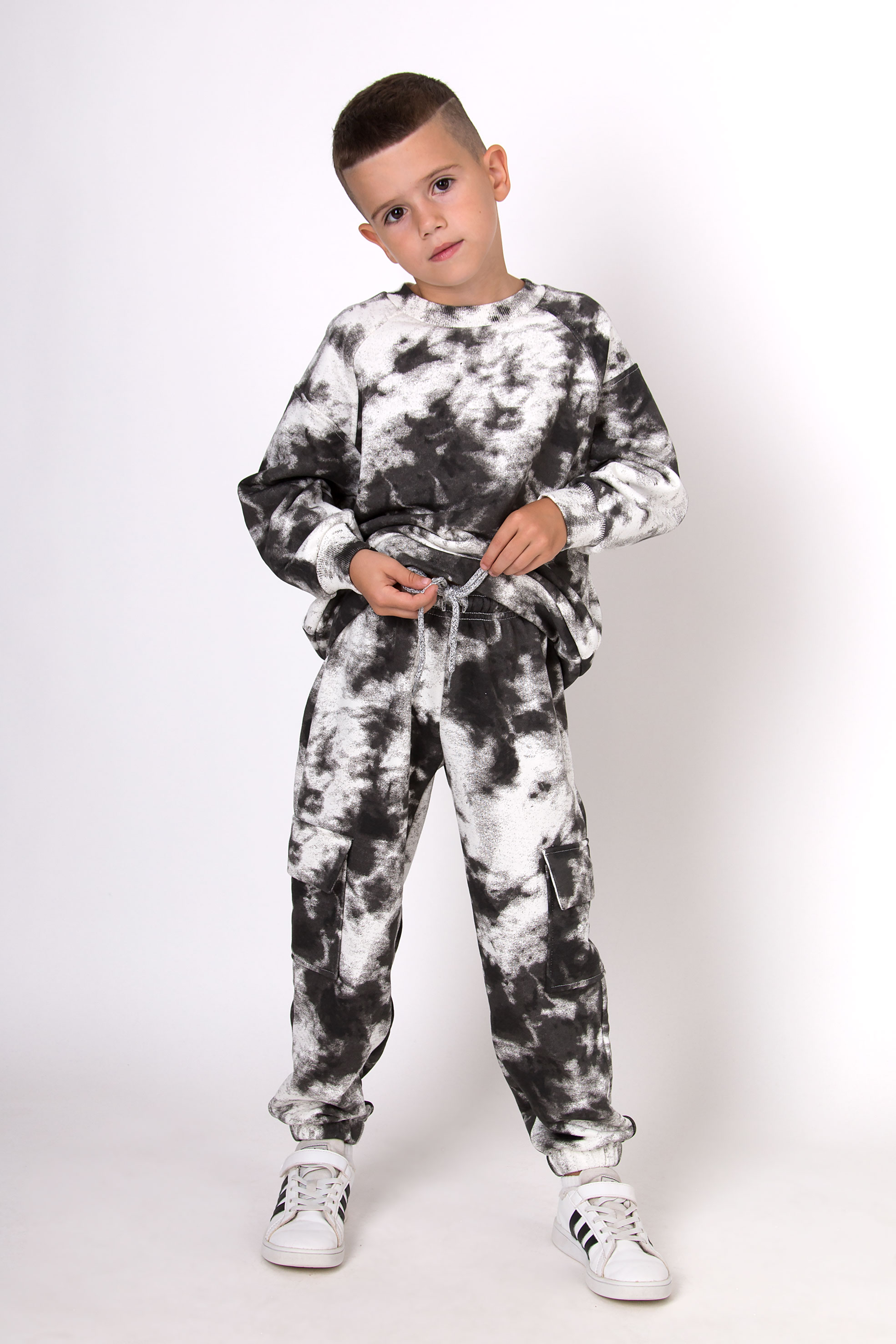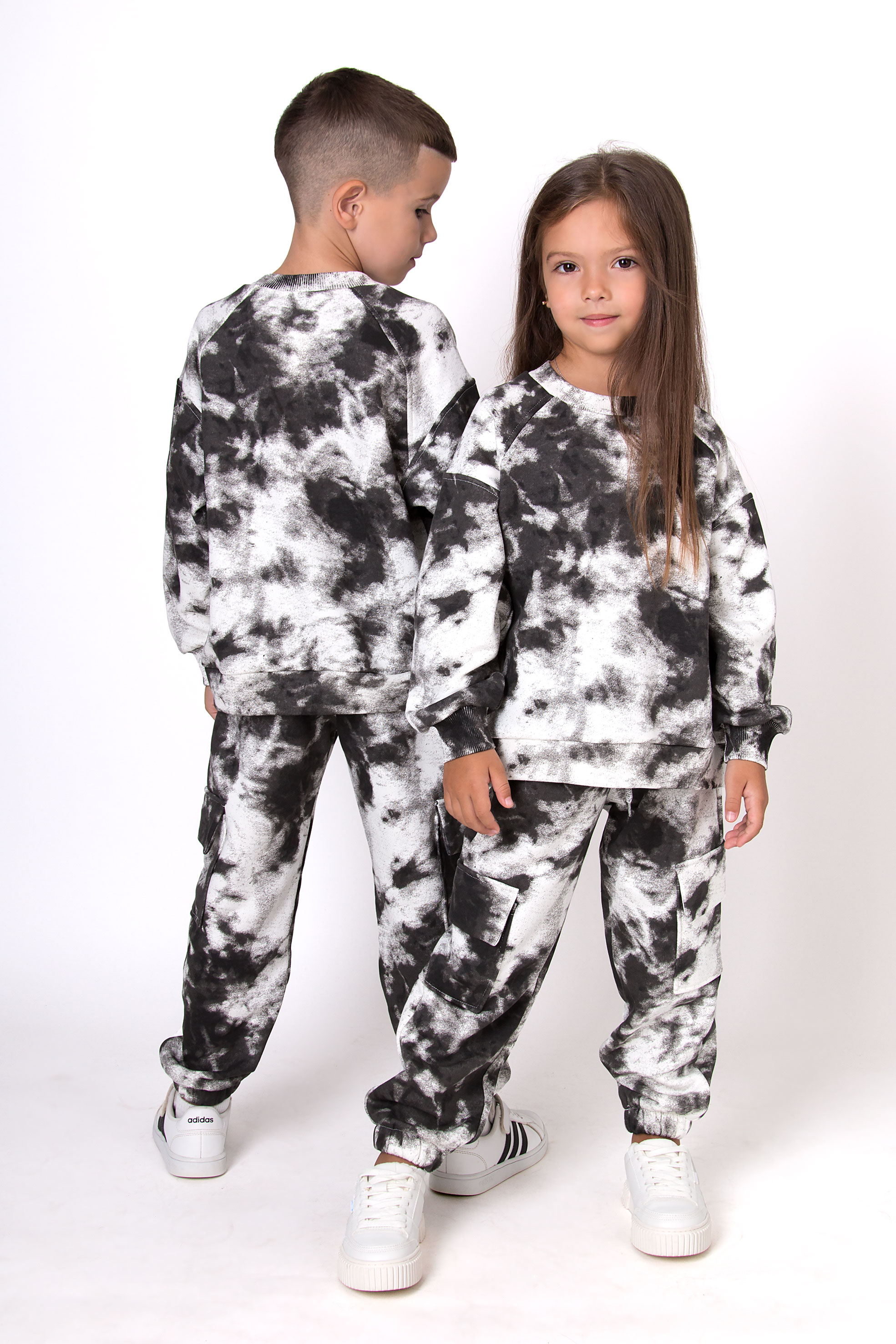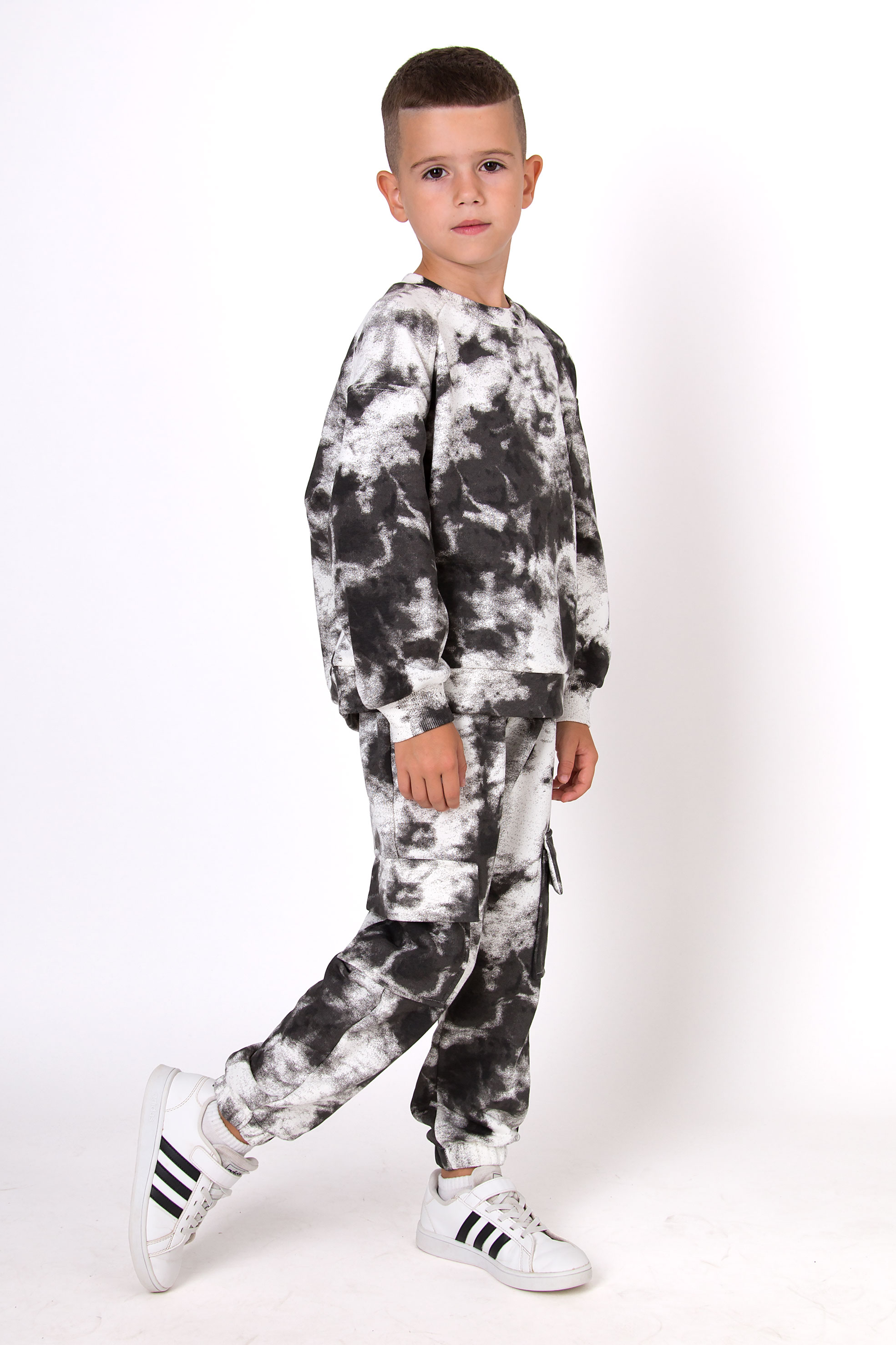 Костюм з ефектом тай-дай — яскравий вибір для тих, хто любить виразні образи. Стильний принт поєднано з комфортним вільним кроєм. Штани з накладними кишенями й манжетами знизу, світшот з рукавами реглан — усе продумано для зручності й рухливості.