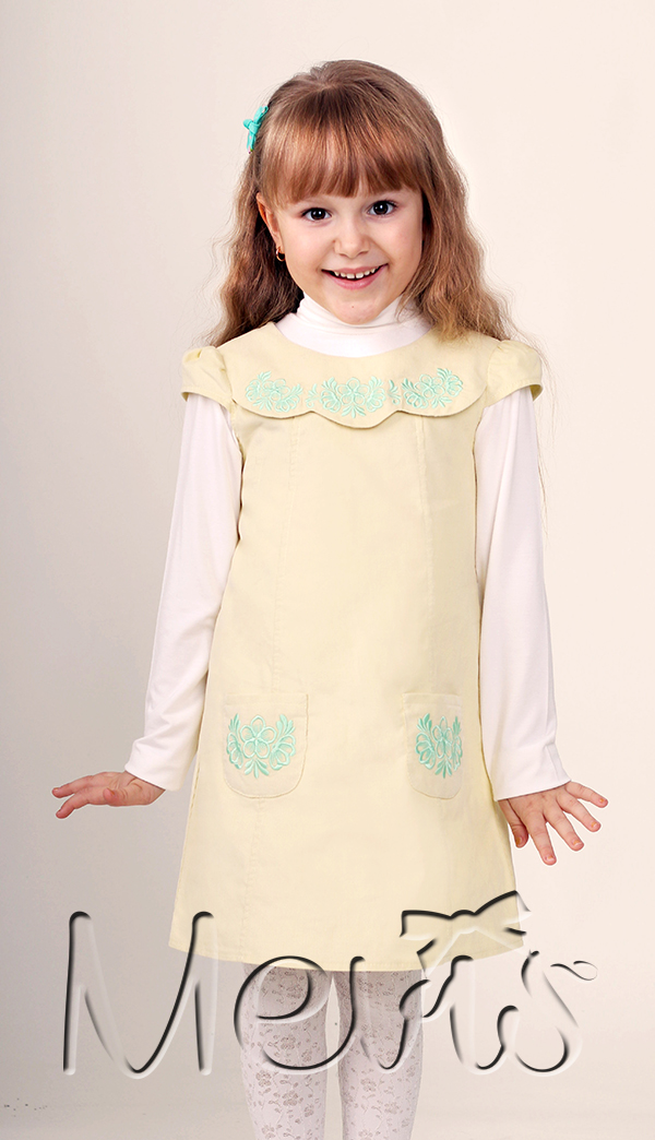 Сарафан з вельвету у світло-жовтому відтінку прикрашений квітковою вишивкою . Модель прямого крою з округлим комірцем та кишеньками спереду. Зручно носити у комплекті з гольфами чи блузами.