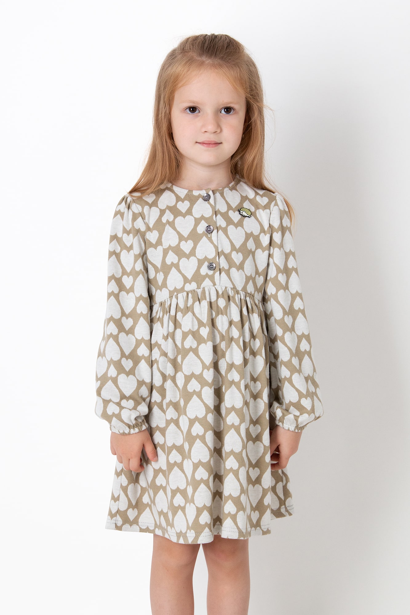 Сукня з м’якої текстильної тканини з милим принтом у сердечка. Злегка розширений силует, застібка на ґудзики спереду та зібрані рукави додають легкості та ніжності.