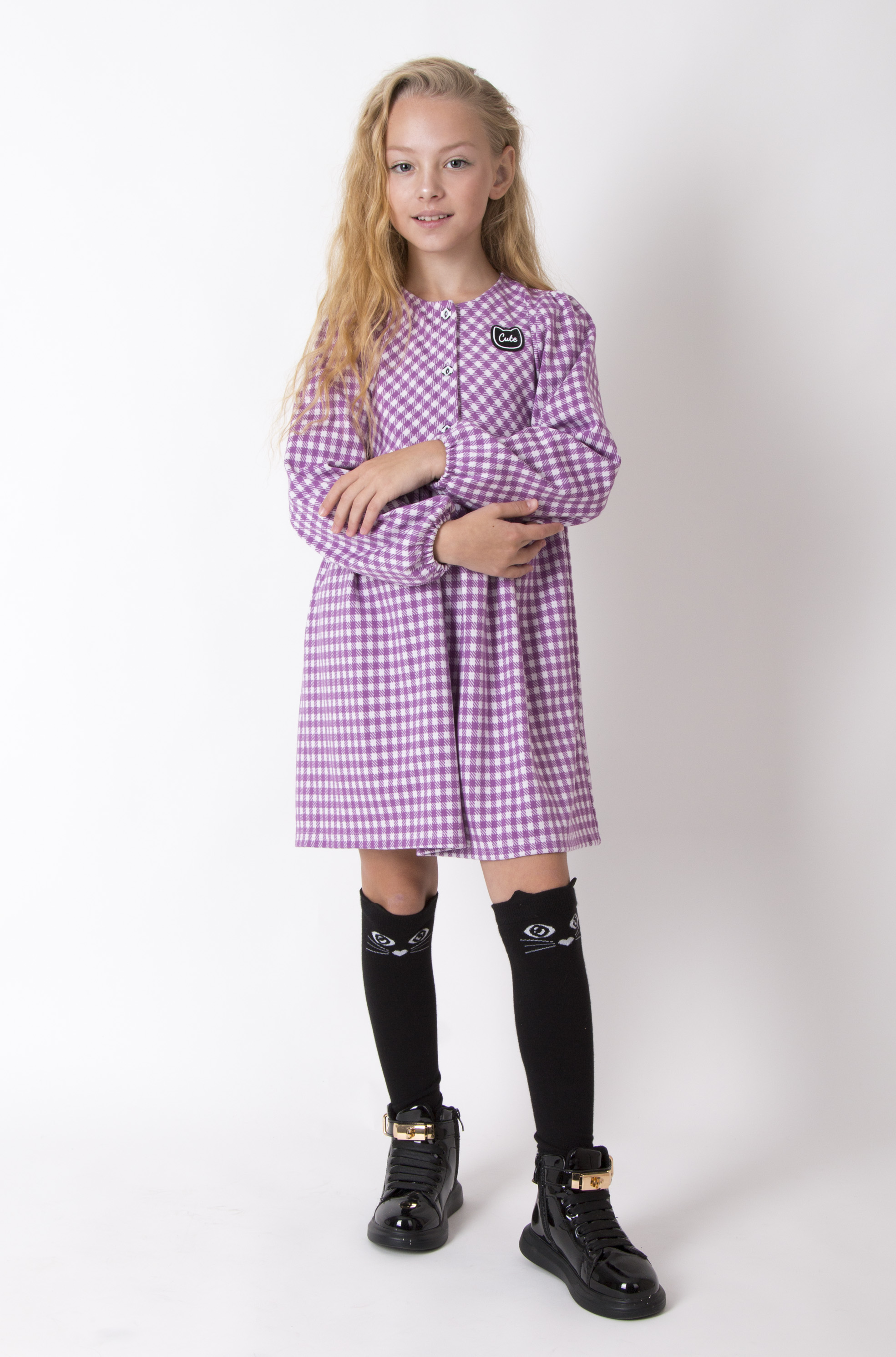 Сукня з мʼякого трикотажу у фіолетову клітинку — комфортна й стильна модель на щодень. Сукня відраза по талії, зверху застібається на ґудзики, рукава зібрані на резинку. Невелика нашивка у вигляді котика на грудях — акцентна деталь, яка доповнює образ.