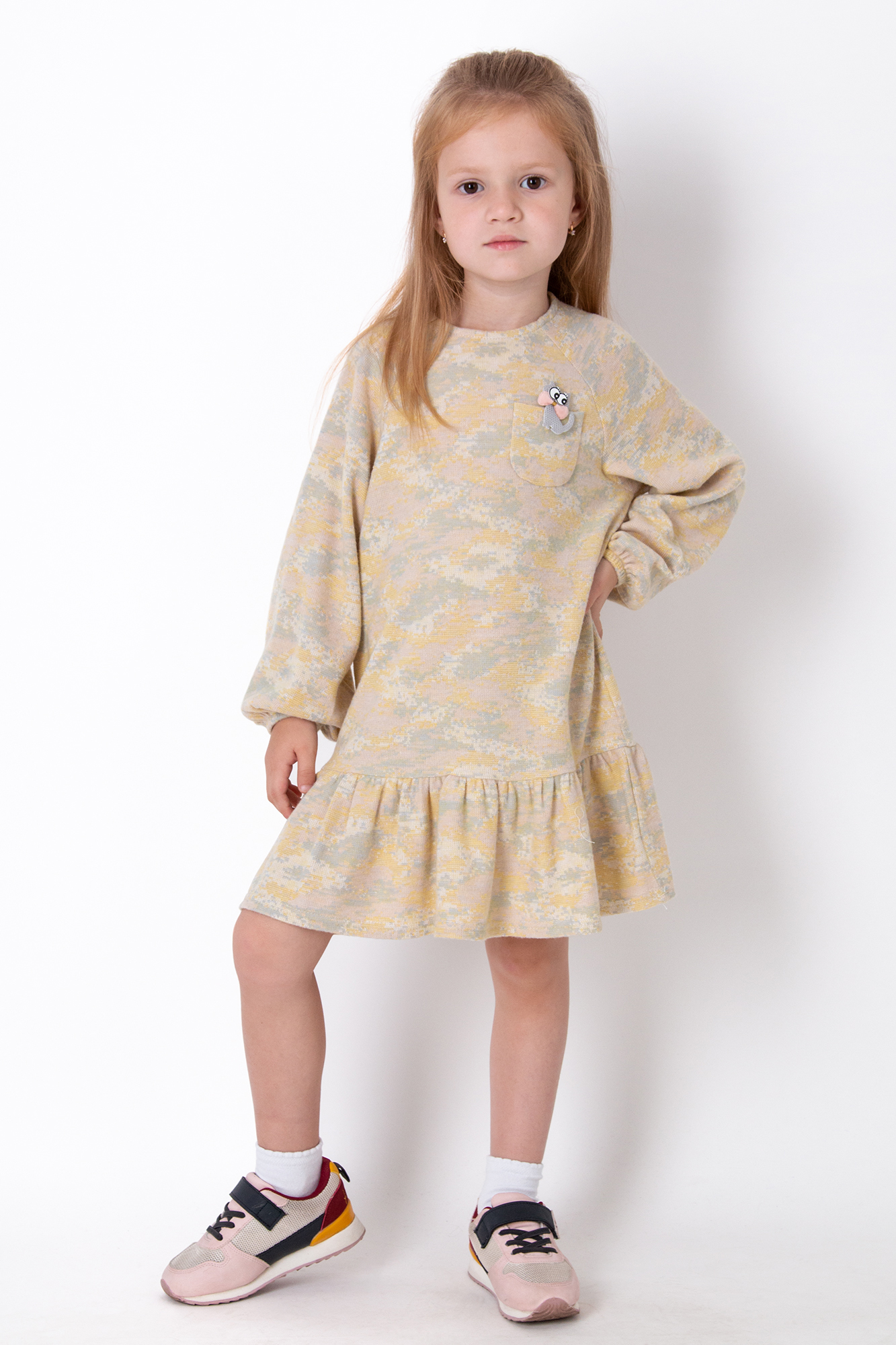 Сукня з м’якого трикотажу з абстрактним візерунком у спокійній кольоровій гамі. Доповнена довгими рукавами та накладною кишенею спереду. Декоративна нашивка з котиком надає моделі виразності. Підійде на щодень.
