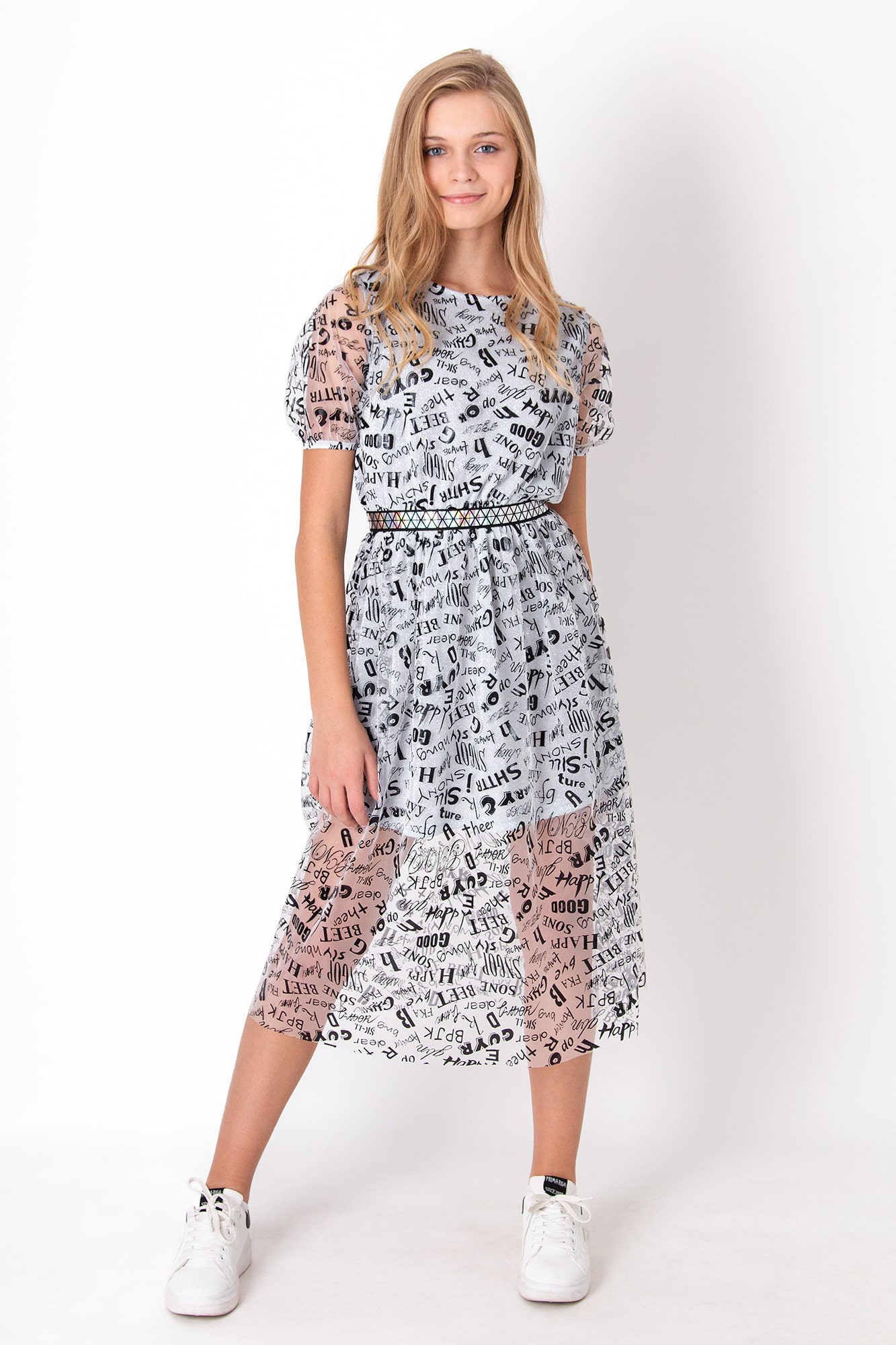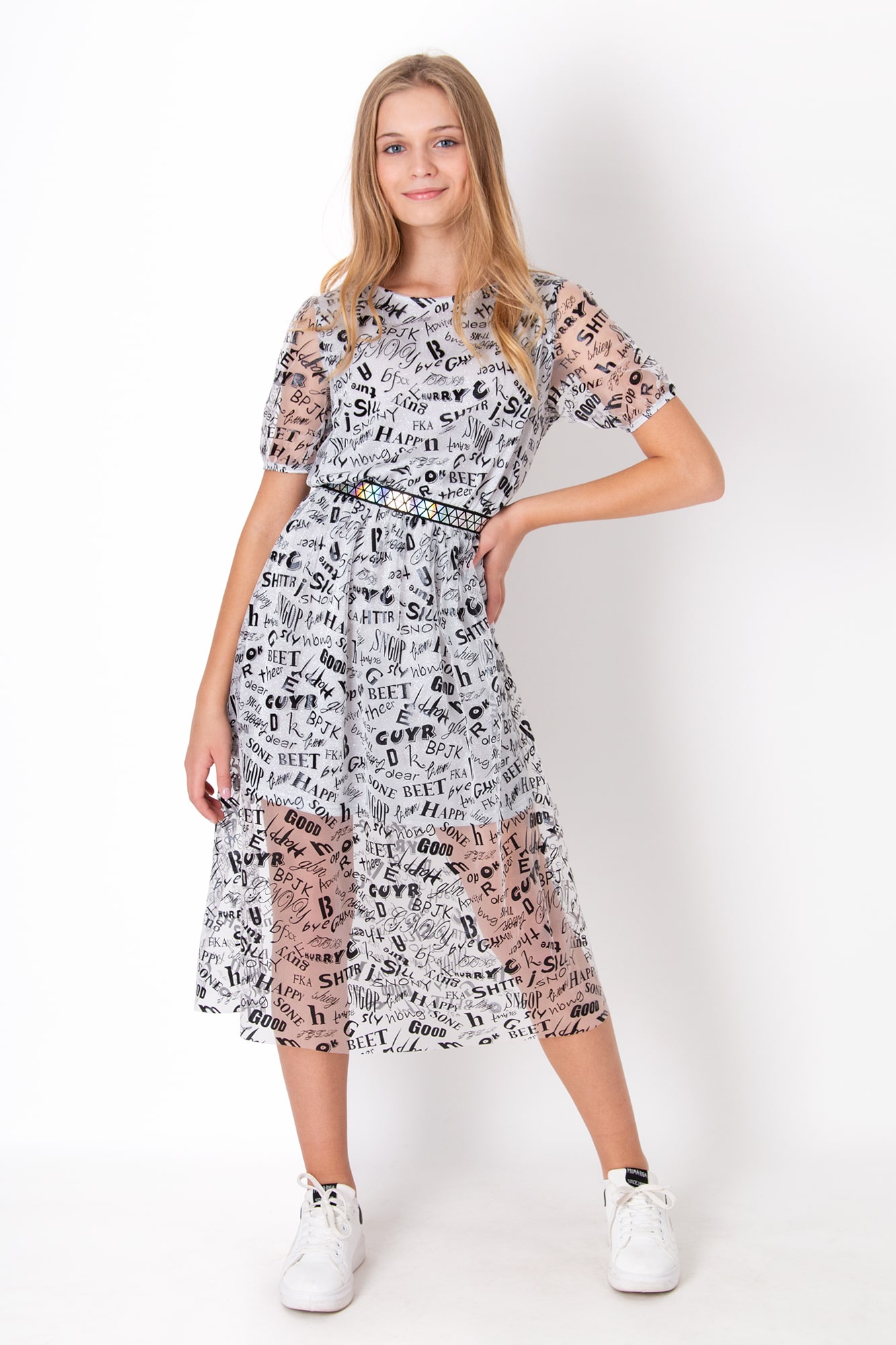 Сукня. Трикотажна основа. Верхній шар — сітка з принтом. Кругла горловина. Короткий рукав. Талія на резинці. Довжина міді.