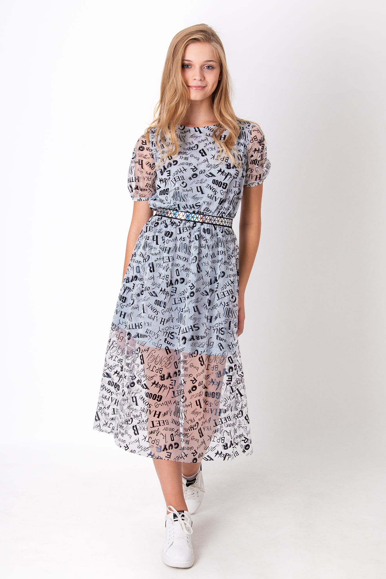 Сукня. Трикотажна основа. Верхній шар — сітка з принтом. Кругла горловина. Короткий рукав. Талія на резинці. Довжина міді.