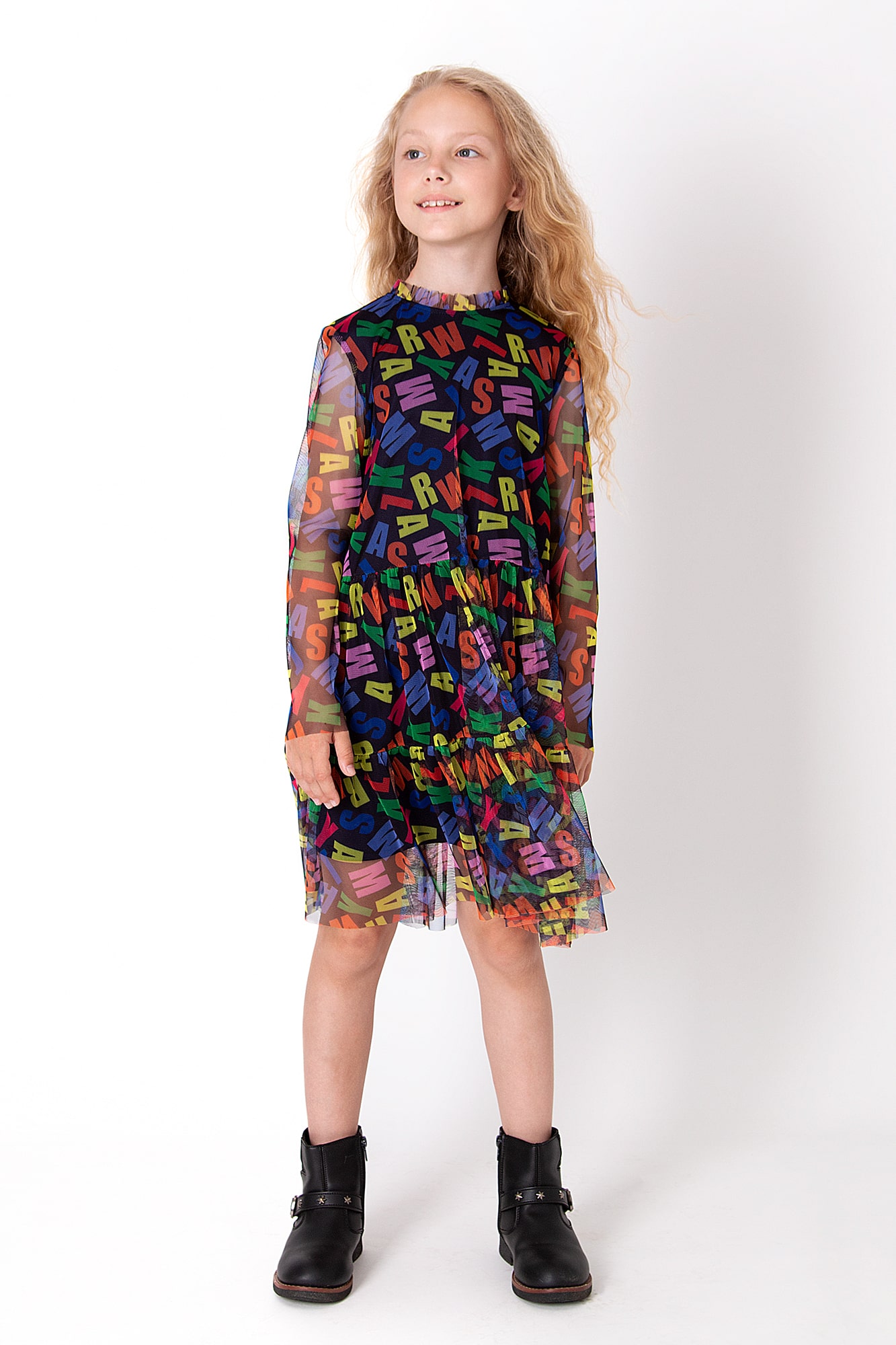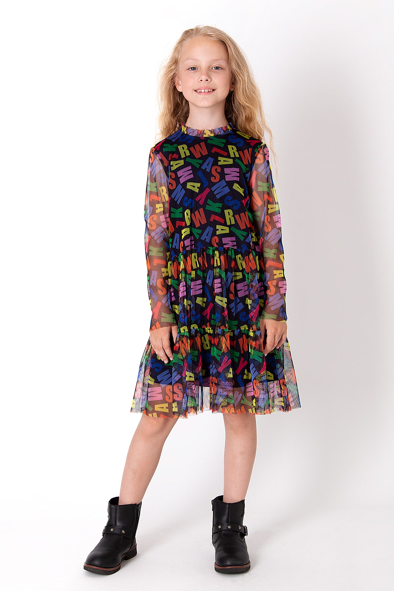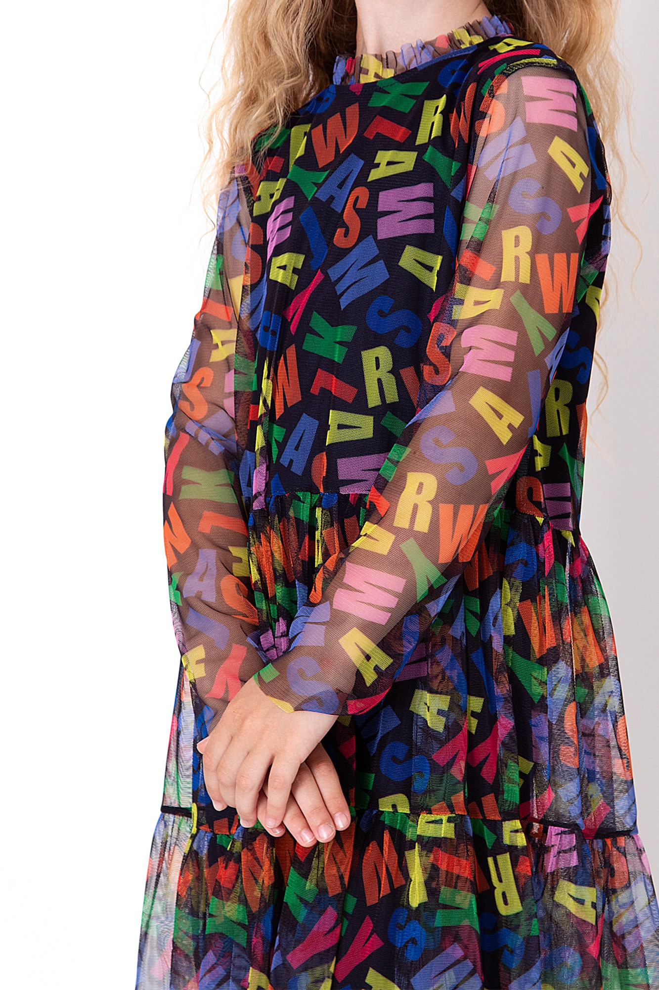 Сукня з ефектної прозорої тканини з яскравим принтом у вигляді кольорових літер. Легка текстура та об’ємна спідниця створюють вільний силует. Довгі рукави додають виразності, а багатобарвний візерунок робить образ веселим і сучасним.