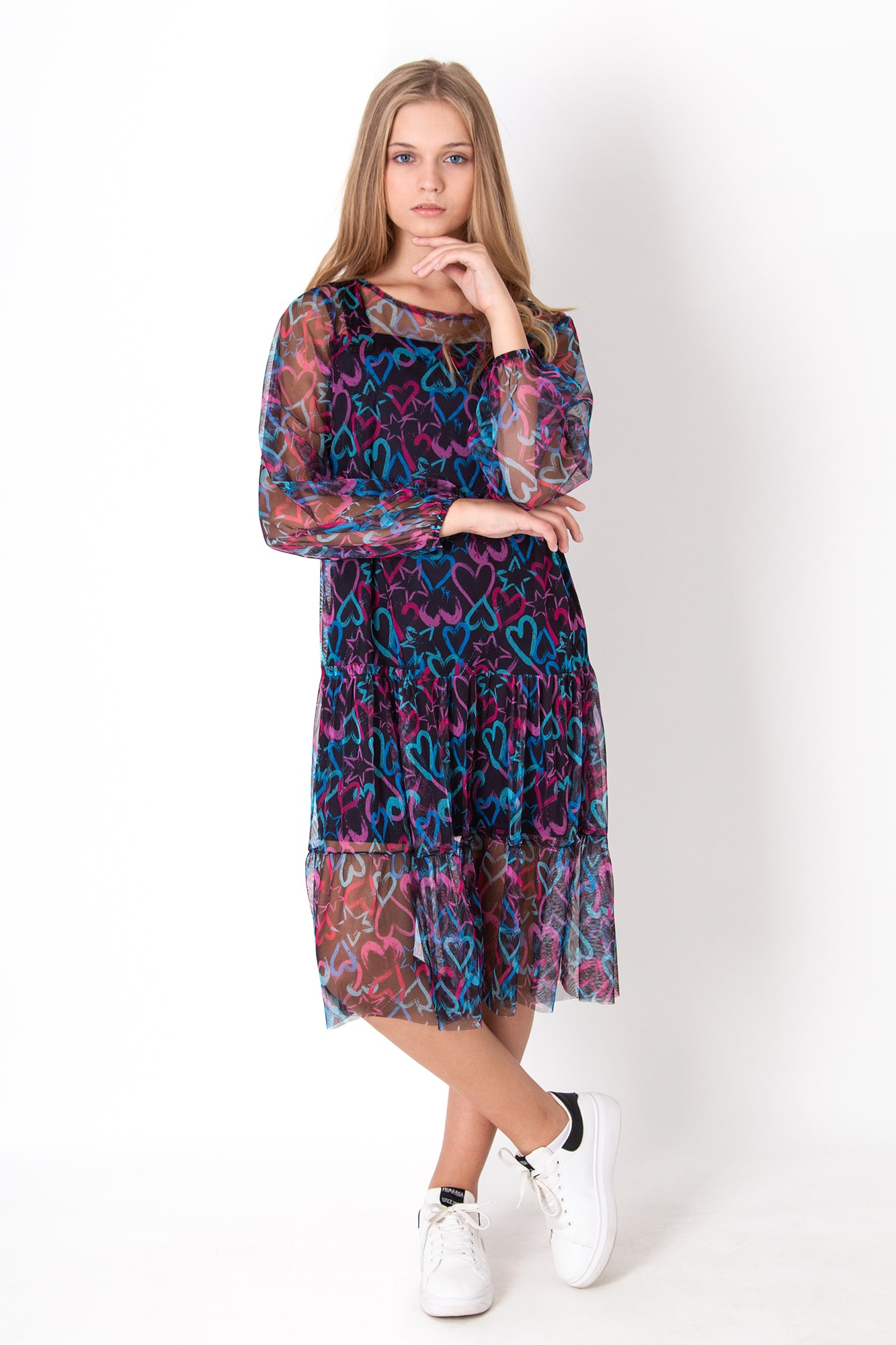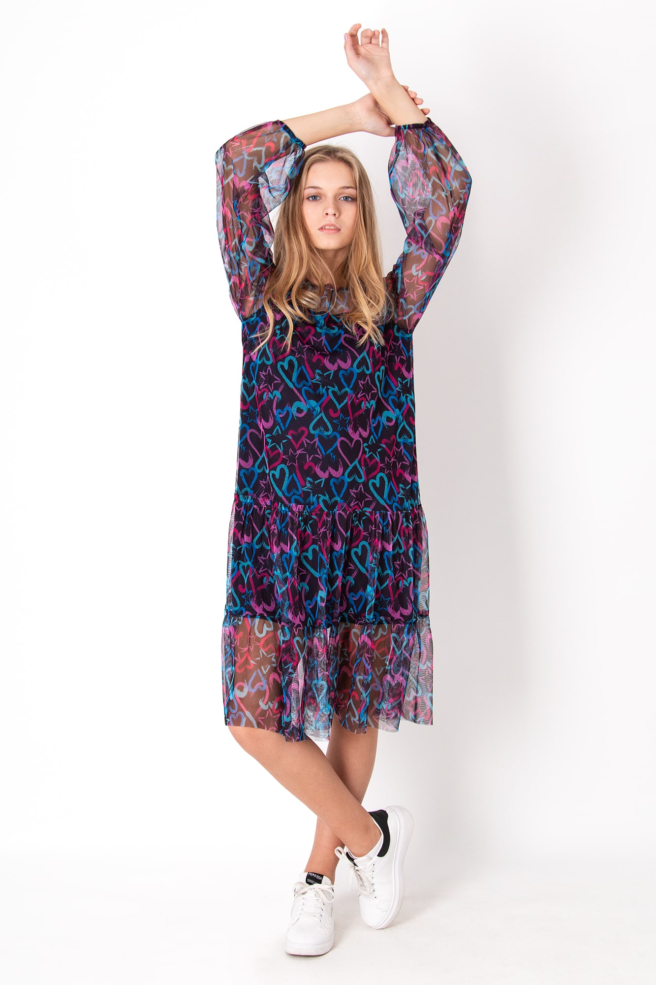 Сукня з прозорої тканини з яскравим принтом у формі сердець та зірочок. Напівпрозорі рукави та пишна спідниця додають ніжності, а яскравий візерунок робить образ святковим навіть у повсякденні.