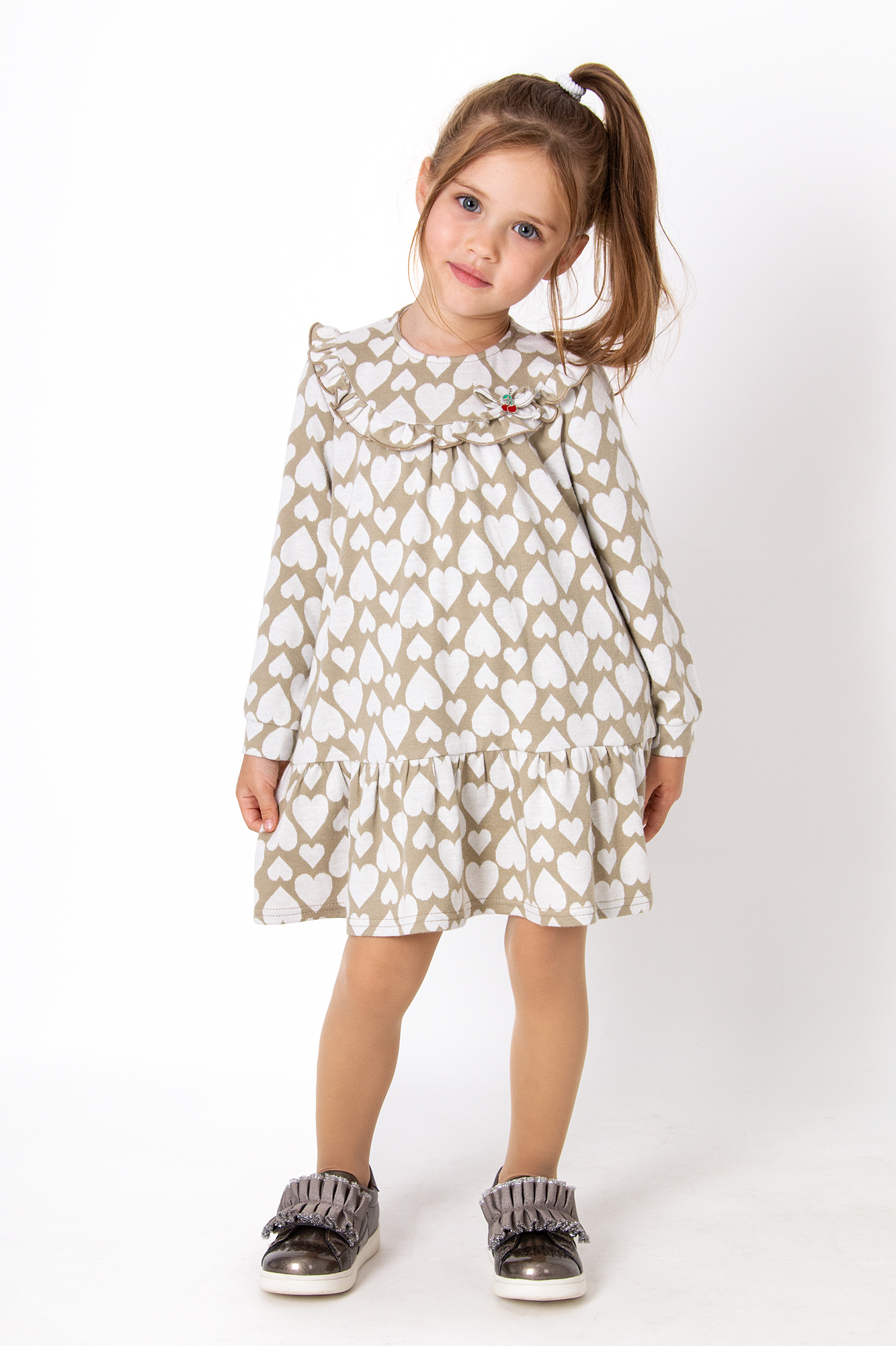 Сукня з м’якого трикотажу з ніжним принтом у вигляді сердець. Модель трапецієвидного крою з рюшею по низу та оздобленням біля комірця. Довгий рукав робить її зручною для прохолодної пори. Легка, мила та практична — ідеальна на щодень або для особливих моментів.