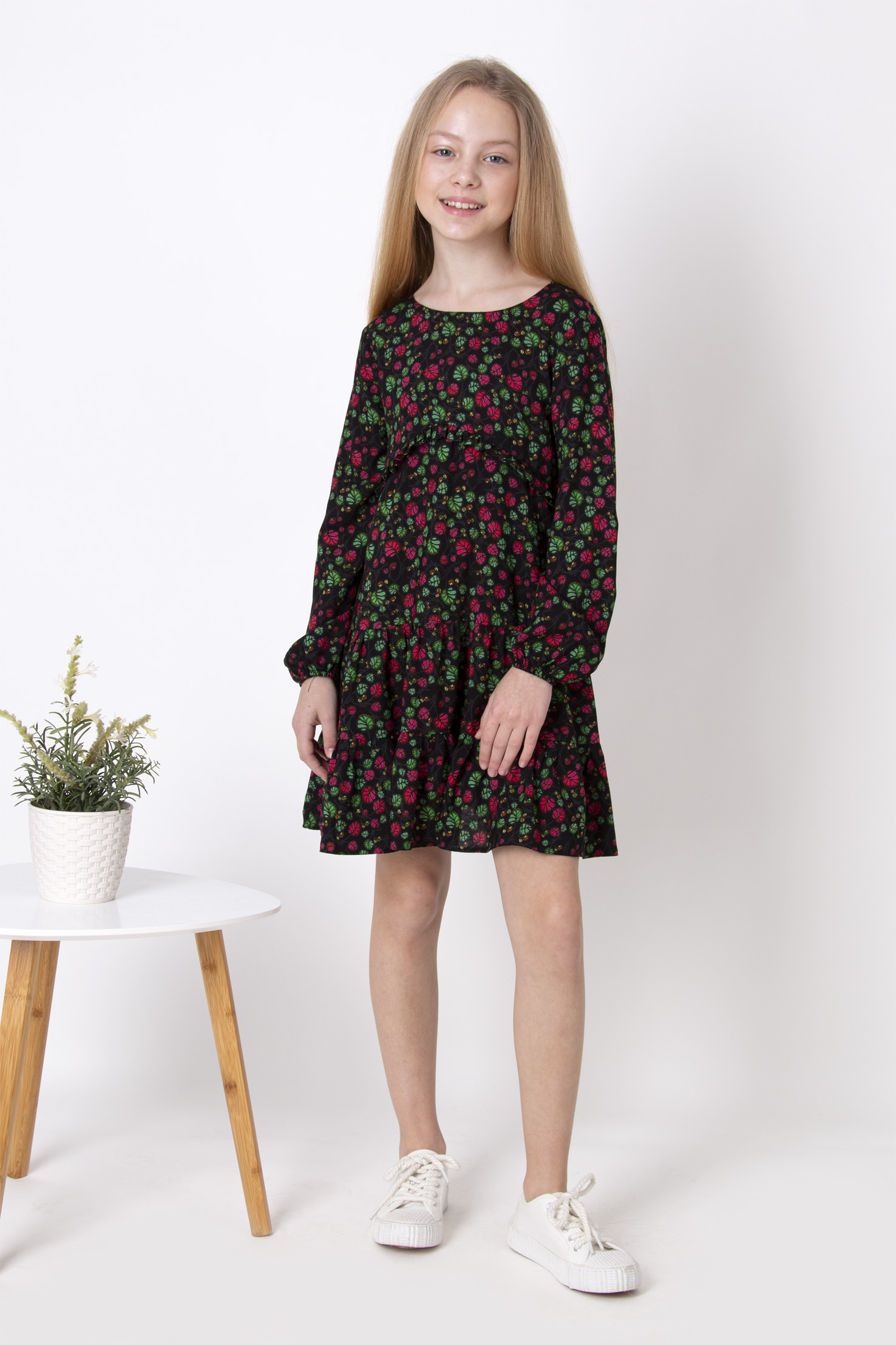 Cукня з тканини штапель. Кругла горловина. Довгий рукав. Манжети по низу рукавів. Зборка по лінії талії. Розширений низ. Квітковий принт. Довжина вище коліна.