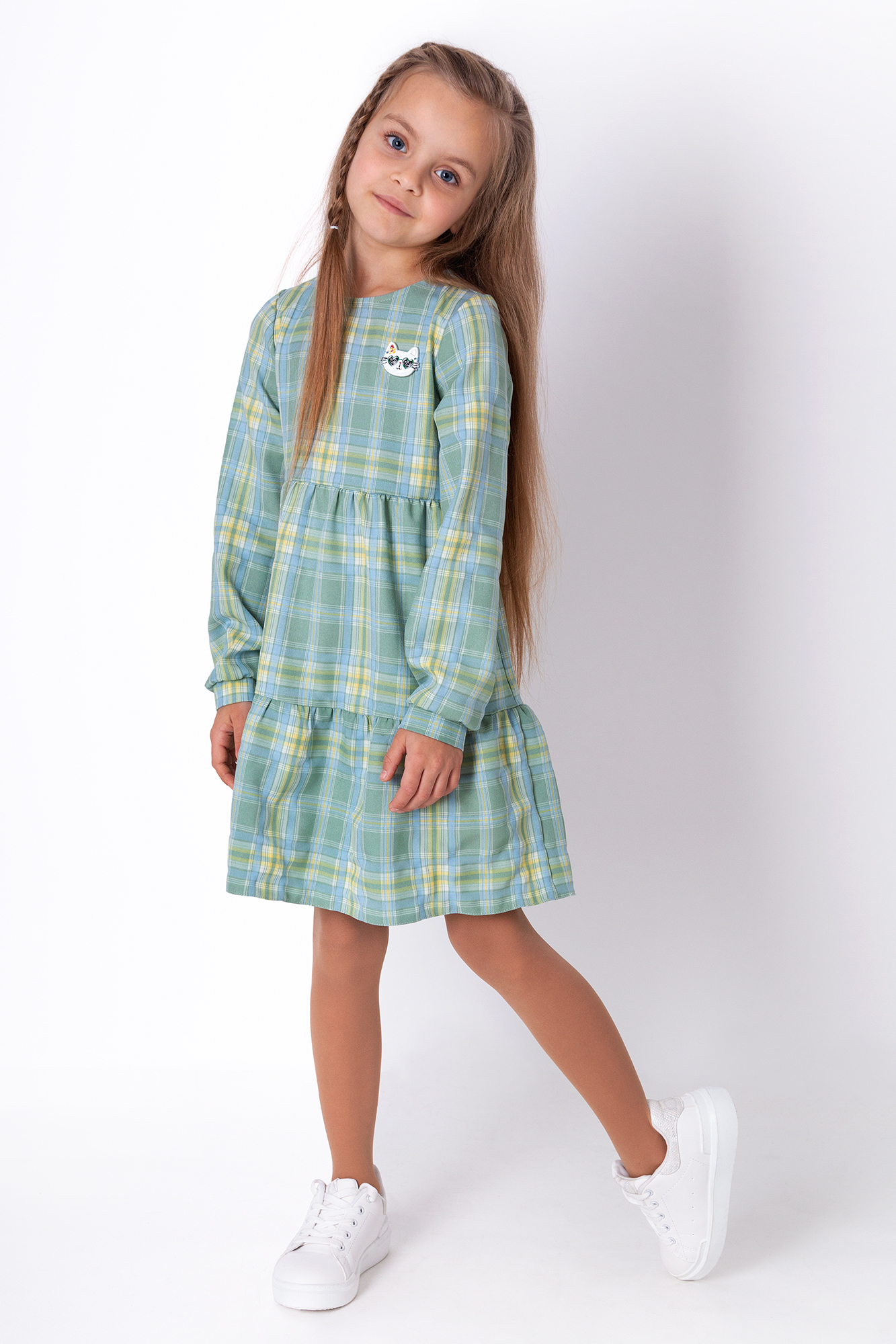 Сукня з текстилю в клітинку — для дівчат, які люблять стиль і свободу. Модель із вільним силуетом та м’якими збірками чудово сидить і не заважає рухатися. Довгі рукави зібрані манжетом на ґудзику — зручно і акуратно. Маленька металева нашивка з котиком спереду додає образу трохи настрою та індивідуальності.