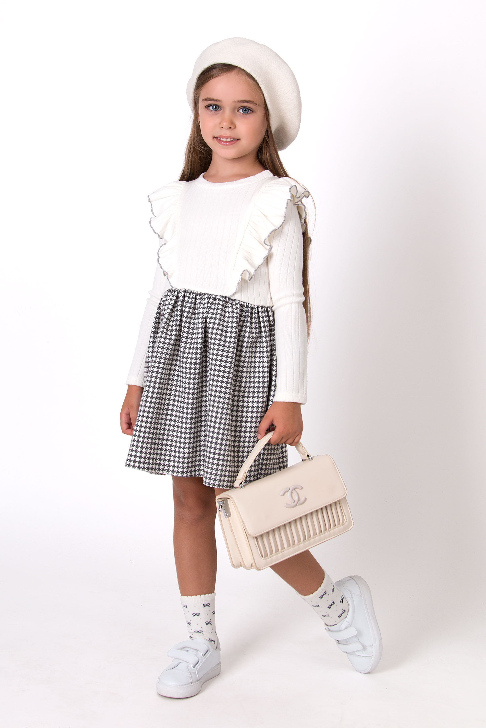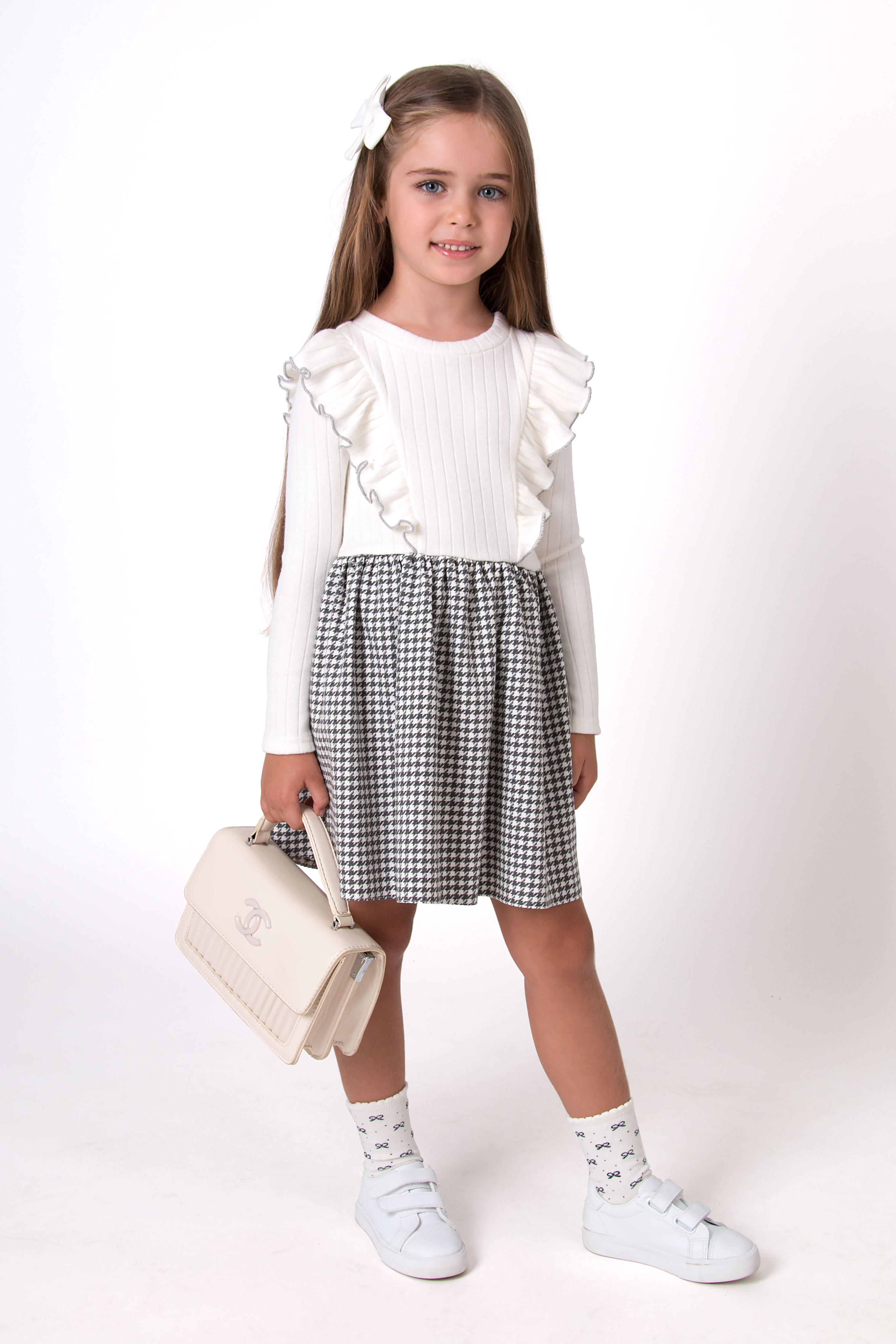 Сукня з м’якої трикотажної тканини. Верх оздоблений об’ємними рюшами, що додають ніжності, а спідниця з класичним візерунком «гусина лапка» створює елегантний контраст. Ідеальний варіант для стильного повсякденного образу.