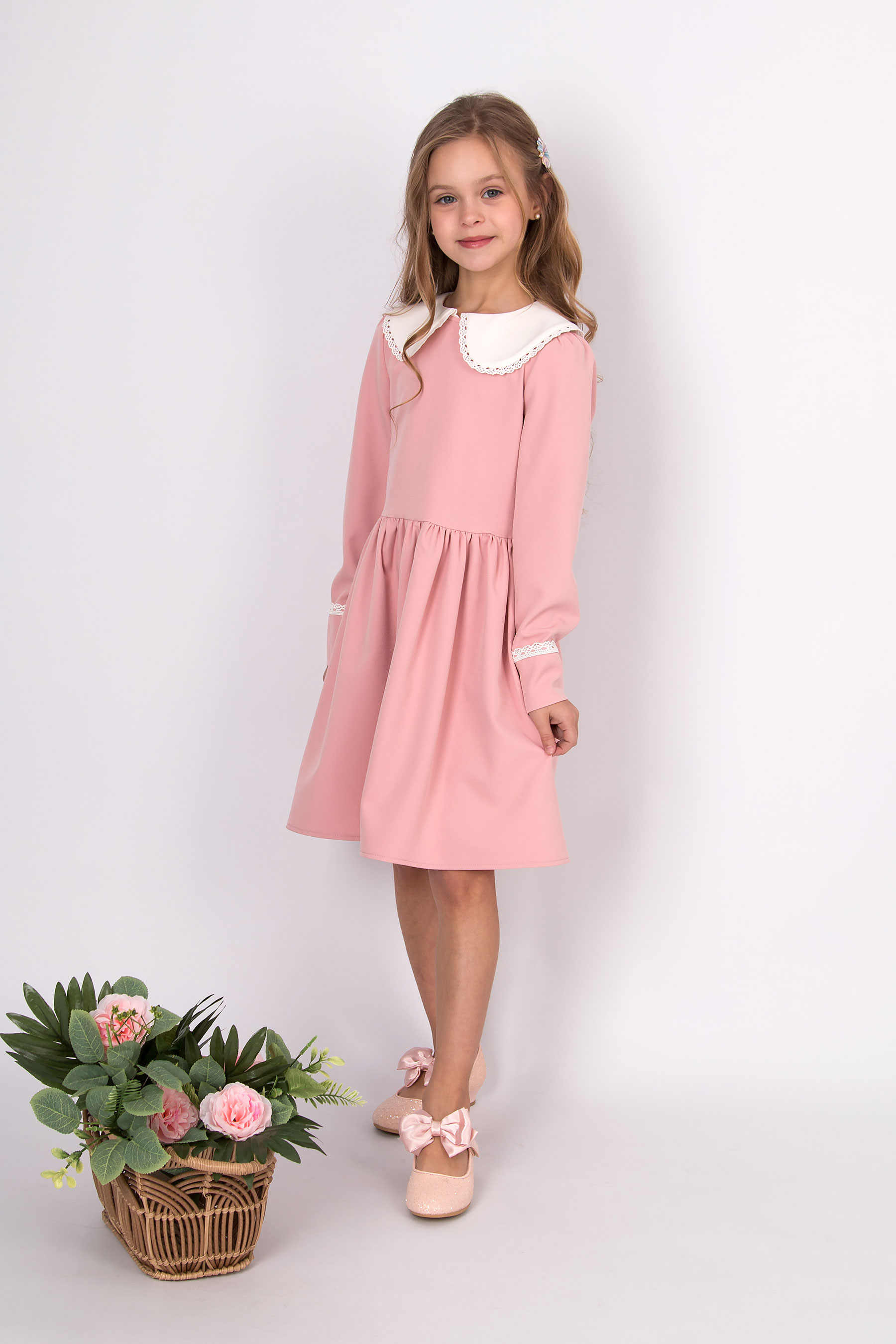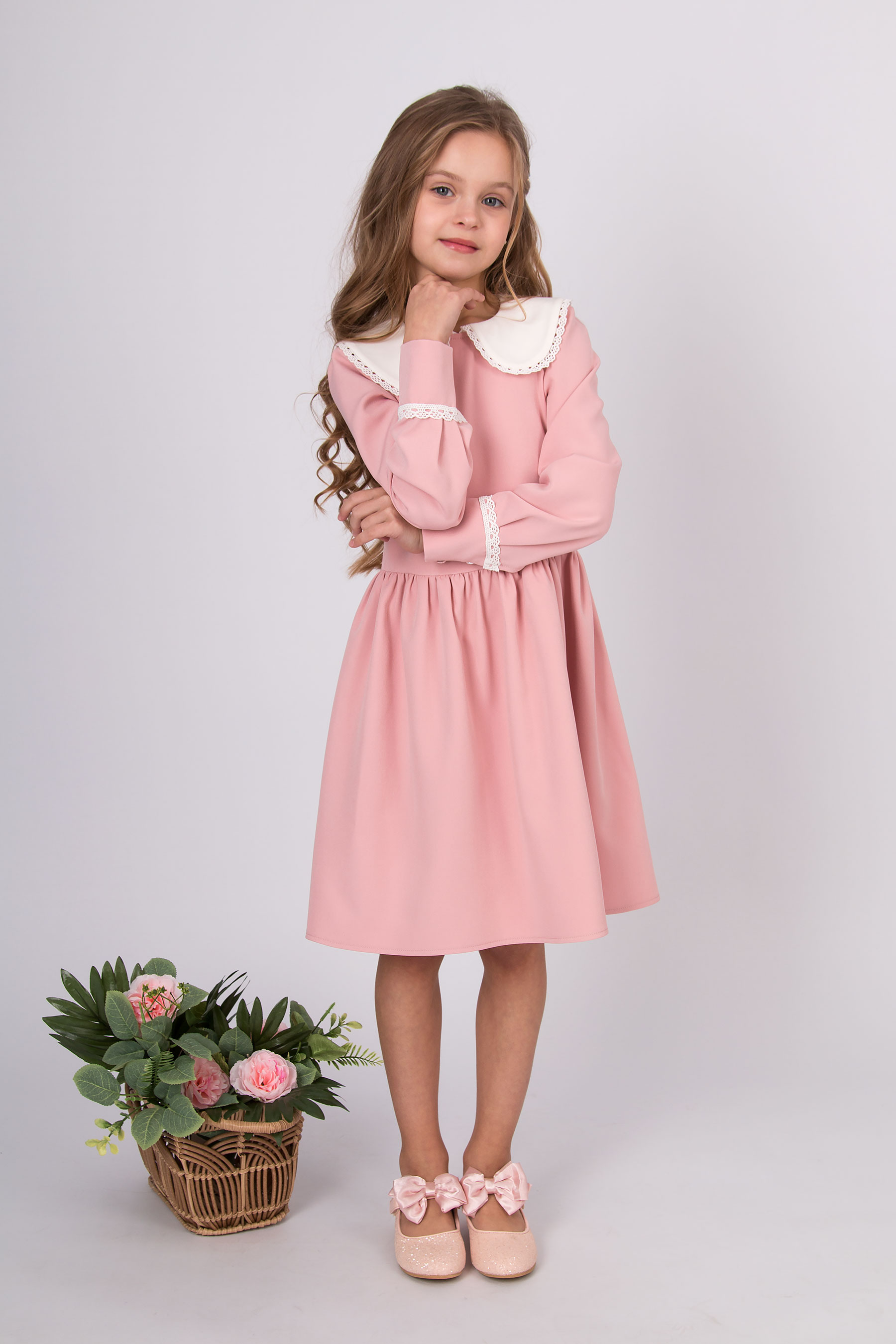 Елегантна сукня з костюмної тканини з довгими рукавами та відрізною лінією талії без резинки, що формує акуратний силует. Декоративний комірець та манжети оздоблені мереживом доповнюють образ, м’які складки на спідниці додають образу ніжності й вишуканості.