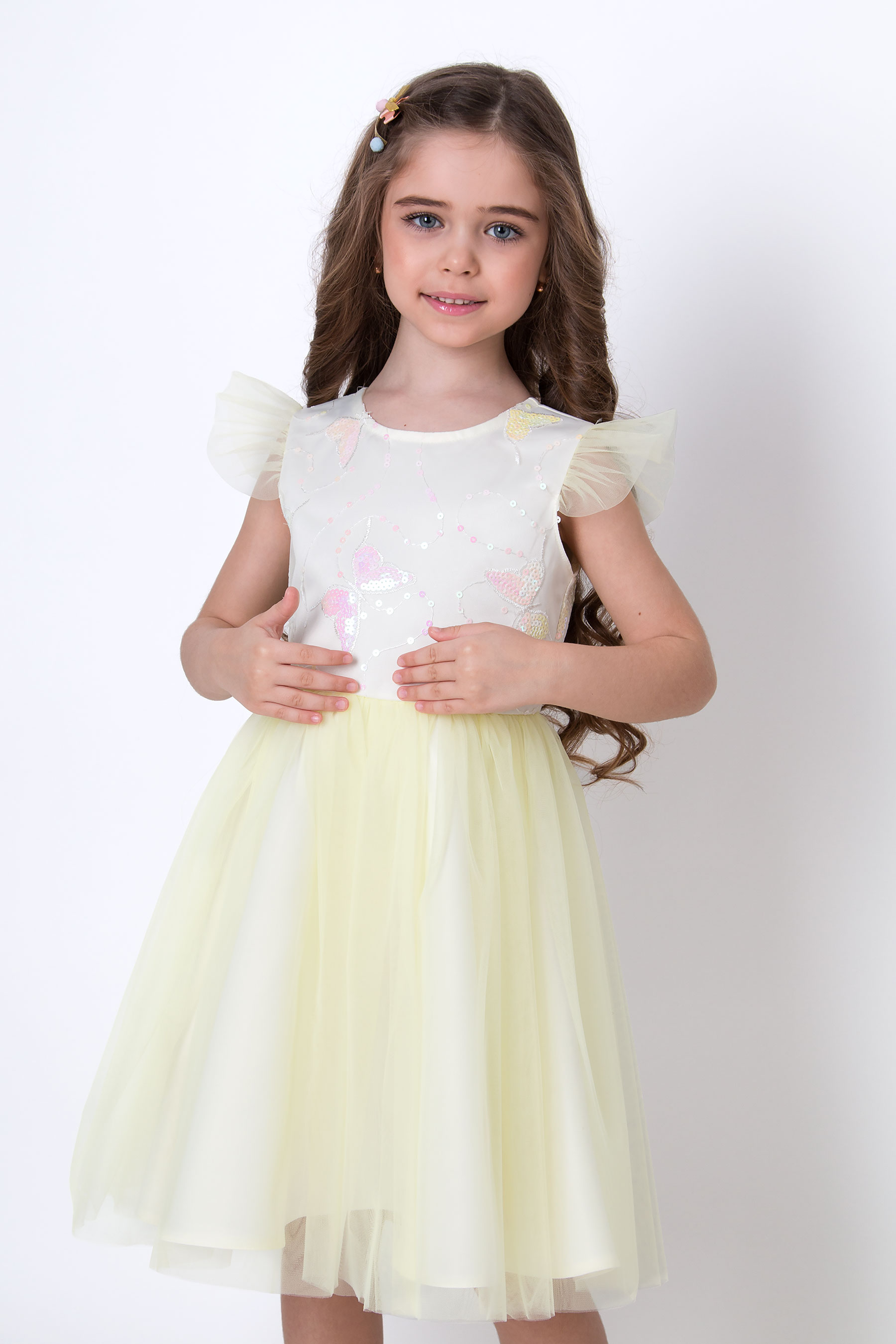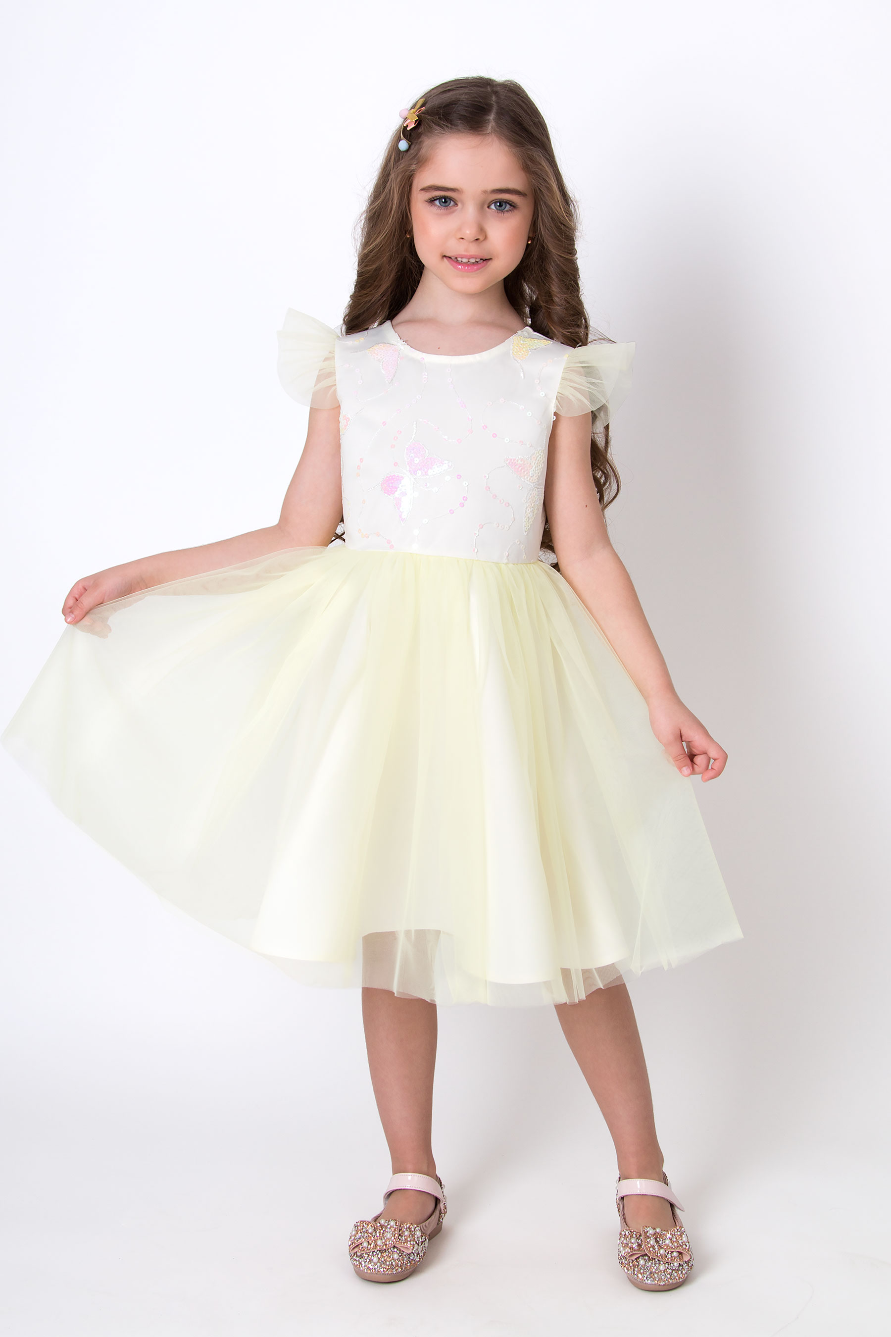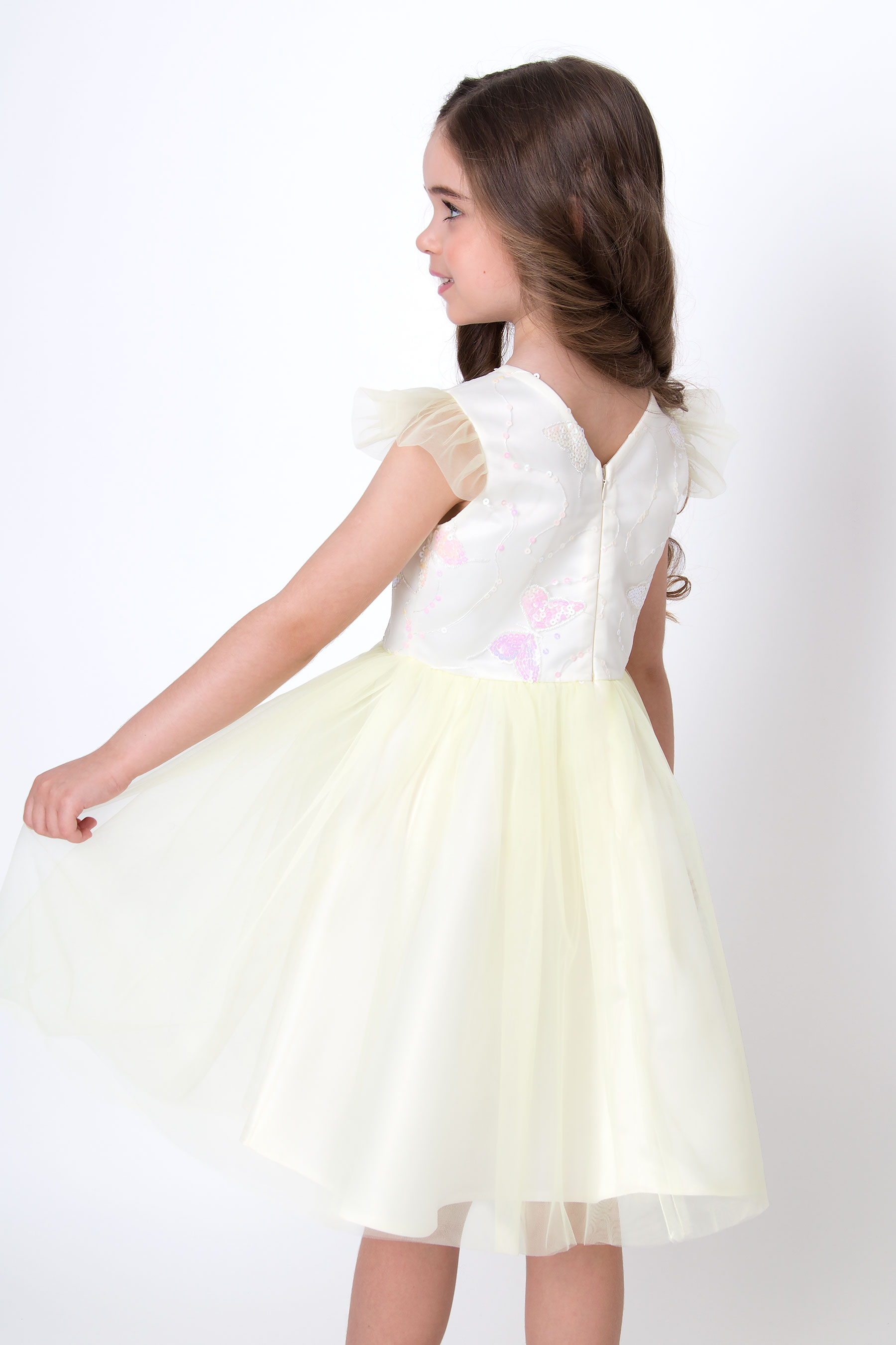 Сукня для дівчинки з поєднанням атласного верху та багатошарової спідниці із сітки. Верх виконаний з гладкого атласу з декоративним принтом, по плечах — напівпрозорі крильця з м’якої сітки. Лінія талії відрізна, спідниця пишна, добре тримає форму за рахунок кількох шарів сітки. На спинці передбачена застібка-блискавка.