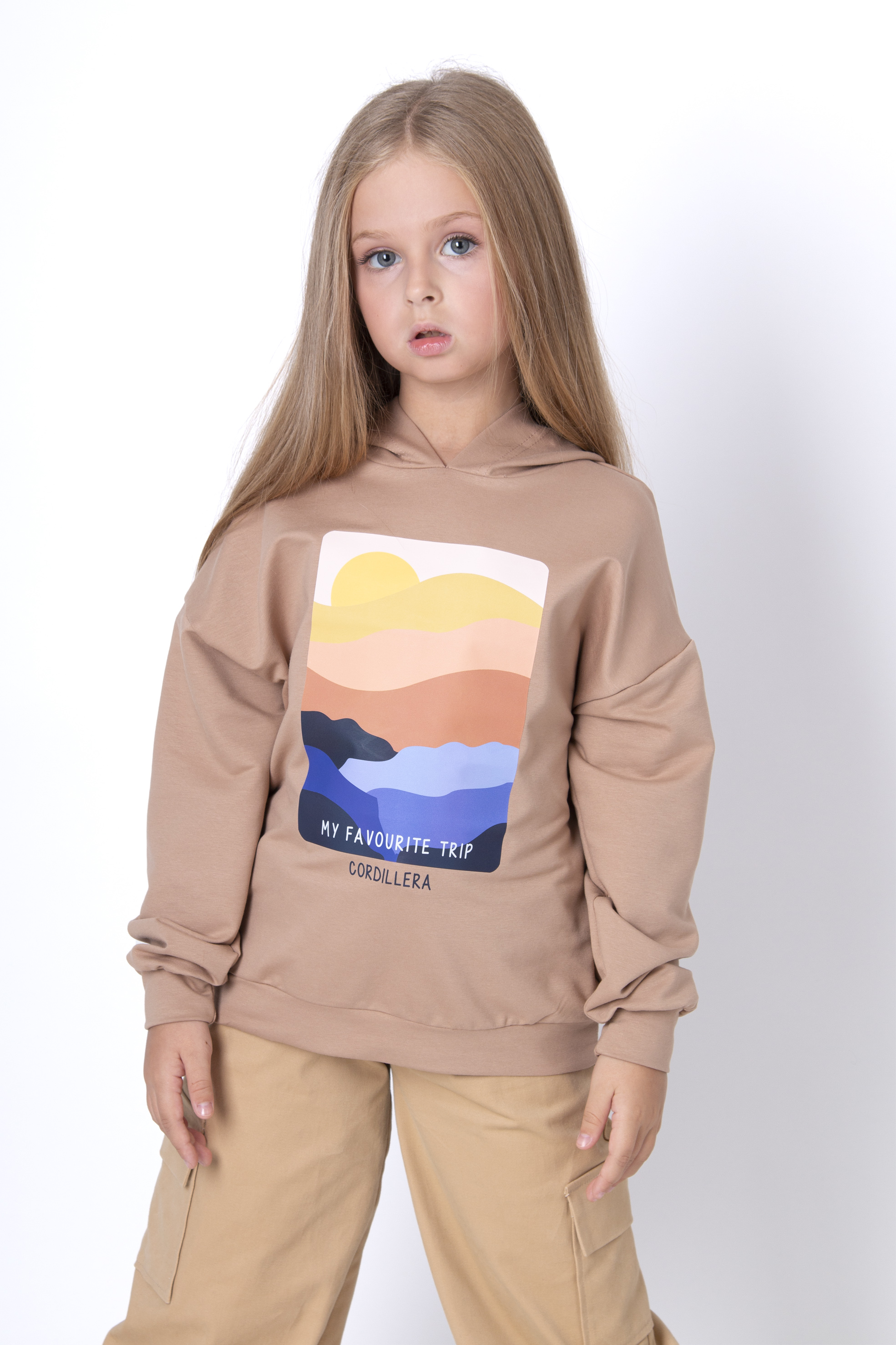 Худі з атмосферним принтом нагадує про пригоди та теплі спогади. Малюнок із силуетами гір і сонцем створює справжній настрій — у кожному кольорі своя історія. Модель має вільну посадку, спущене плече та капюшон. Добре пасує до джогерів, легінсів або штанів — ідея для щоденних образів.