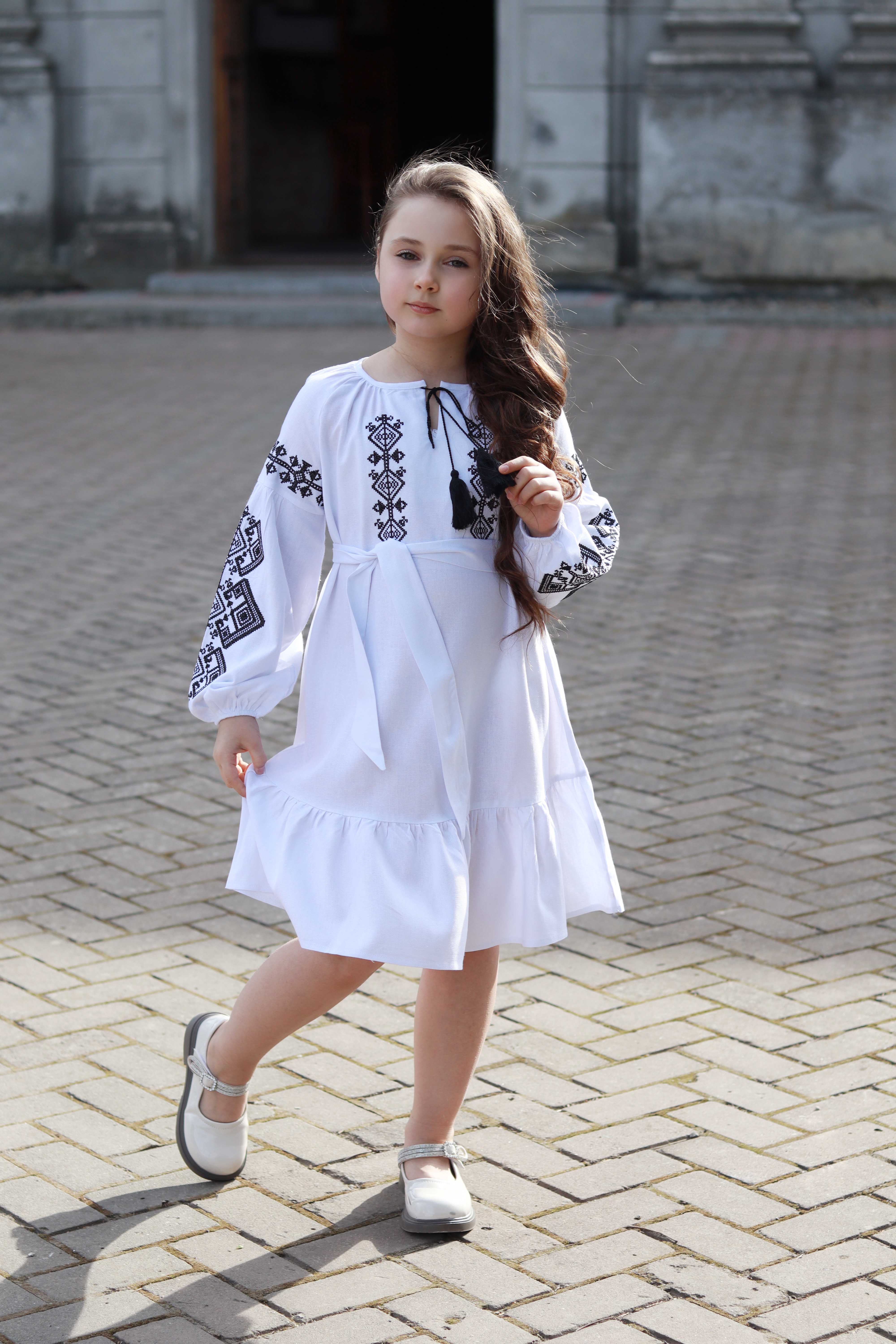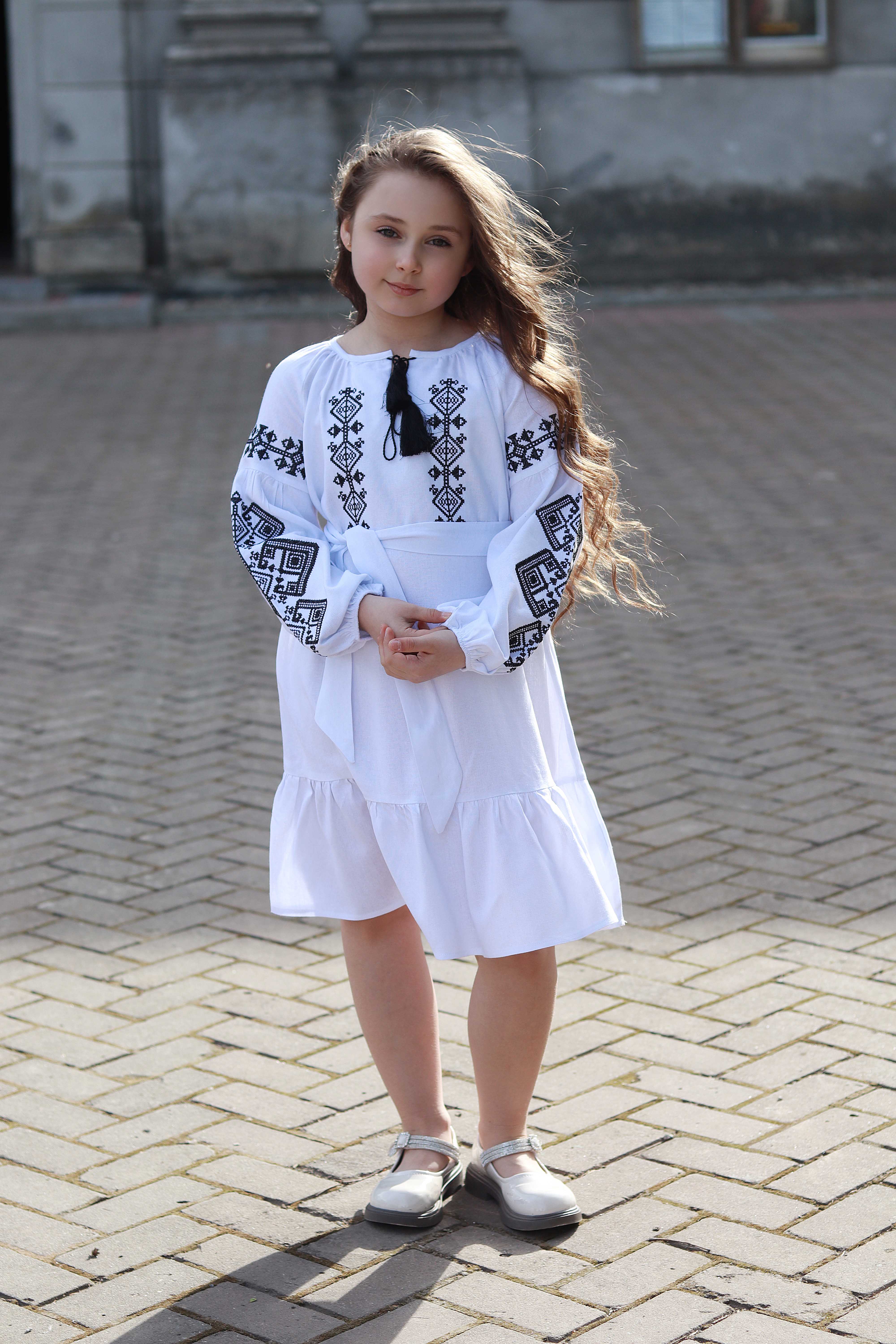Сукня-вишиванка з льону. Модель вільного крою з поясом, що м’яко підкреслює талію. Горловина зав’язується китицями, а рукави оздоблені вишивкою з етномотивами. Легкий силует і продуманий дизайн створюють гармонійний образ для різних подій. Ця сукня поєднує традиційні символи української культури з комфортом сучасного одягу — з любов’ю до коріння і стилю.