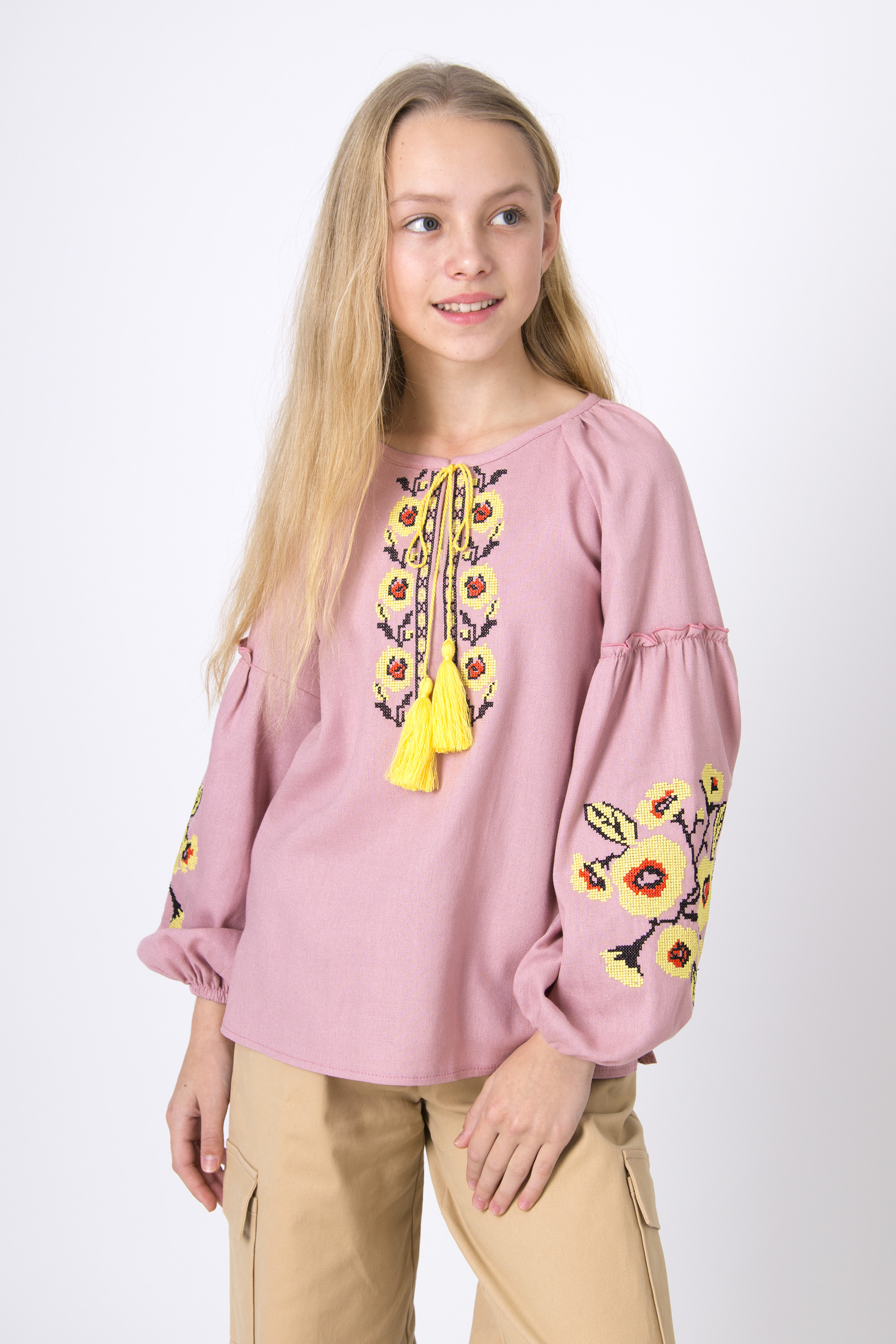 Вишиванка з льону з яскравим орнаментом і китицями на горловині. Об’ємні рукави зібрані на резинку, а поєднання кольорів додає сучасності традиційному образу. У вишивці оживає українська традиція — символіка квітів несе в собі тепло рідної землі та глибину культурної історії. Ця вишиванка — не просто одяг, а сучасне втілення спадщини, якою можна пишатися щодня.