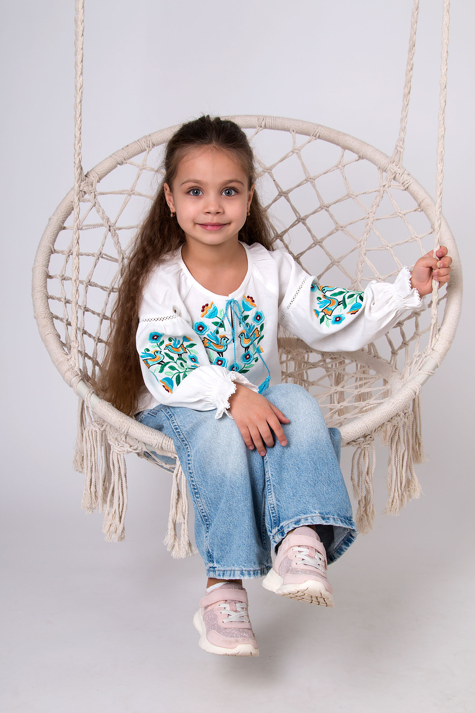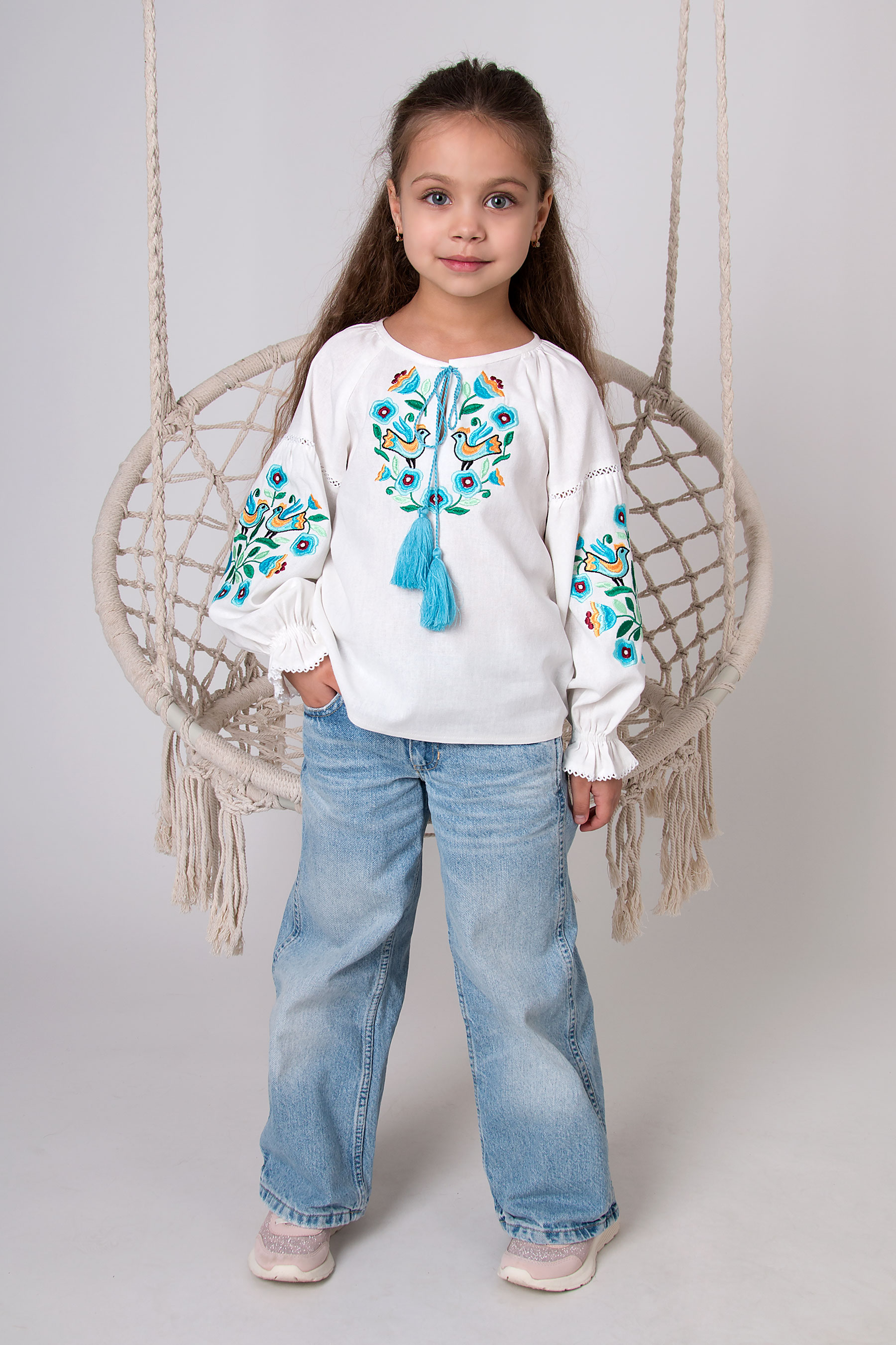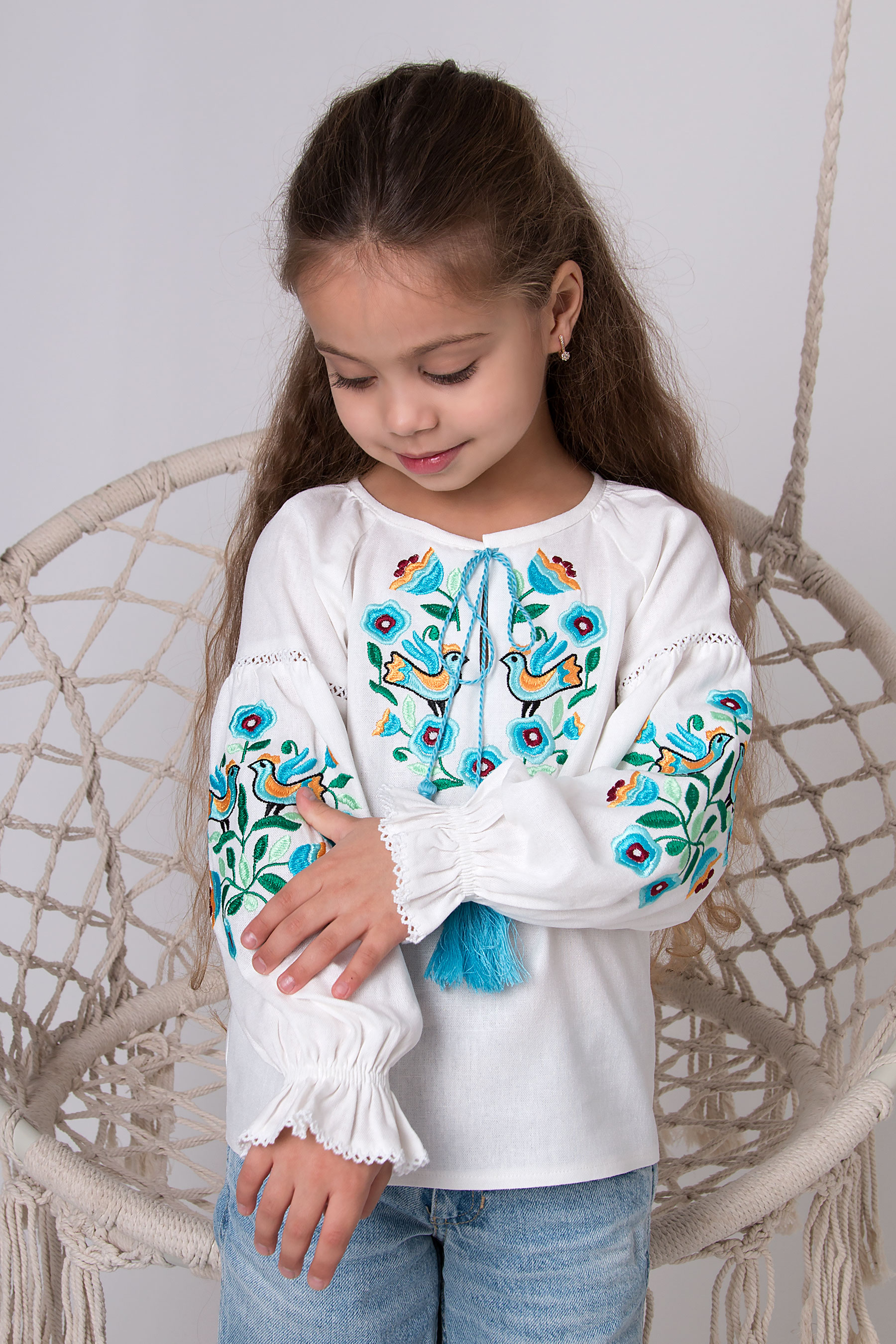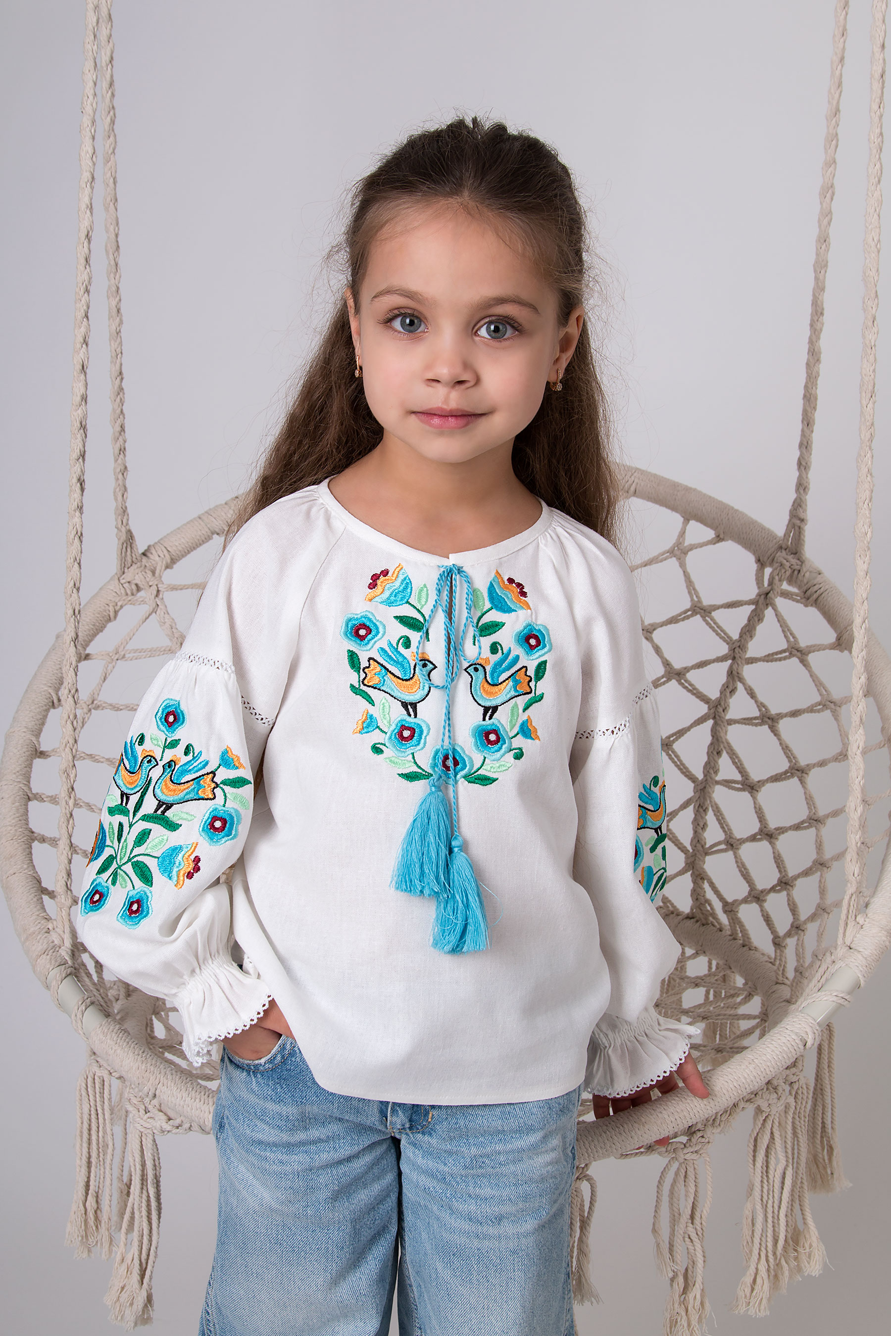 Вишиванка з льону, оздоблена яскравою вишивкою з мотивами птахів і квітів. Насичені відтінки вишивки надають виробу життєрадісного та святкового вигляду. Модель має зав’язки з китицями на горловині, а рукави й манжети прикрашені мережкою. Манжети з ніжною рюшею додають образу виразності та легкості. Стильне поєднання класики й сучасності — ідеальне для особливих подій.