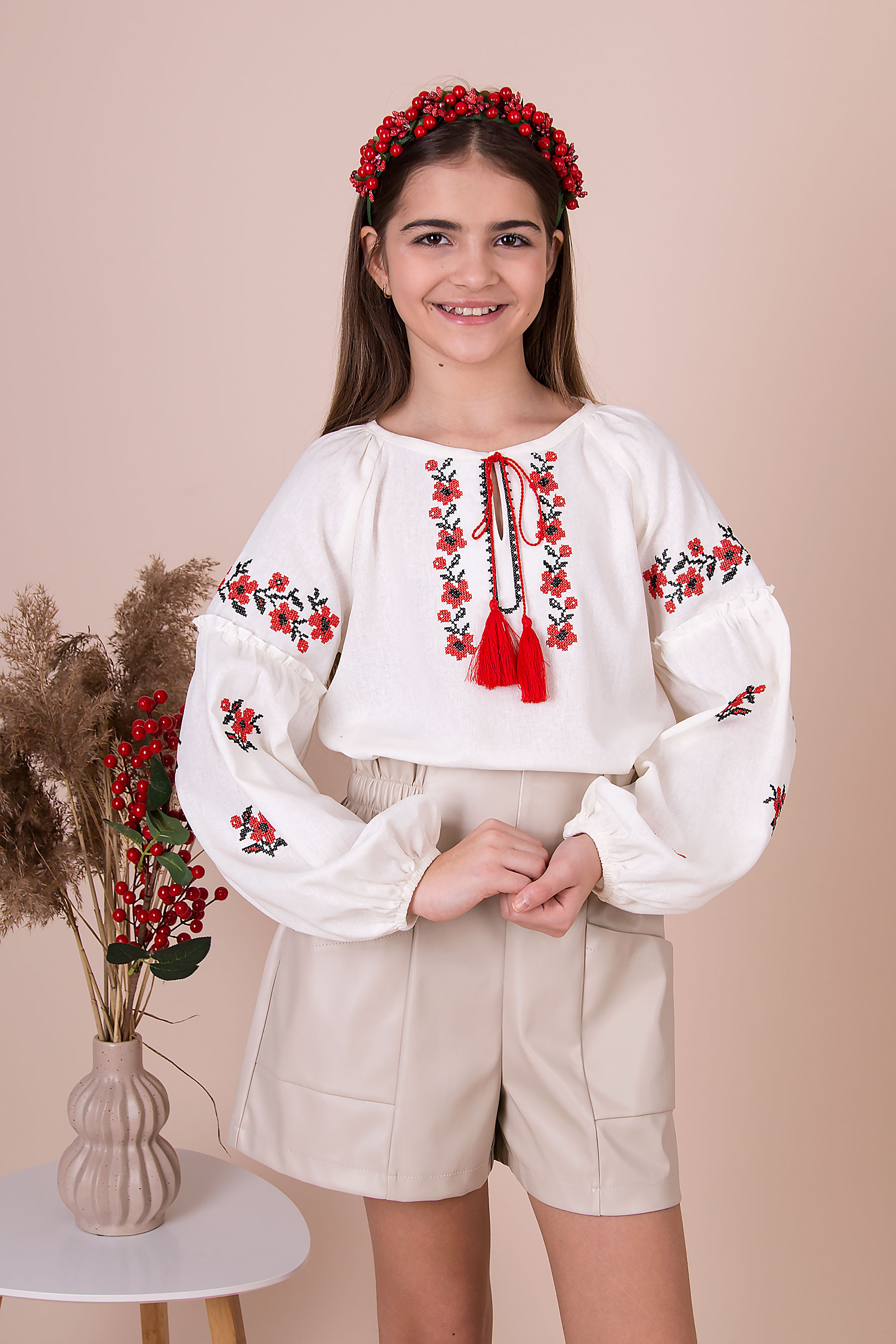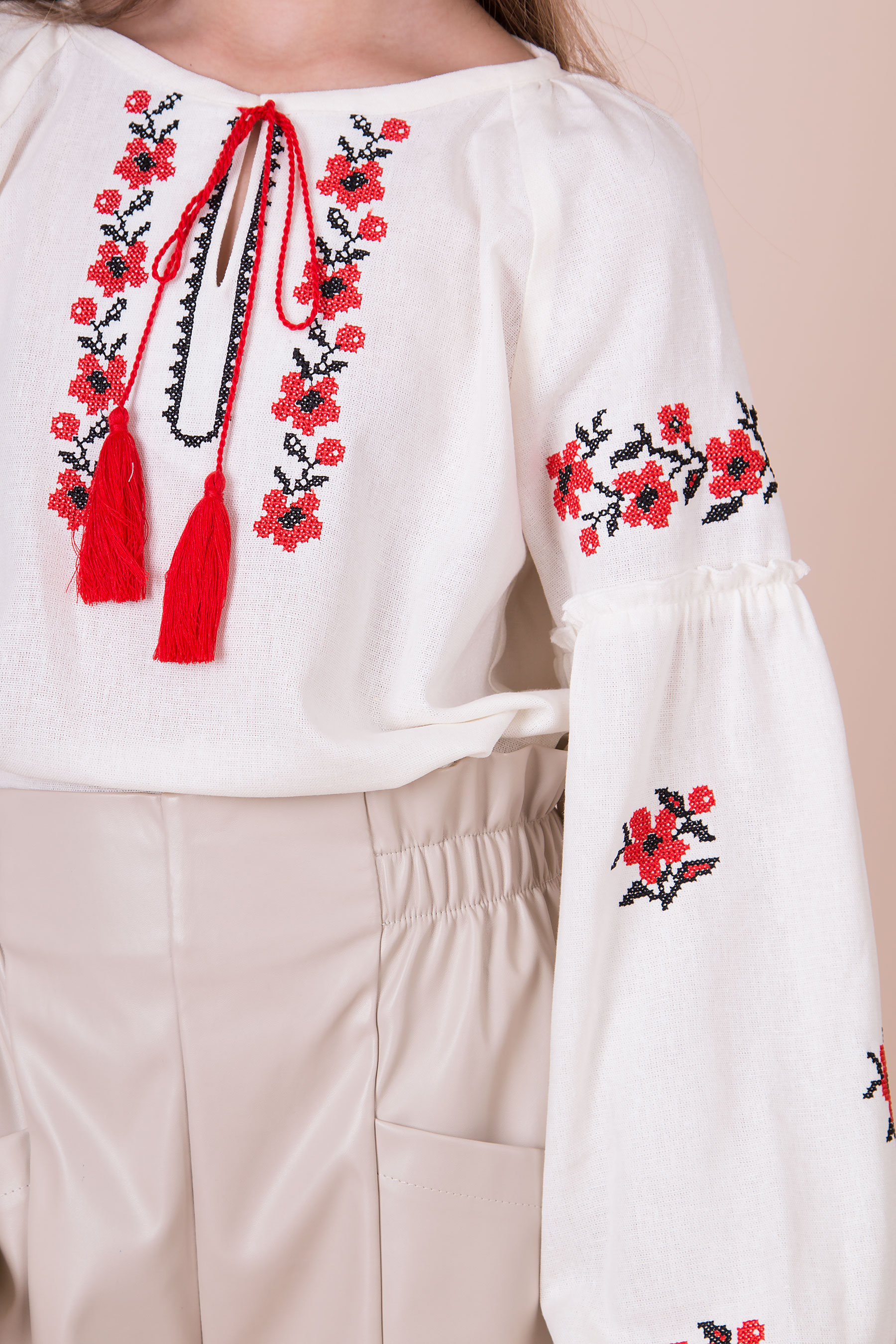Вишиванка з льону з квітковим орнаментом, що додає виробу автентичності. Горловина оздоблена китицями, які утворюють стильний акцент. Рукави зібрані на резинці, що забезпечує зручну посадку. Модель поєднує традиційний характер із сучасним дизайном, створюючи гармонійний образ.