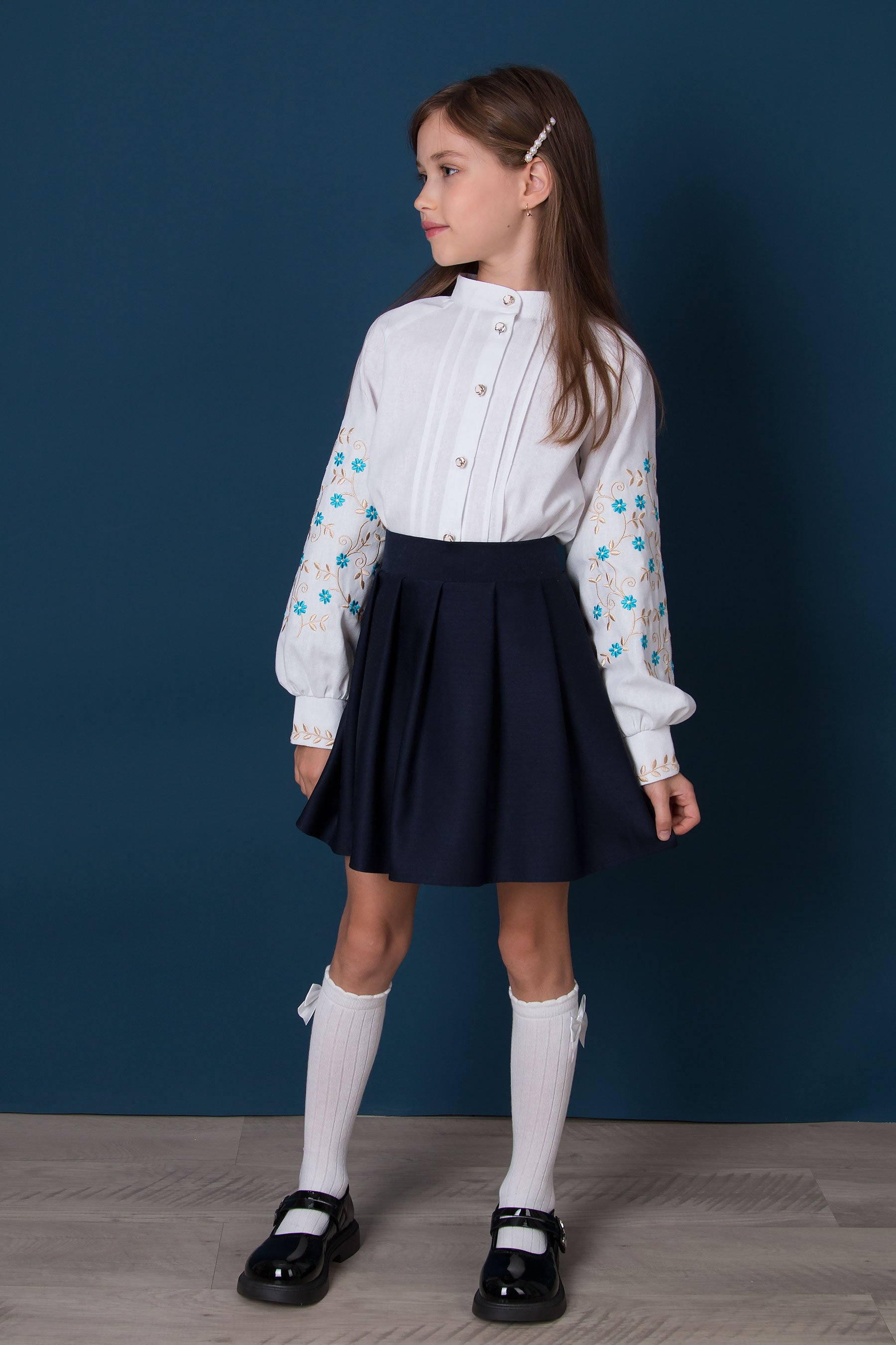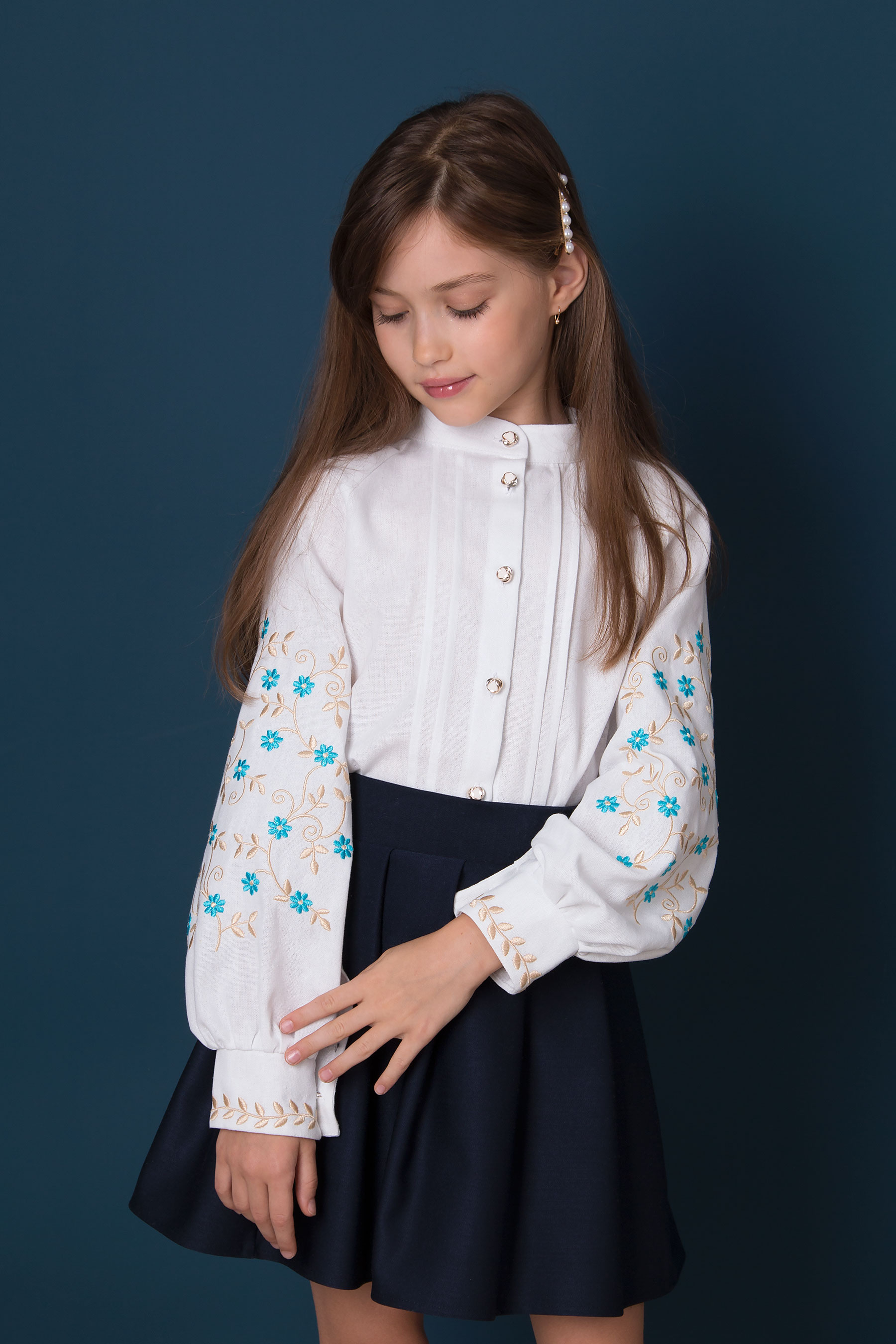 Дитяча вишиванка з льону з вишитими волошками на рукавах. Спереду модель оздоблена защіпами та застібкою на гудзики. Рукави декоровані ніжною вишивкою. Ідеальний вибір для школи чи урочистих подій.