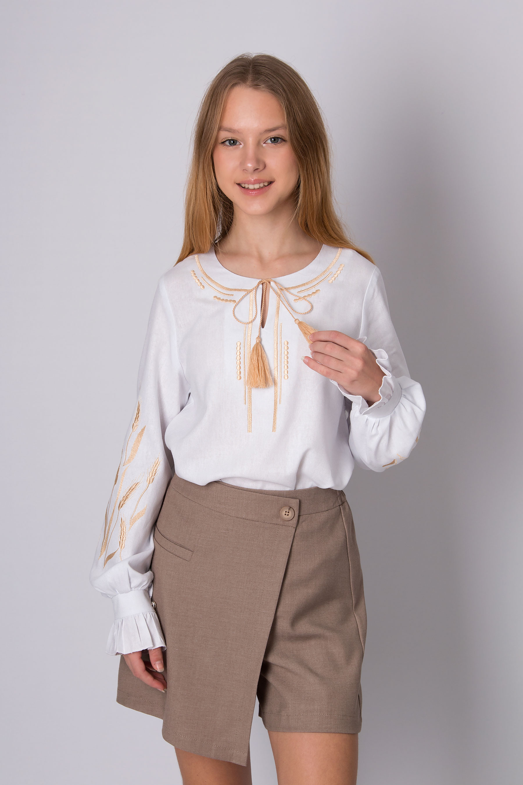 Вишиванка з льону — витончене поєднання традиційних мотивів і сучасного стилю. Рукави прикрашені вишивкою у вигляді колосків — традиційного українського символу достатку, родючості та єдності з природою. Горловина має зав’язки з китицями, які створюють м’який акцент. Стильна модель, що гармонійно поєднує природність і витончені національні деталі.
