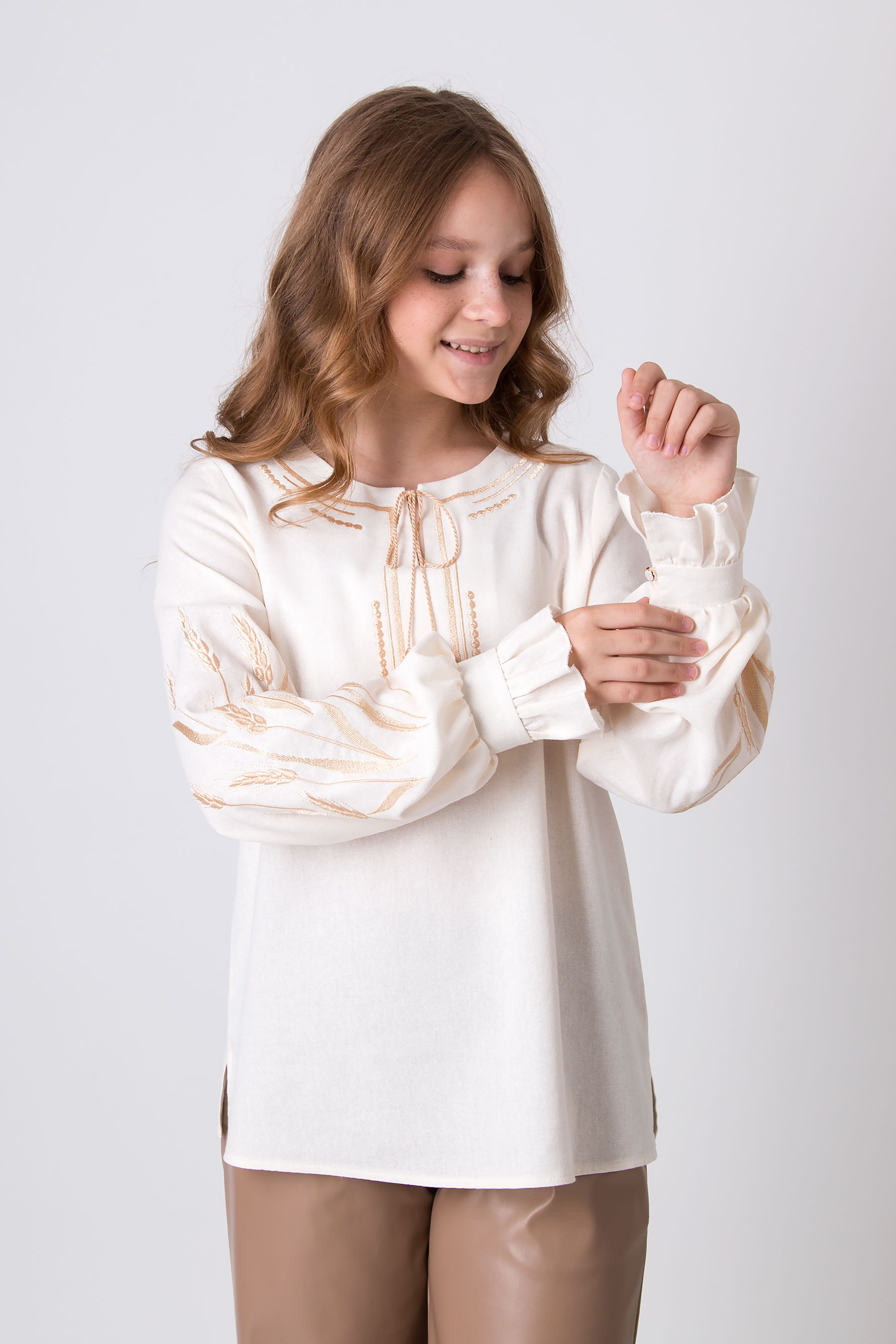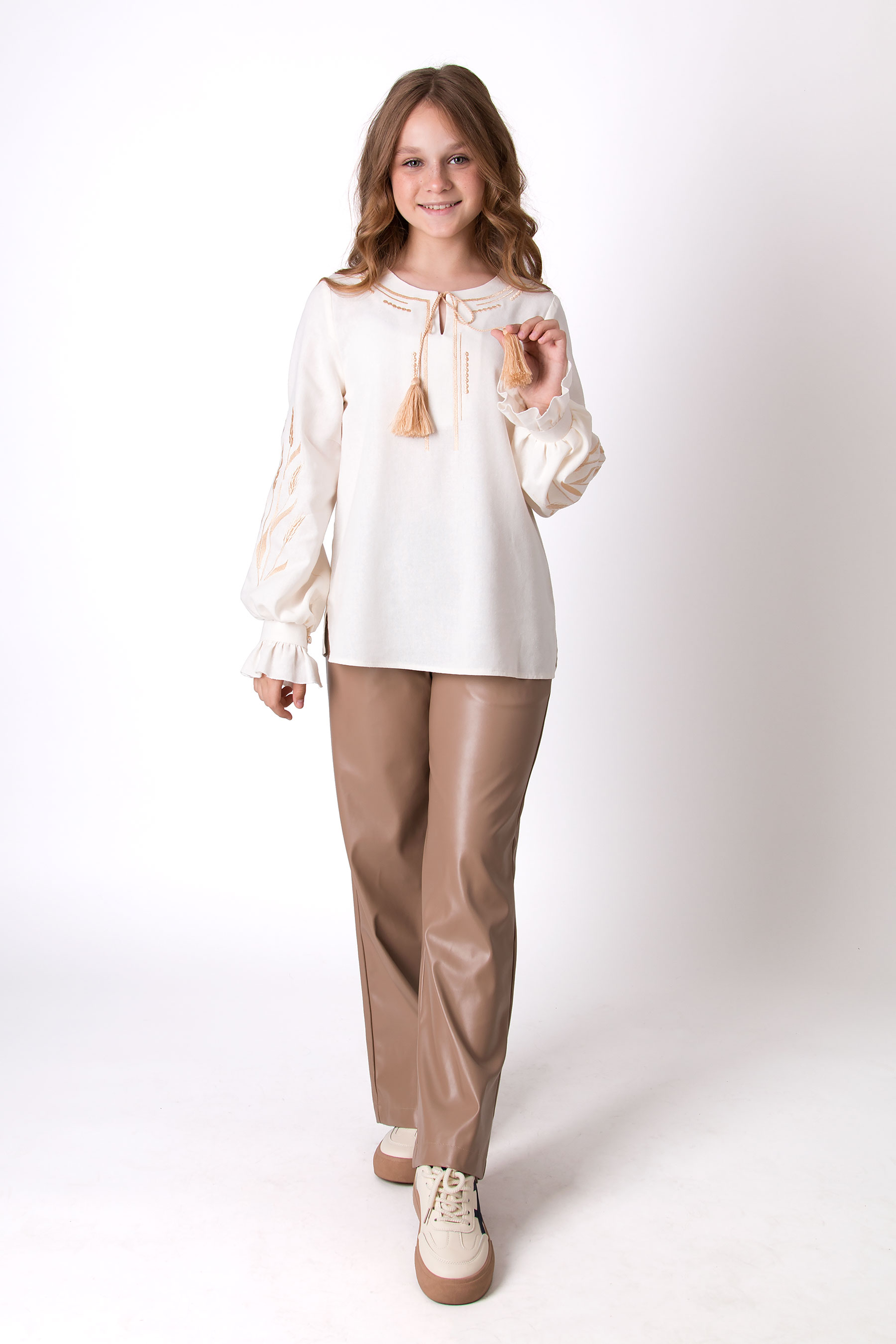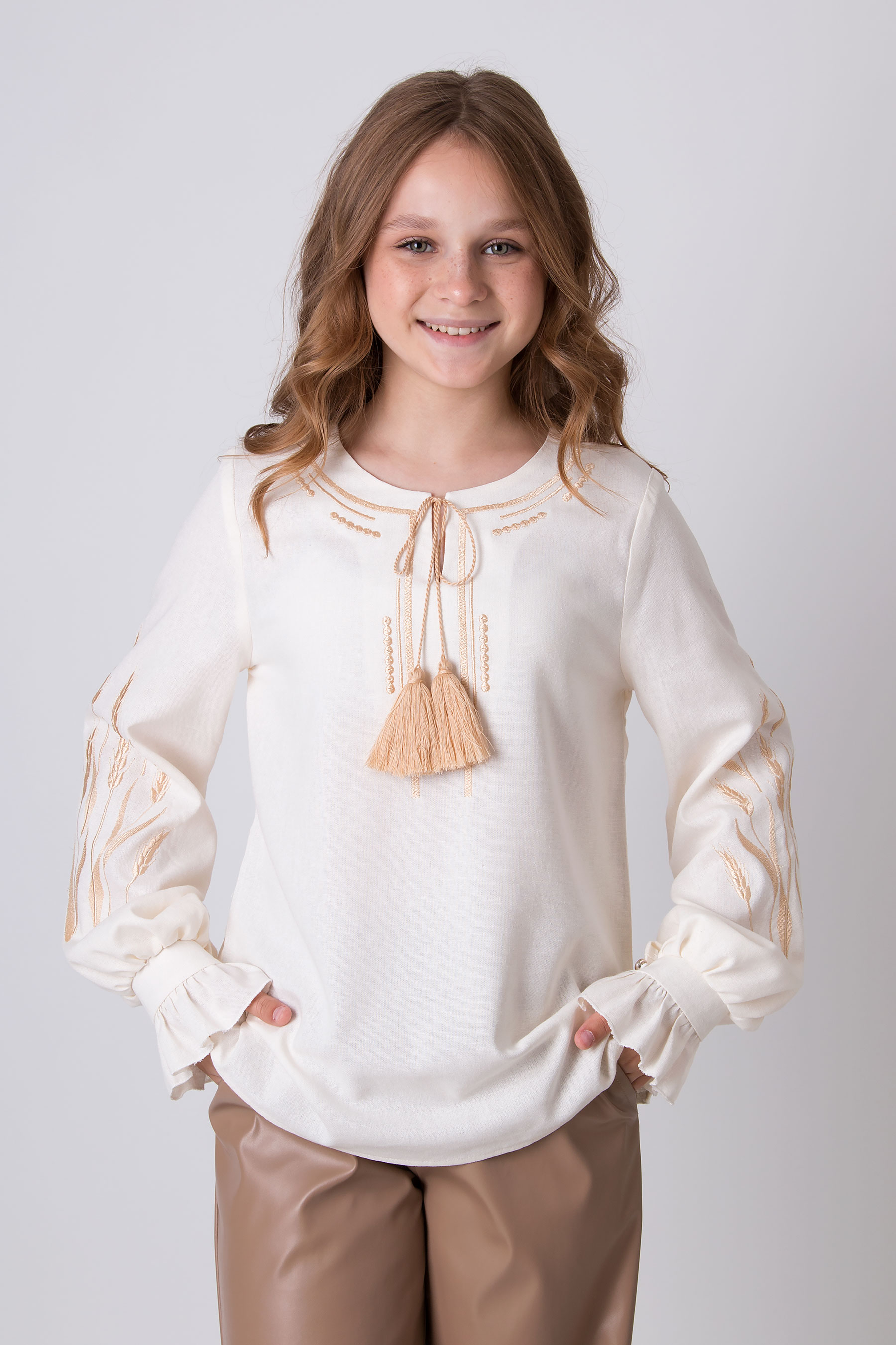 Вишиванка з льону — витончене поєднання традиційних мотивів і сучасного стилю. Рукави прикрашені вишивкою у вигляді колосків — традиційного українського символу достатку, родючості та єдності з природою. Горловина має зав’язки з китицями, які створюють м’який акцент. Стильна модель, що гармонійно поєднує природність і витончені національні деталі.
