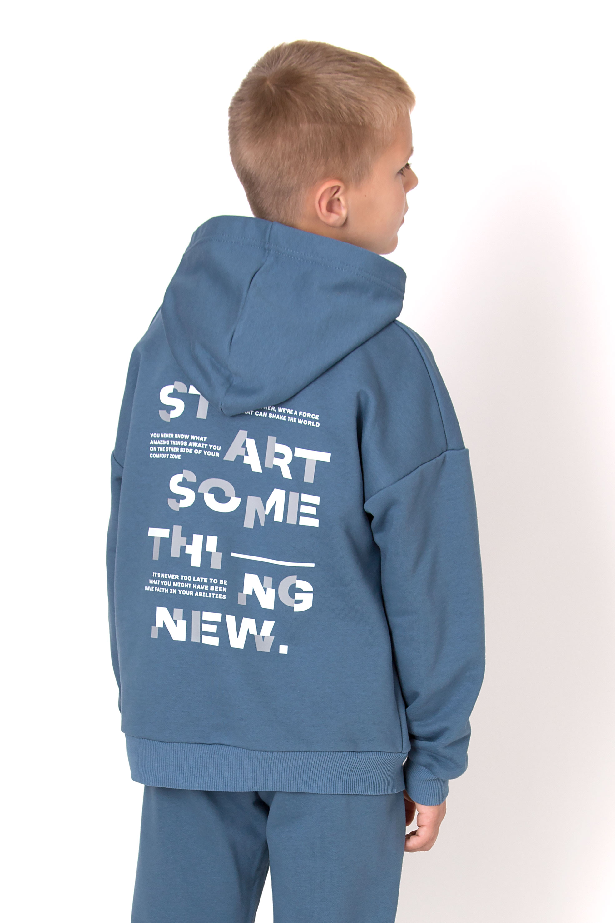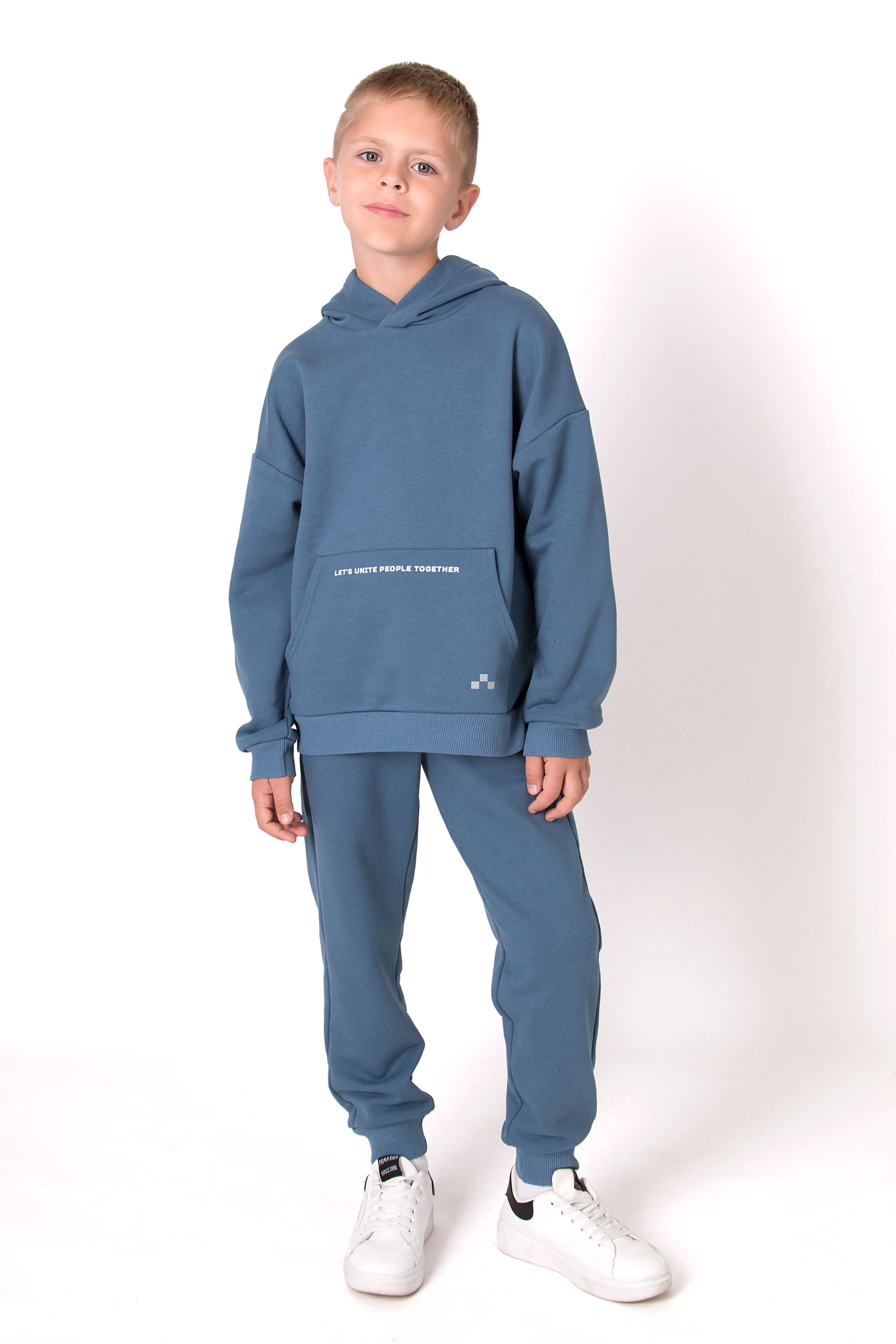 Костюм із трикотажу тринитки петлі. Худі з капюшоном і великою кишенею поєднується зі зручними штанами на манжетах. Тканина м’яка на дотик, а продуманий крій додає виробу зручності та сучасного вигляду. Яскравий акцент — принт на спині у графічному стилі з мотиваційним написом, що створює динамічний настрій.