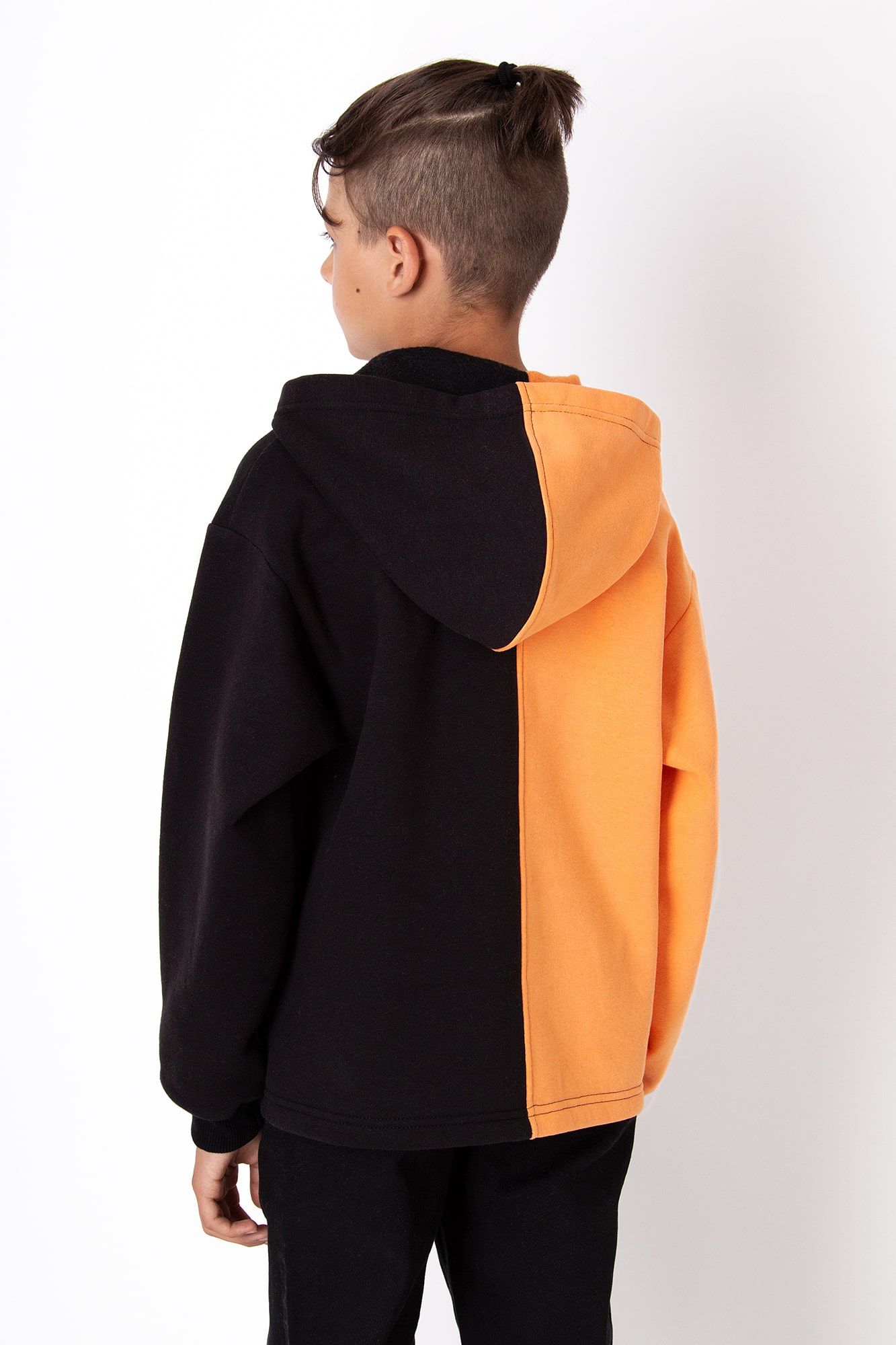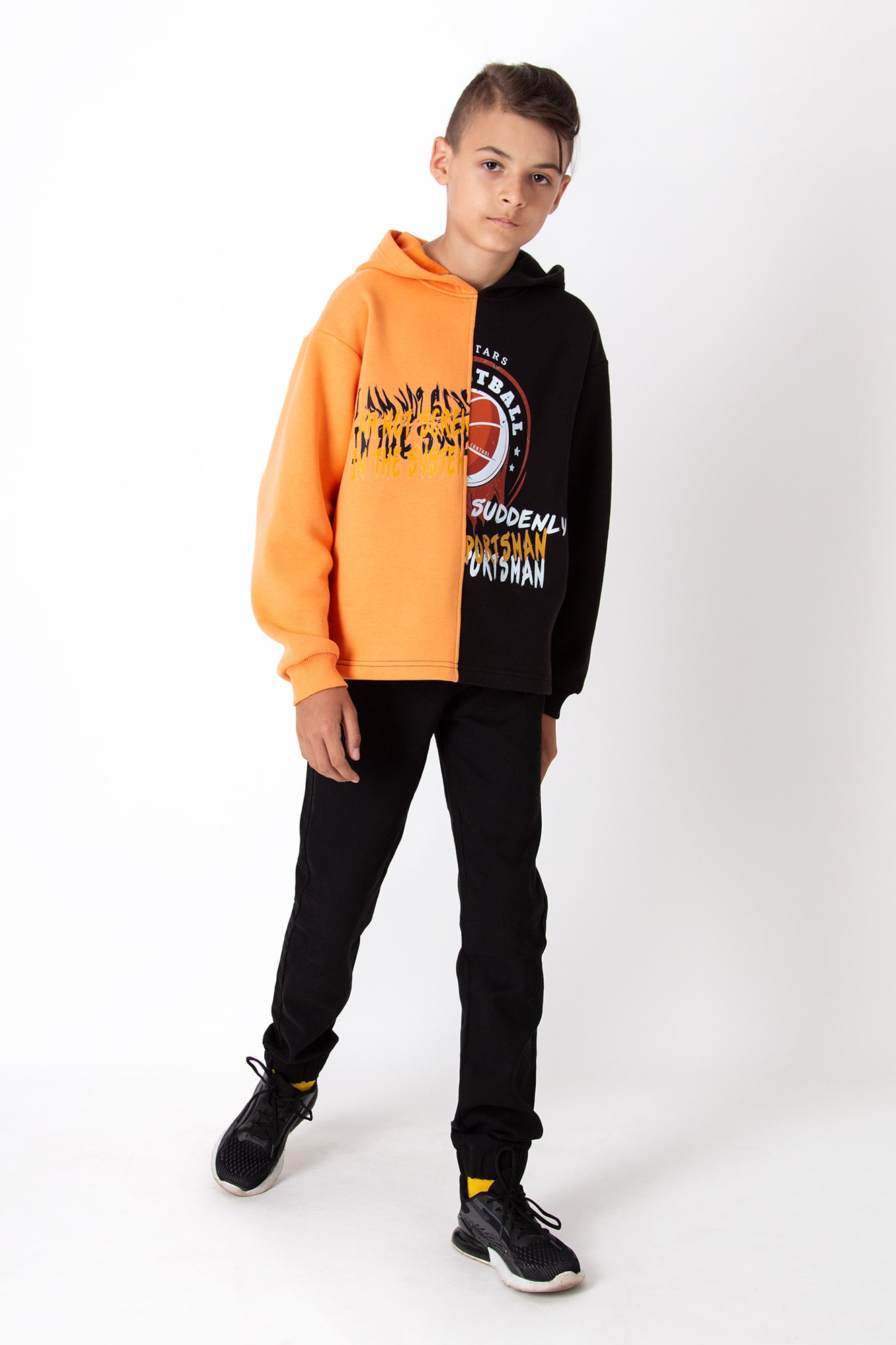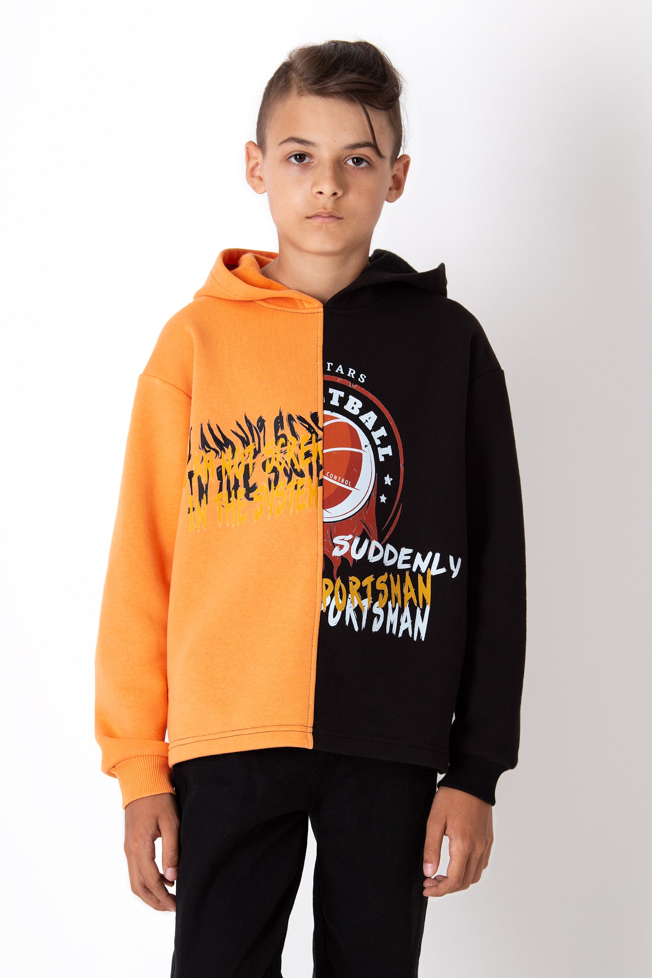 Оригінальне худі з ефектом контрастного поділу створює яскравий образ. Кольорові блоки та великі принти надають виробу динаміки й характеру. Капюшон і зручна посадка роблять модель практичною.