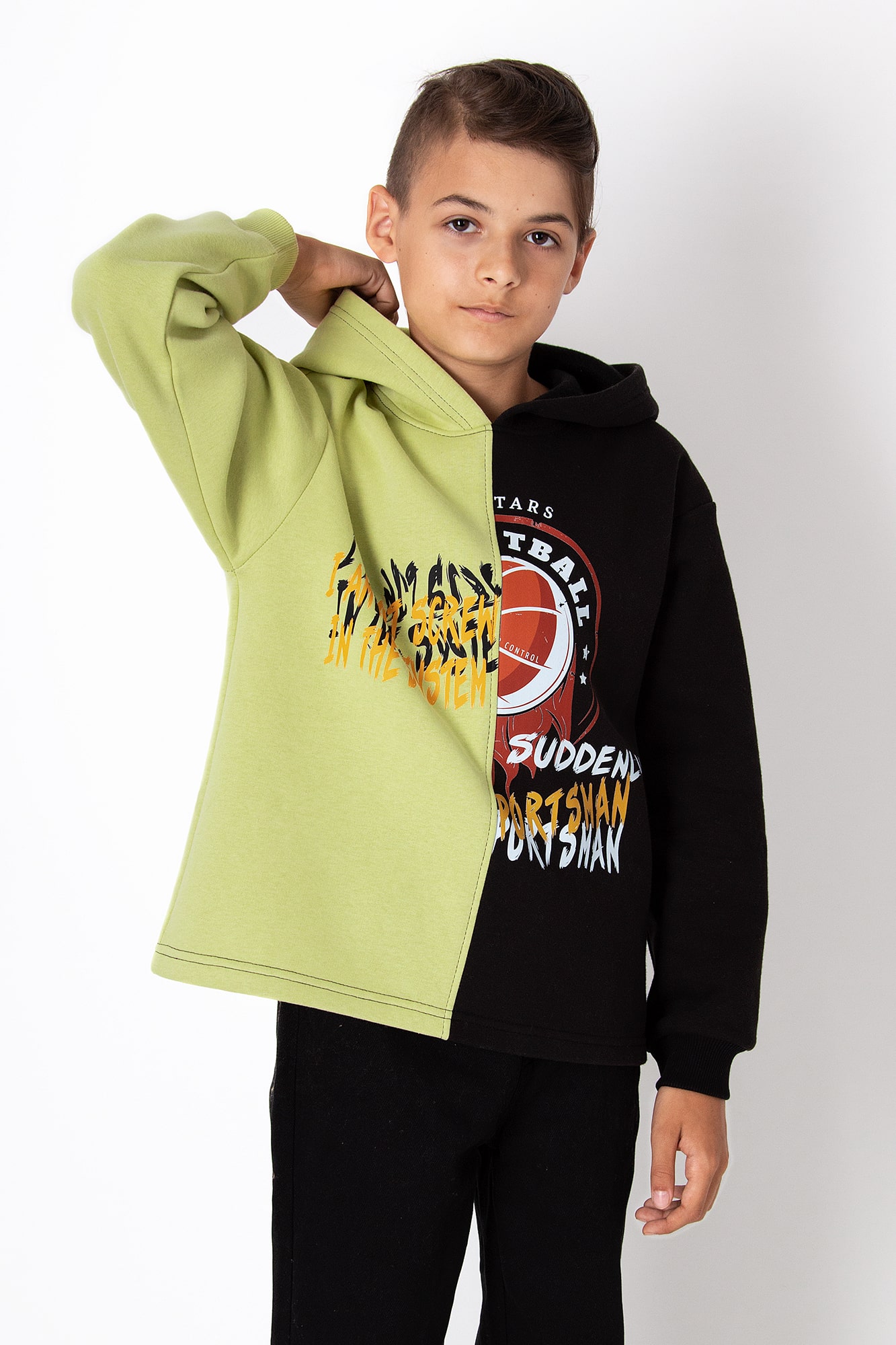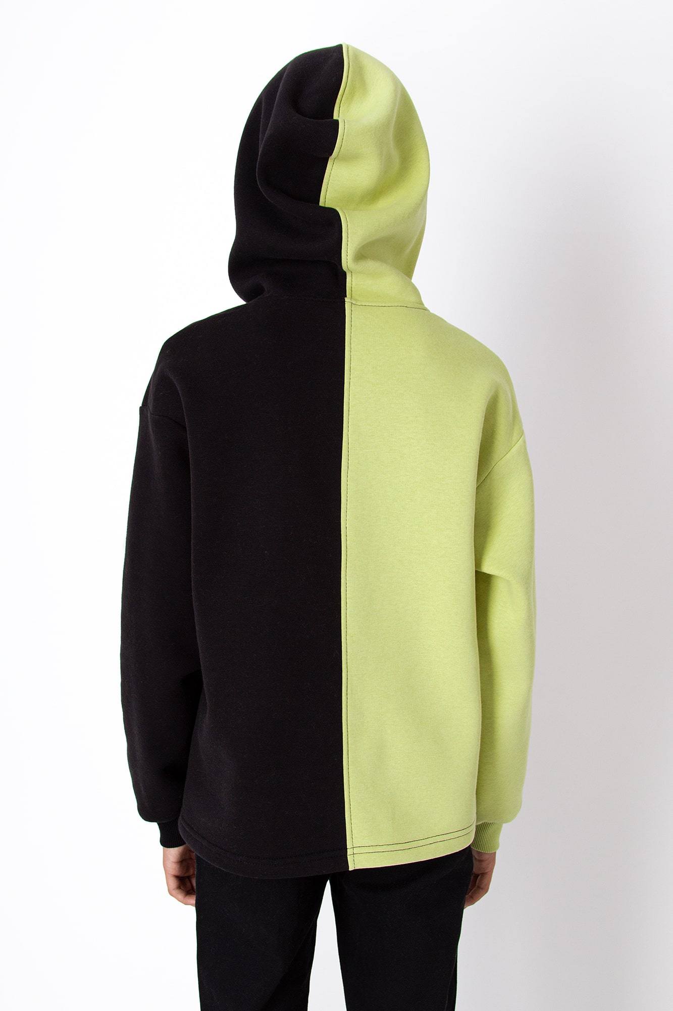 Оригінальне худі з ефектом контрастного поділу створює яскравий образ. Кольорові блоки та великі принти надають виробу динаміки й характеру. Капюшон і зручна посадка роблять модель практичною.