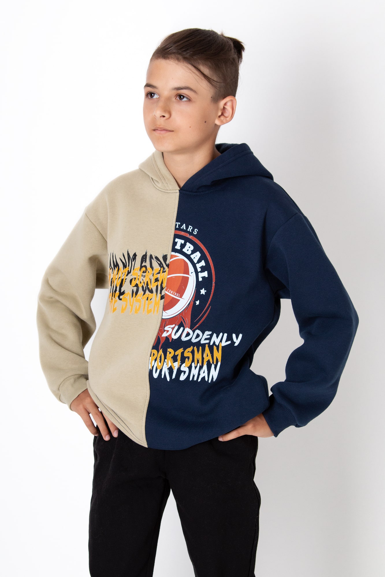 Оригінальне худі з ефектом контрастного поділу створює яскравий образ. Кольорові блоки та великі принти надають виробу динаміки й характеру. Капюшон і зручна посадка роблять модель практичною.