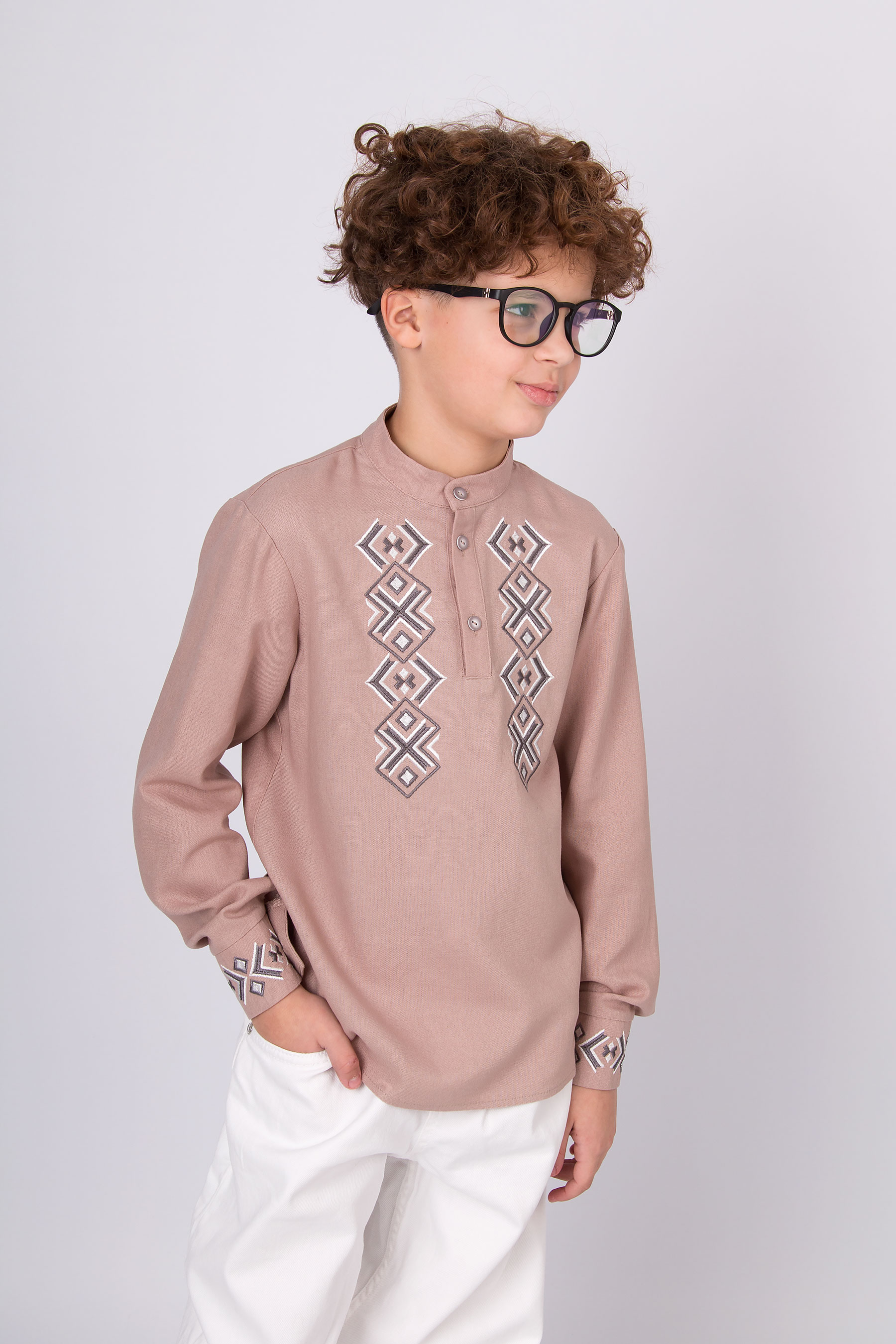 Вишиванка з льону з геометричною вишивкою. Має застібку на гудзики спереду й на манжетах. Поєднує сучасний крій і традиційні українські мотиви.