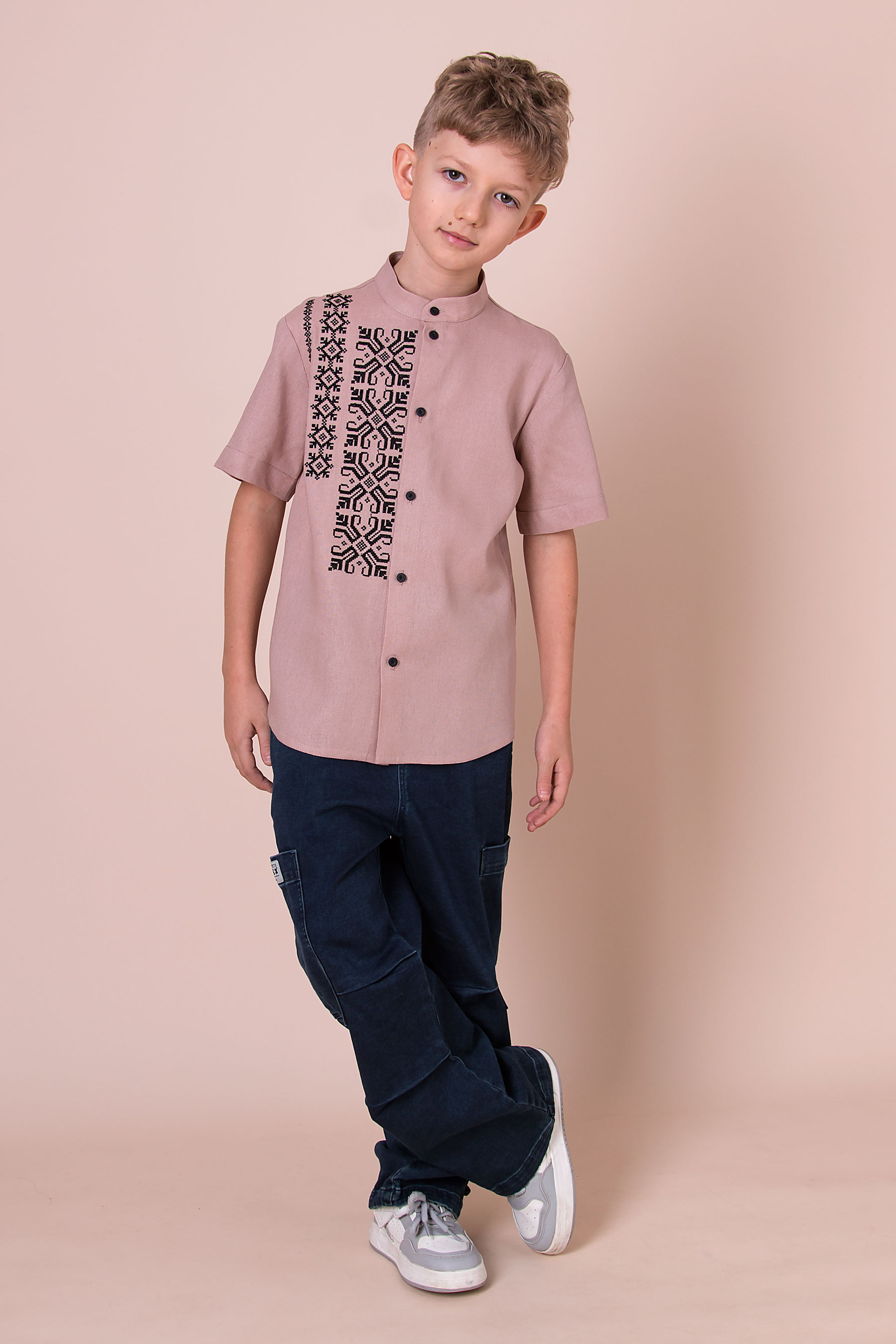 Модель із коротким рукавом і застібкою на гудзики вдало поєднує традиційні елементи з сучасним силуетом. Контрастна вишивка додає характеру, роблячи виріб доречним і для свят, і для щоденних образів.