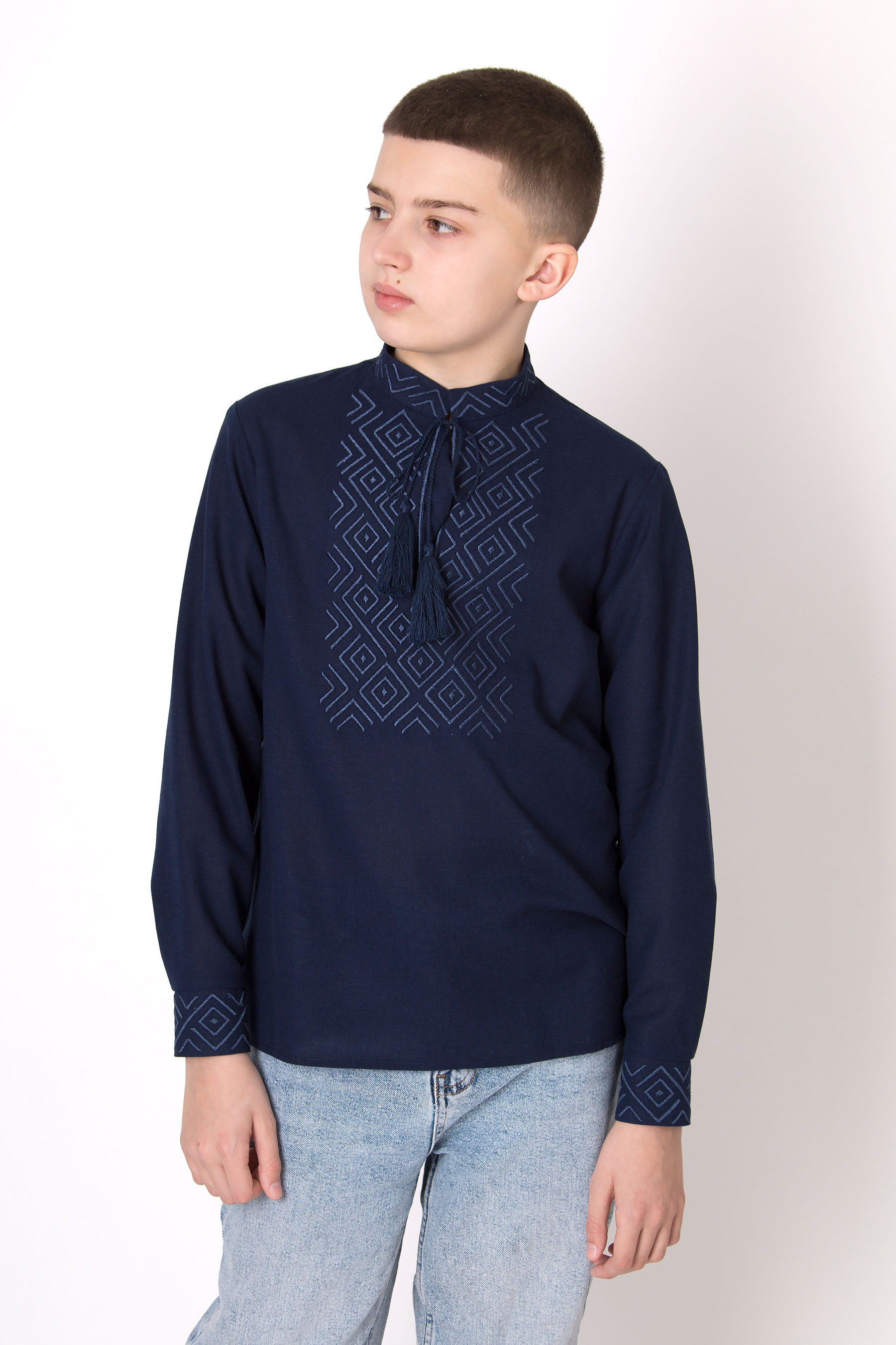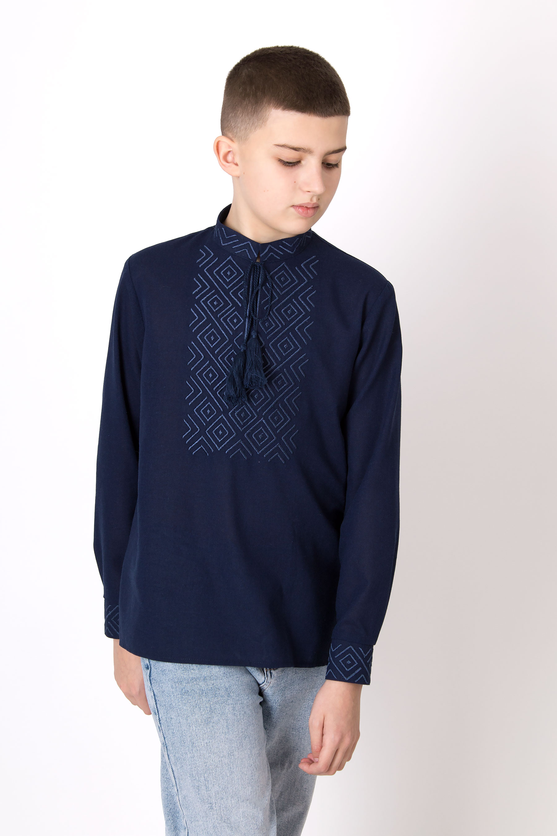 Вишиванка з льону, спереду оформлена геометричною вишивкою в тон тканини, яка створює стриманий і стильний акцент. Має розріз із зав’язками та невисоку стійку, які гарно підкреслюють традиційний силует.Ідеальний вибір для урочистих подій.