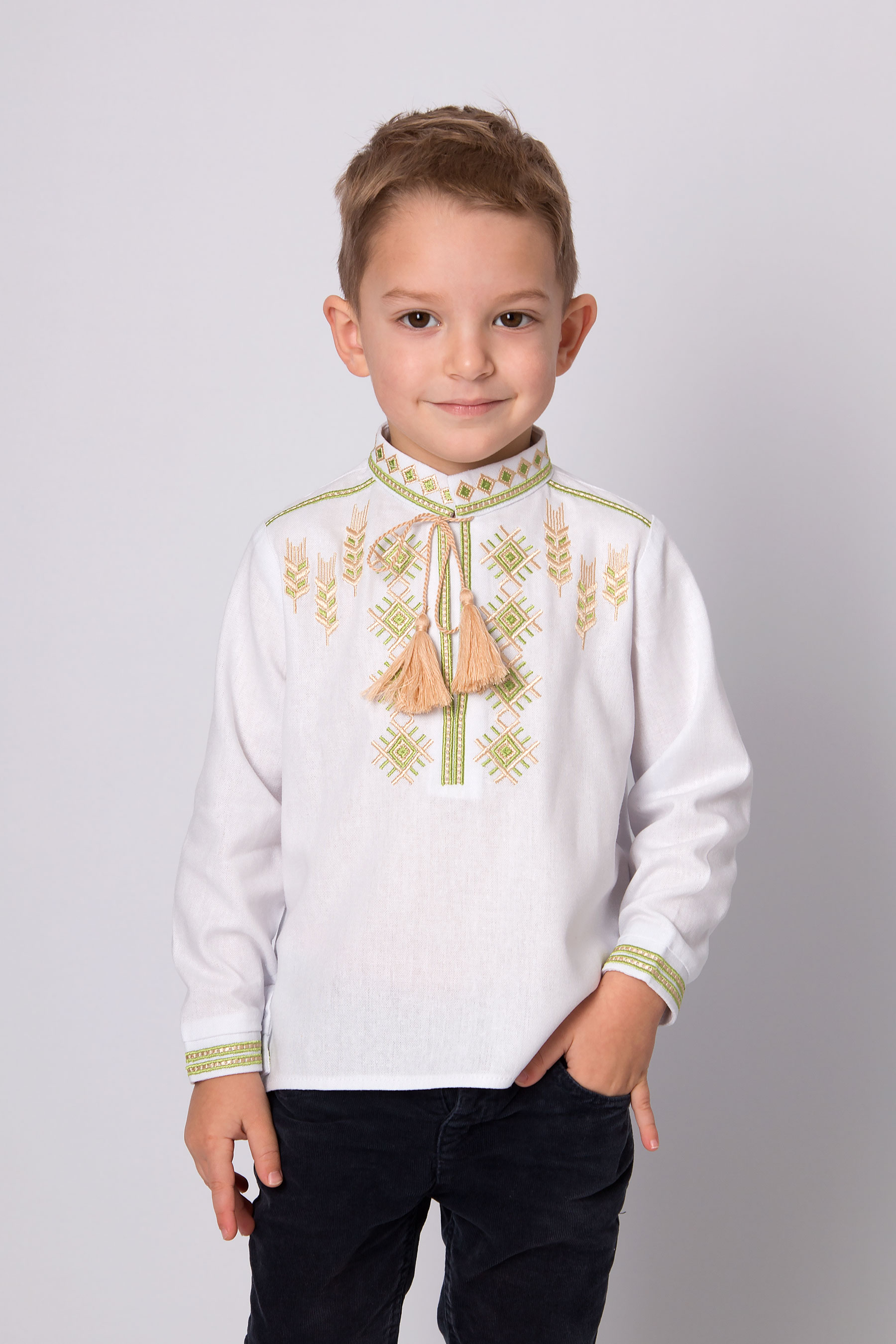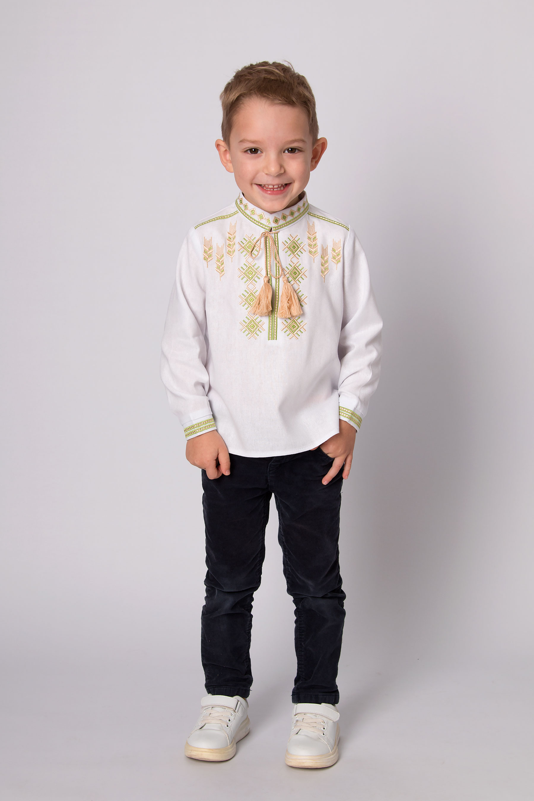 Дитяча вишиванка для хлопчика з орнаментом колосків, прямий крій, довгий рукав, комір-стійка з завʼязками-китицями.