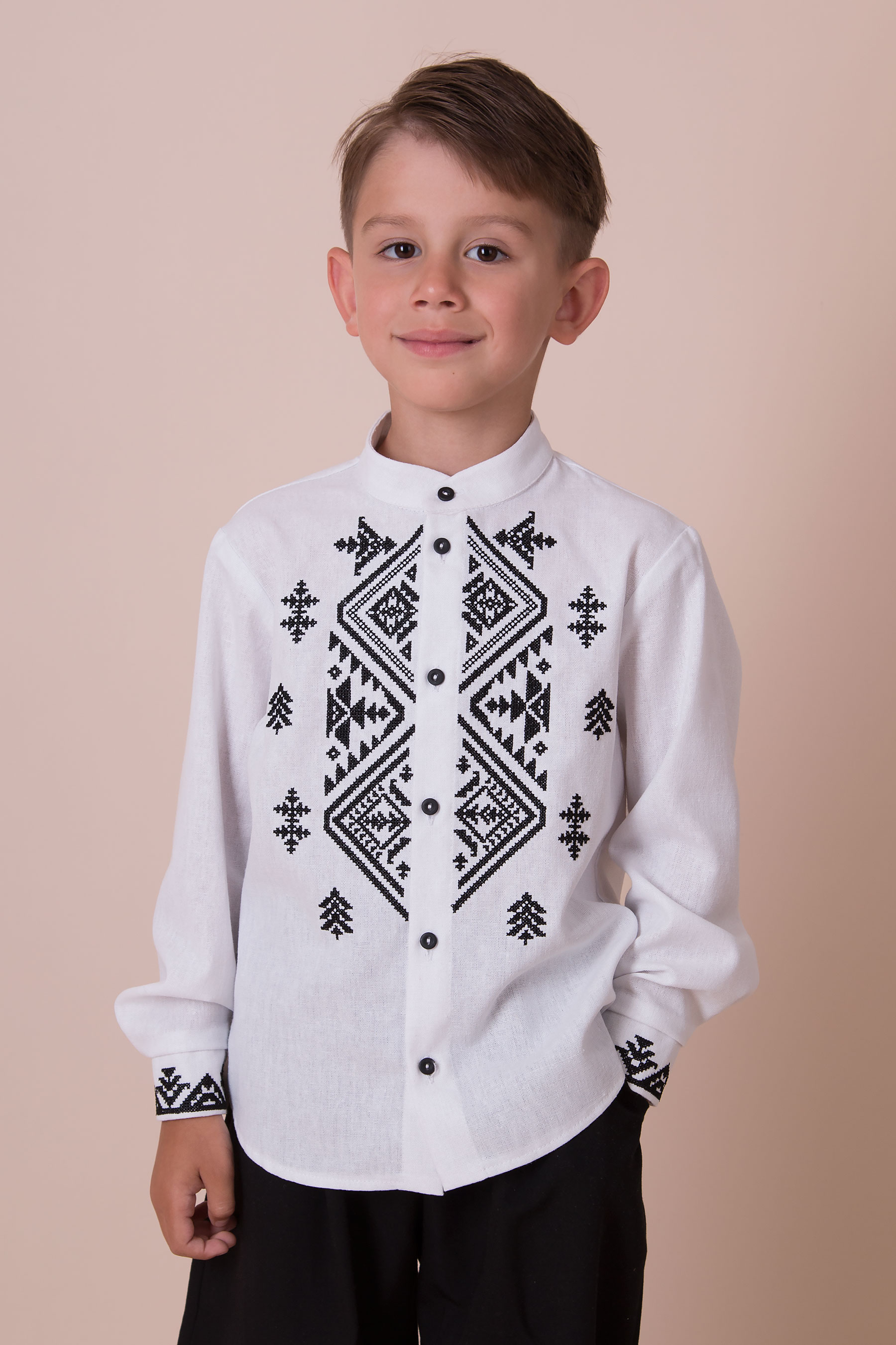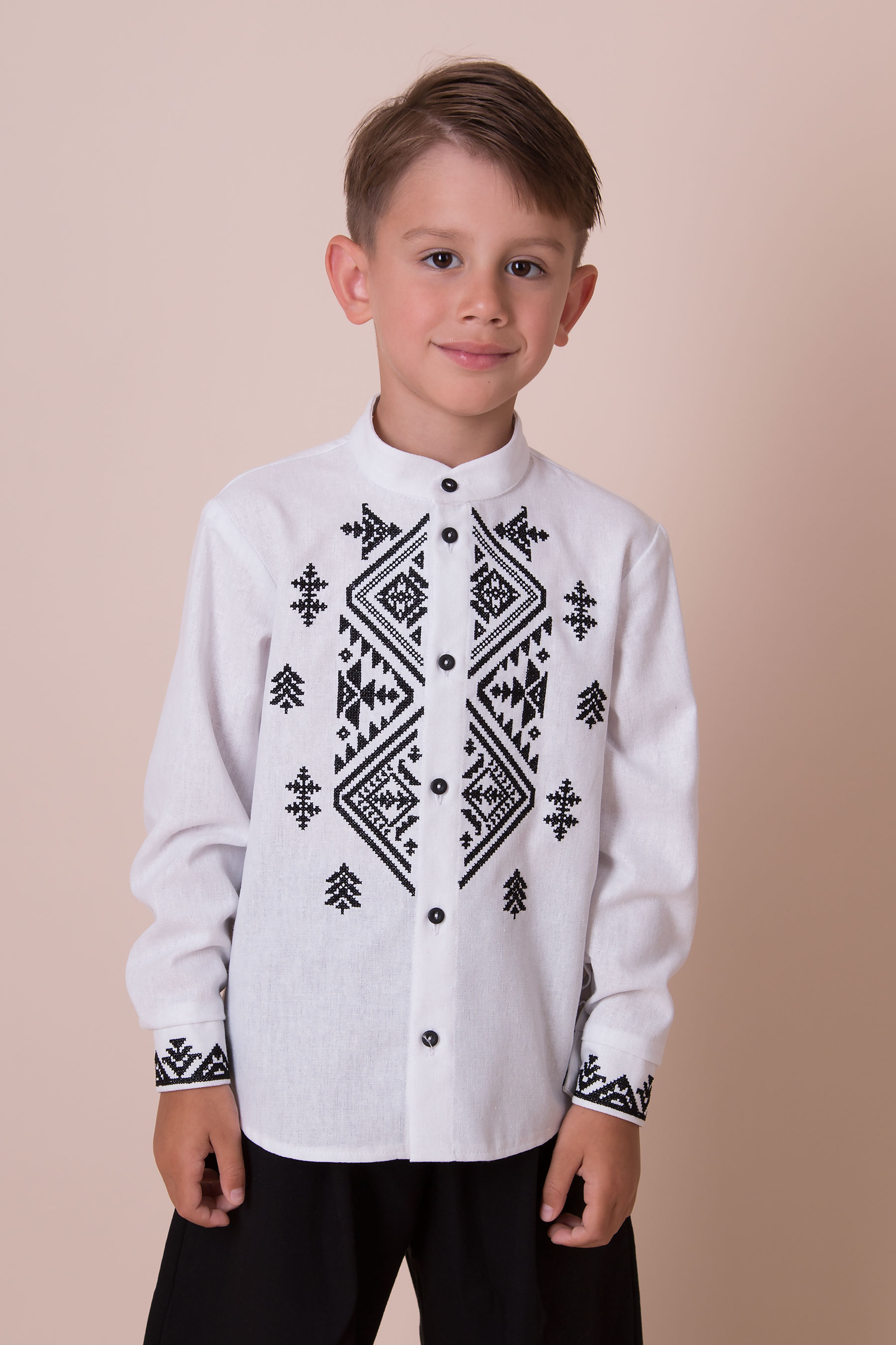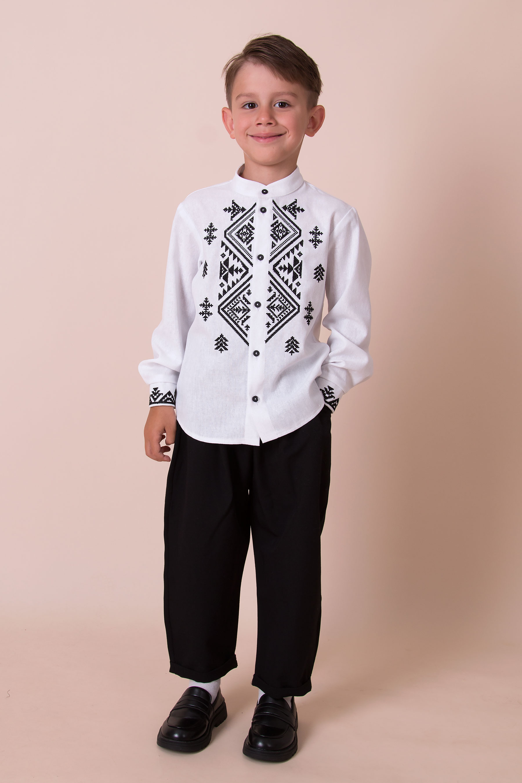 Вишиванка з льону з контрастною вишивкою, натхненною українськими символами сили, гармонії та традицій. Класичний прямий крій із комірцем-стійкою та манжетами на гудзиках. Геометричний орнамент додає виробу виразності, а стримане поєднання кольорів робить образ сучасним. Підходить як для свят, так і для повсякденного одягу.