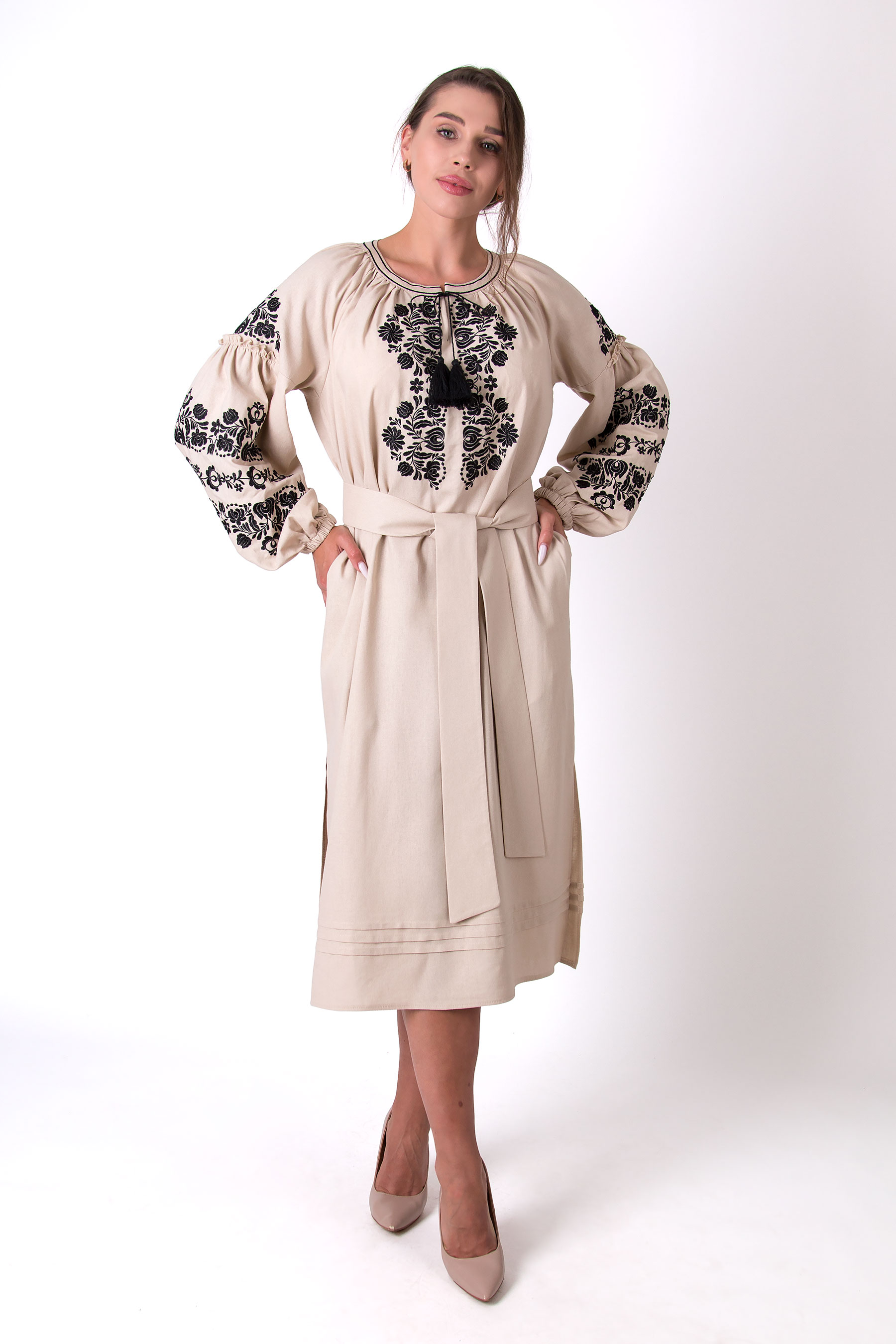 Лляна жіноча вишита сукня вільного крою з акцентом на традиційний силует і сучасні деталі. Перед і рукави сукні оздоблені витонченою квітковою машинною вишивкою у техніці гладь, що надає образу ніжності та виразності. Горловина доповнена розрізом із зав’язками-китицями, які підкреслюють автентичний характер моделі. Рукави об’ємні, з легкою зборкою та еластичними манжетами по низу. Сукня має міді довжину, прямий крій і знімний пояс, що дозволяє регулювати посадку по талії.