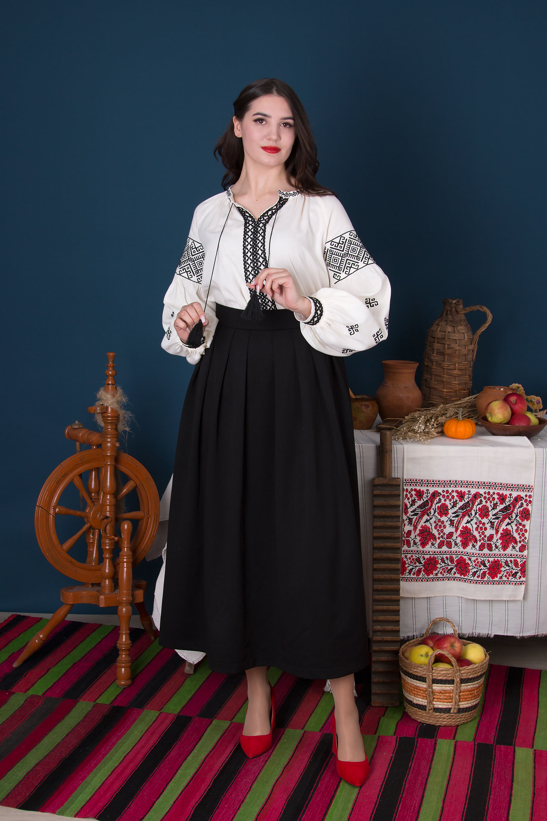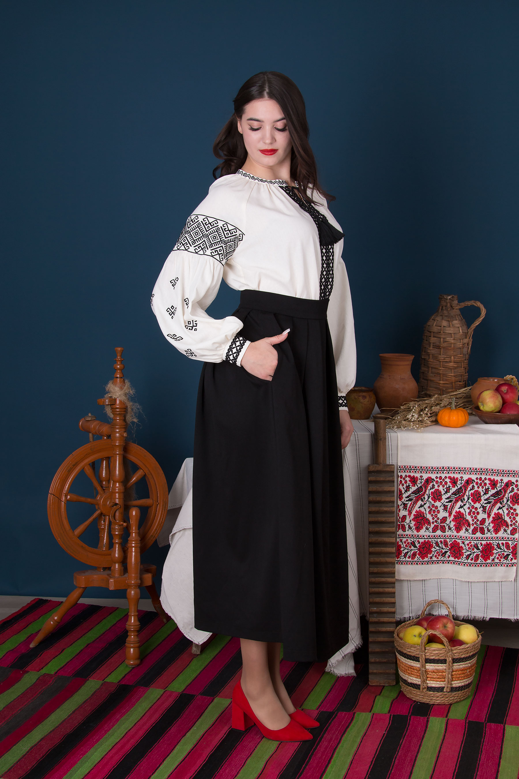 Лляна жіноча вишиванка з контрастною вишивкою. Тканина легка, приємна до тіла і підходить на будь-який сезон. Модель має об’ємні рукави з манжетами та зав’язка на китиці. Вишивка додає виробу національного характеру, але виглядає стримано і елегантно. Модель легко комбінується з брюками чи спідницями, підходить для роботи, свят та щоденних образів. Універсальна та стильна річ, яка поєднує традиції і сучасність.