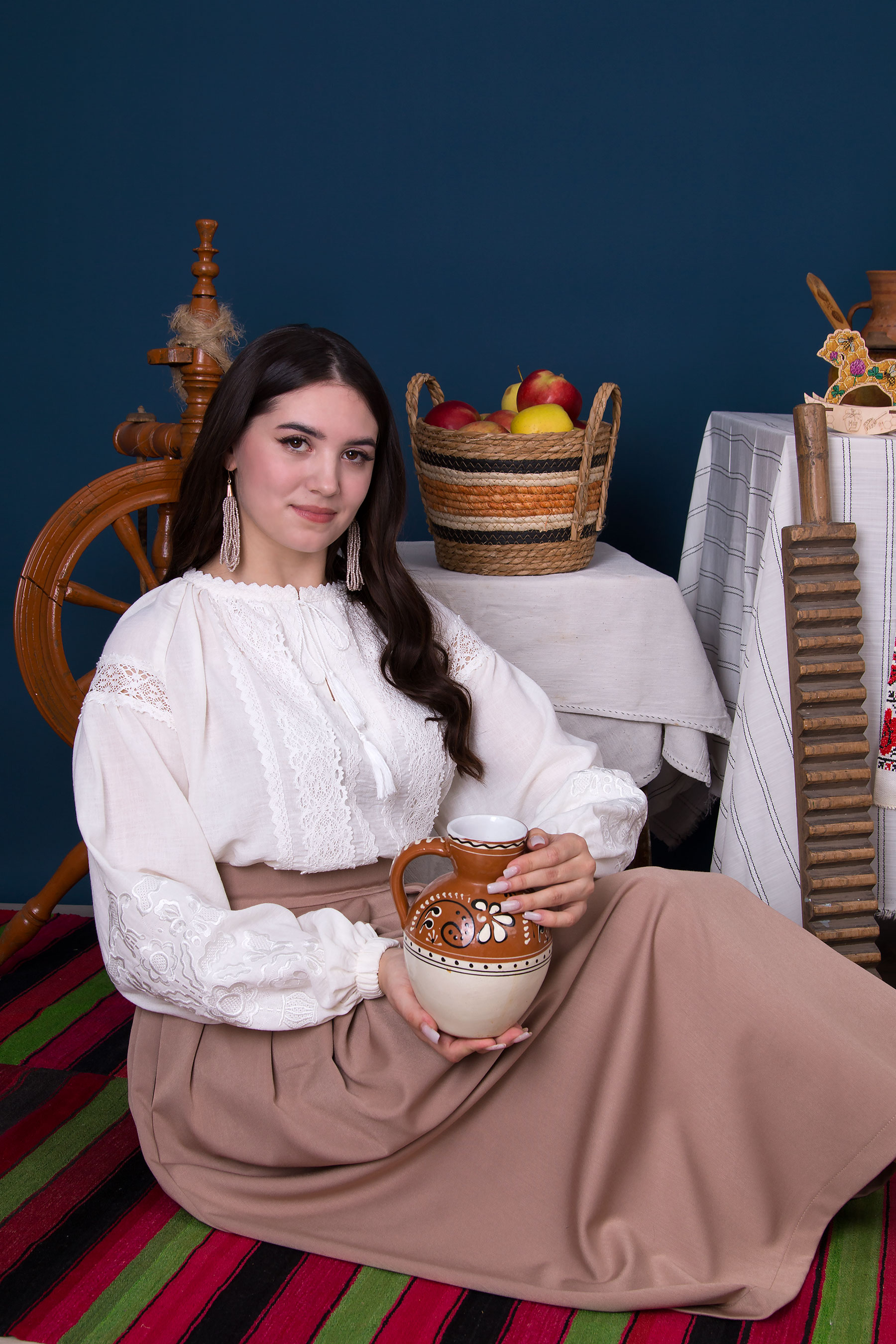 Лляна вишиванка з ніжною вишивкою по білому та мереживними вставками. Модель має об’ємні рукави з манжетами та зав’язки з китицями, що додають жіночності. Вишукана й водночас ніжна — ідеальна для подій, де хочеться виглядати особливо красиво.